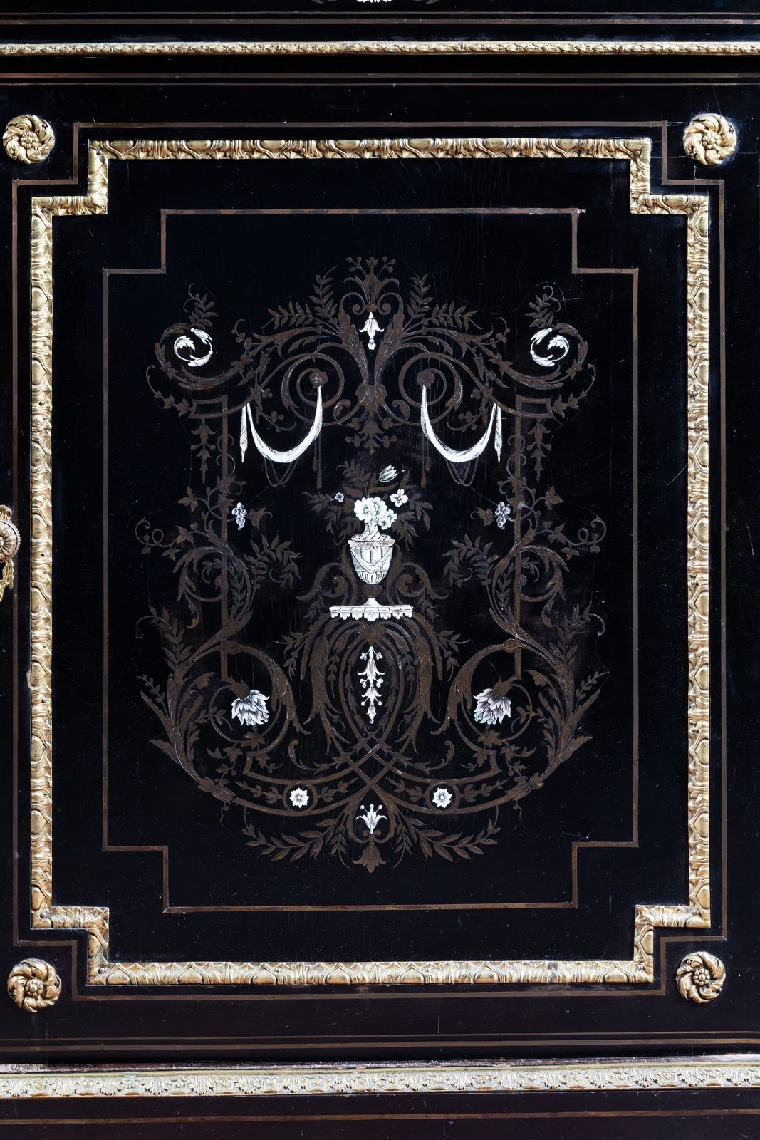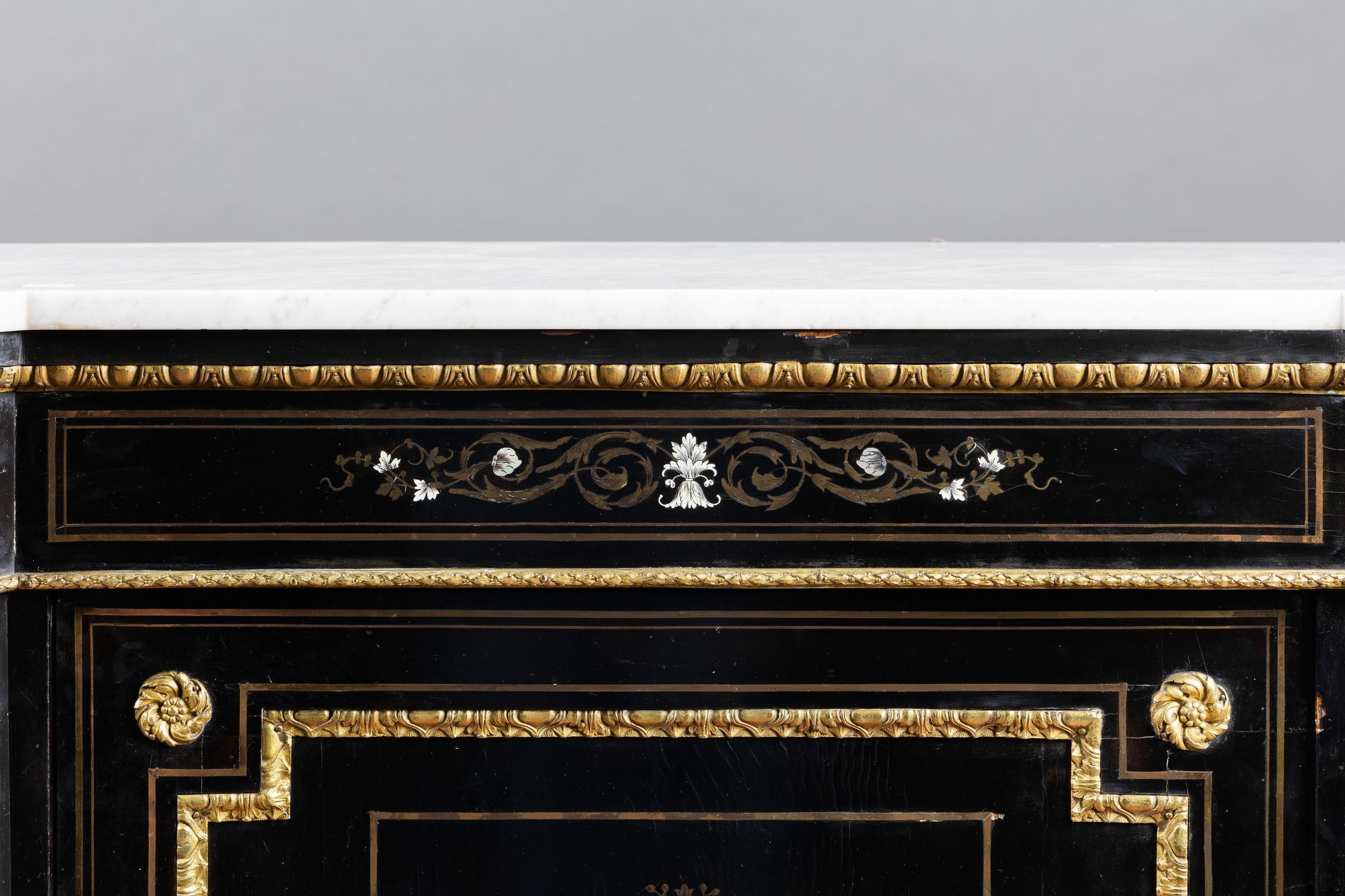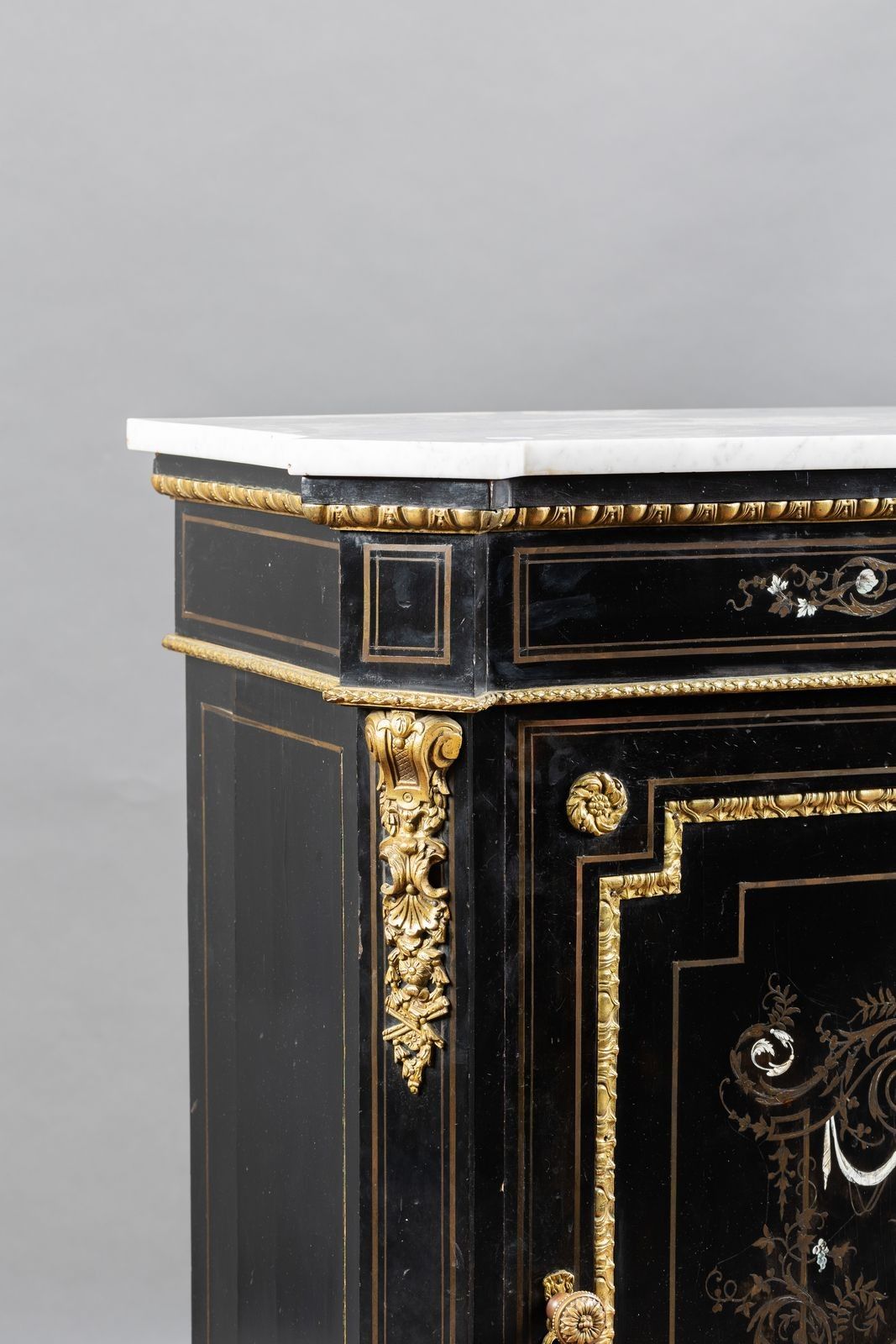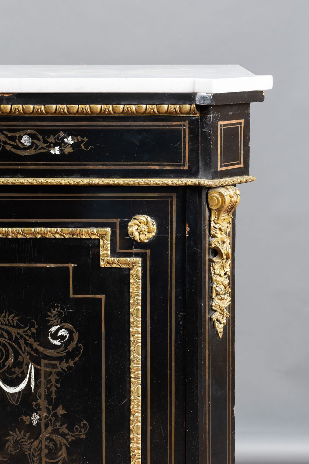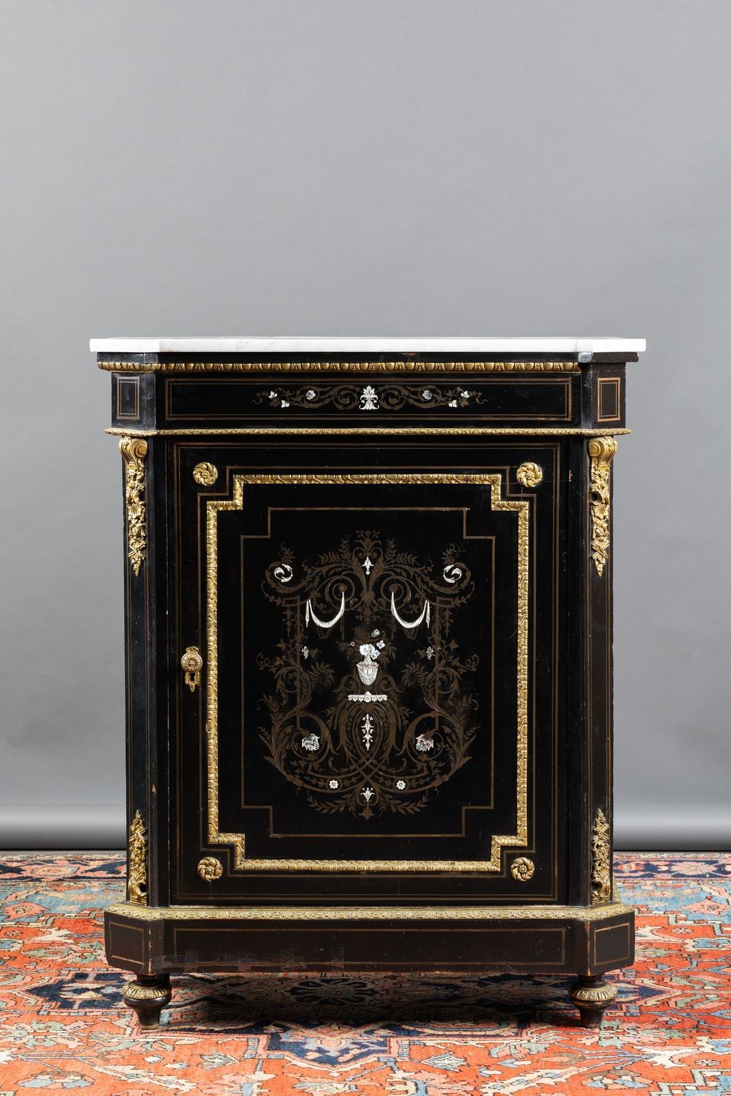 Blackened wood and inlaid with mother-of-pearl, engraved brass and white composite material depicting a flowering vase, foliage and drapery. It opens to a door, with wide-panelled jambs resting on toupie feet. Grey veined white marble top - Napoleon III period (missing lock, cracks)