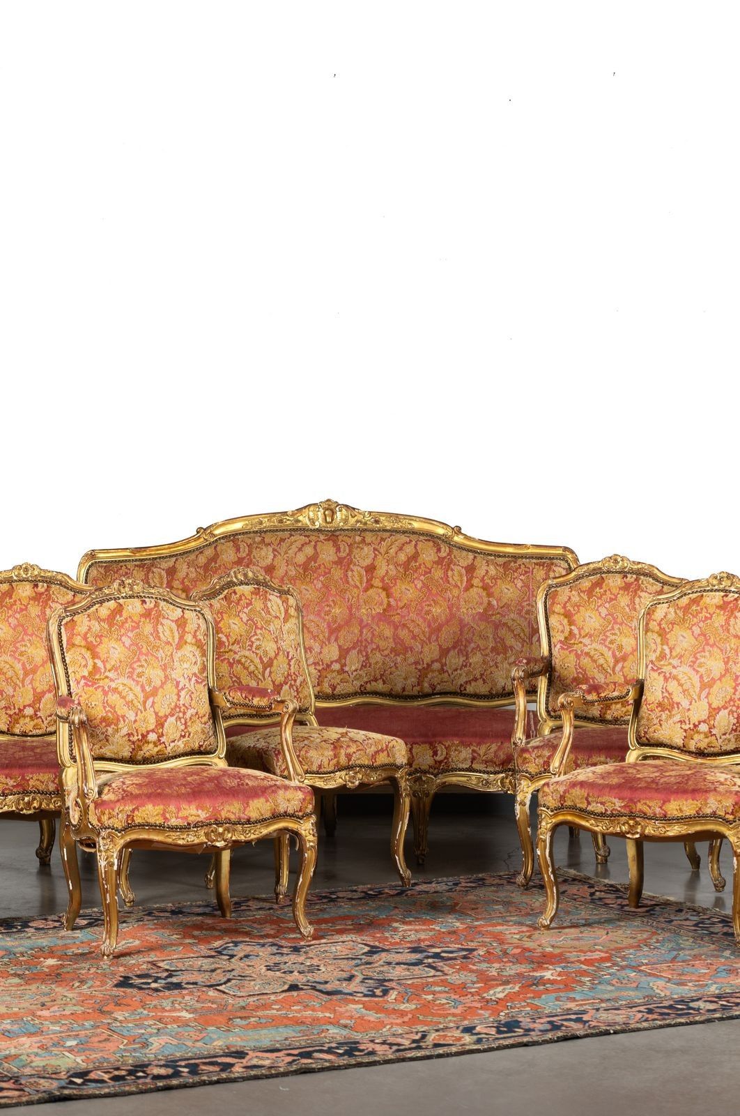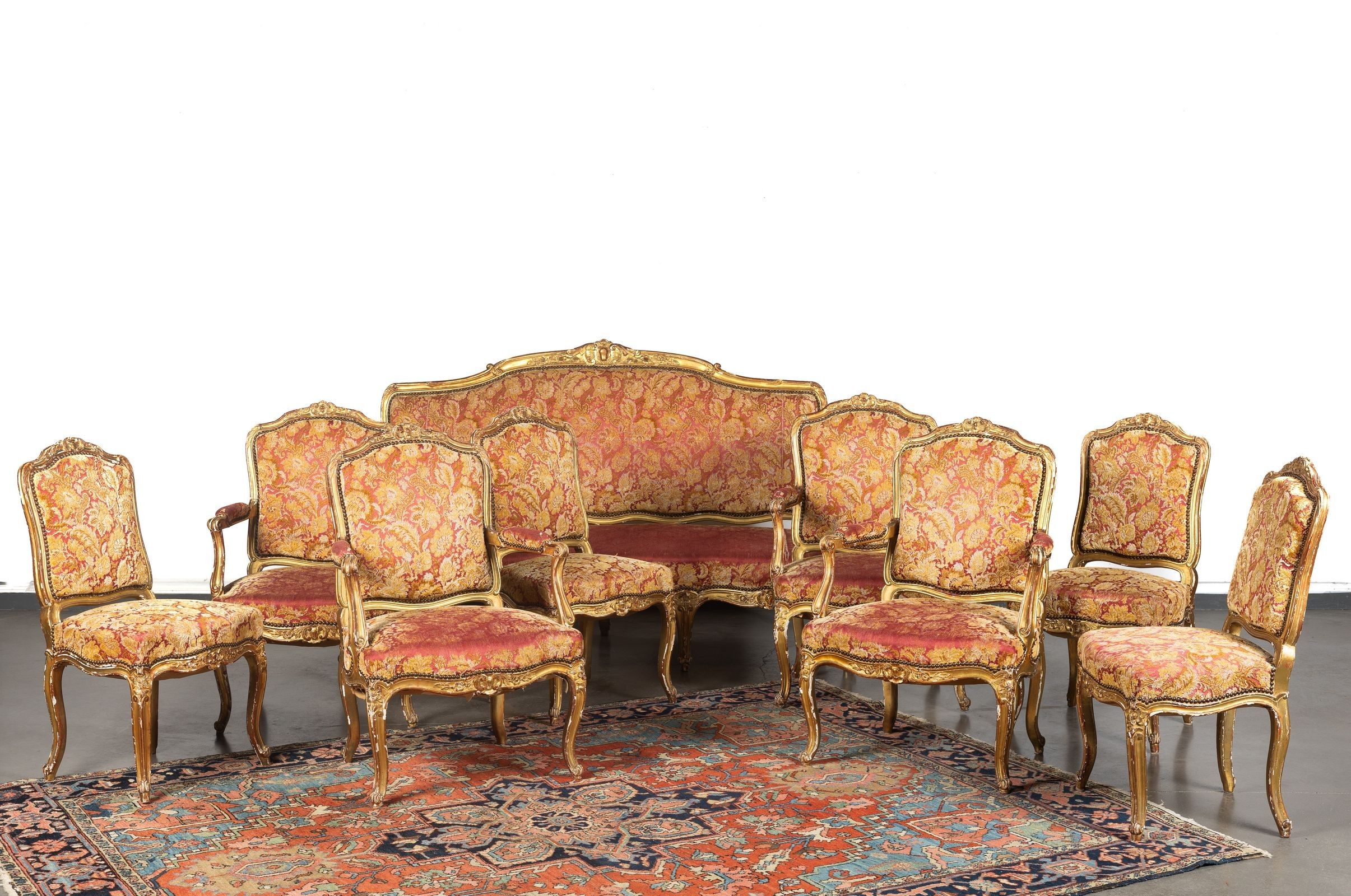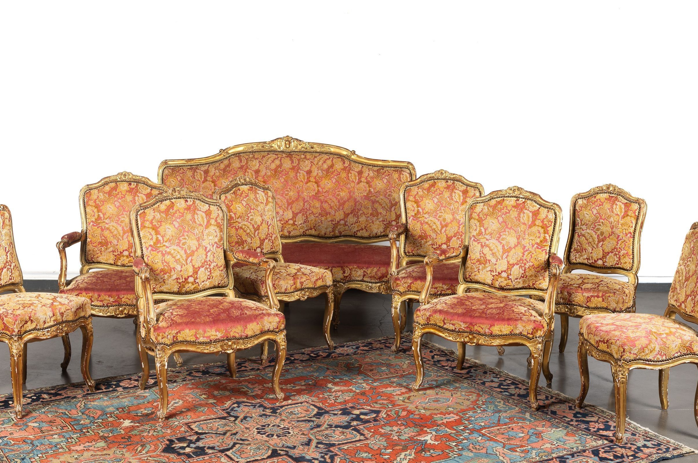 Living room set comprising a three-seater sofa, four armchairs and four chairs in moulded, carved and gilded wood decorated with shells, flowers and foliage. Moving backs, curved legs ending in a volute - Napoleon III period (missing gilding)