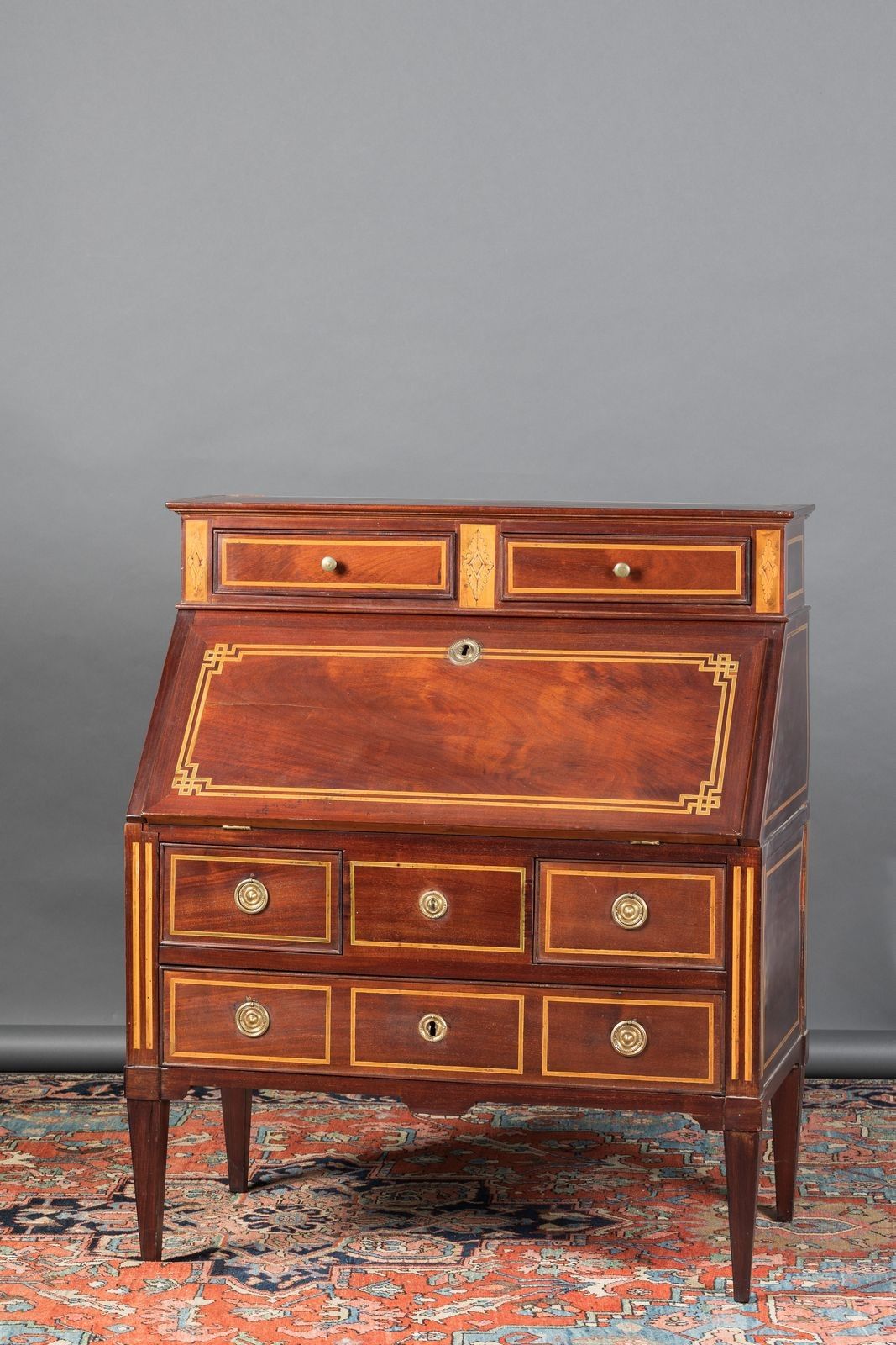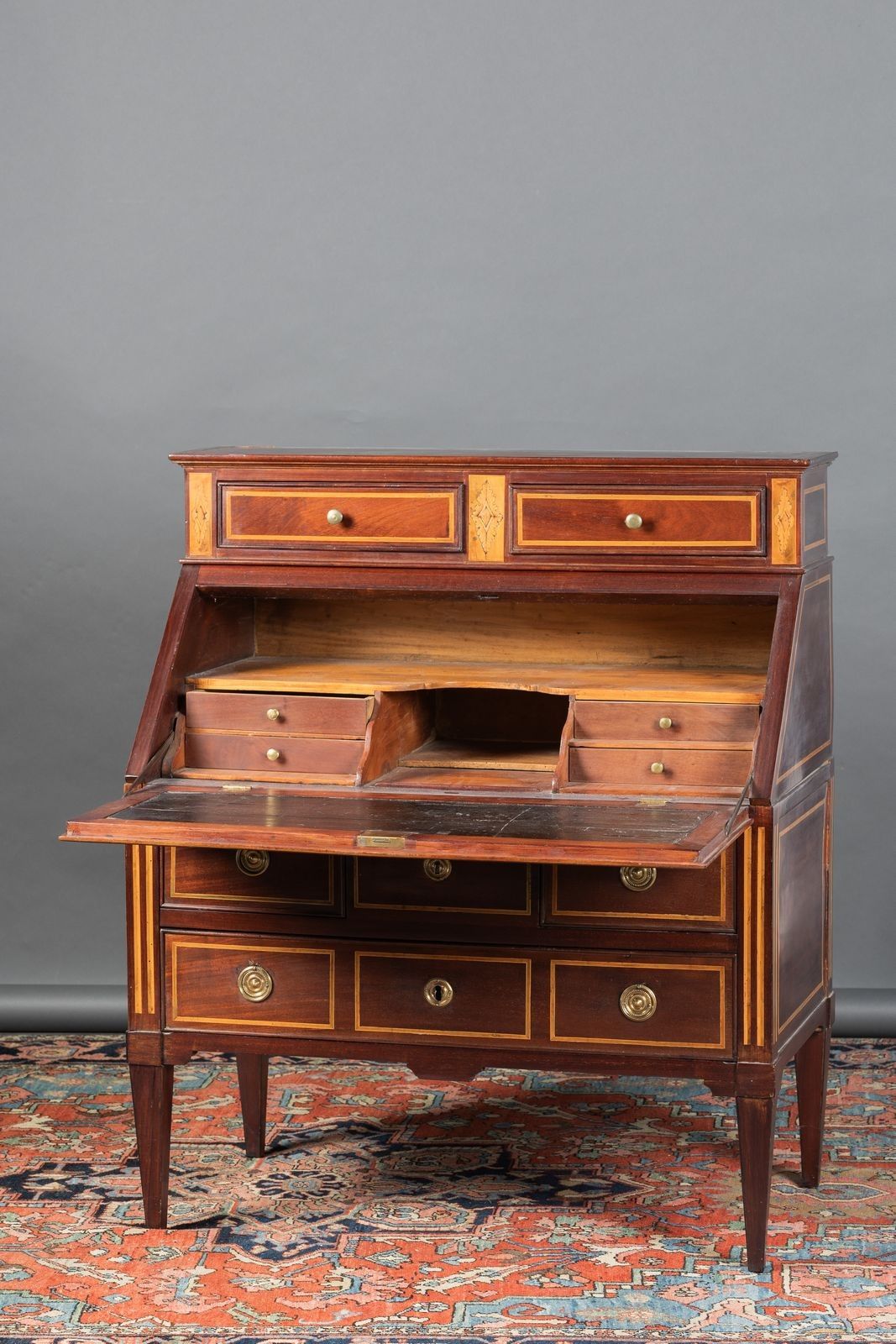 A solid mahogany scribed chest of drawers, inlaid with boxwood fillets and green wood. It has a tiered opening with two drawers above a flap revealing four drawers and a cover, and three box drawers. False fluted mounts, sheath legs - Port work from the late 18th century.