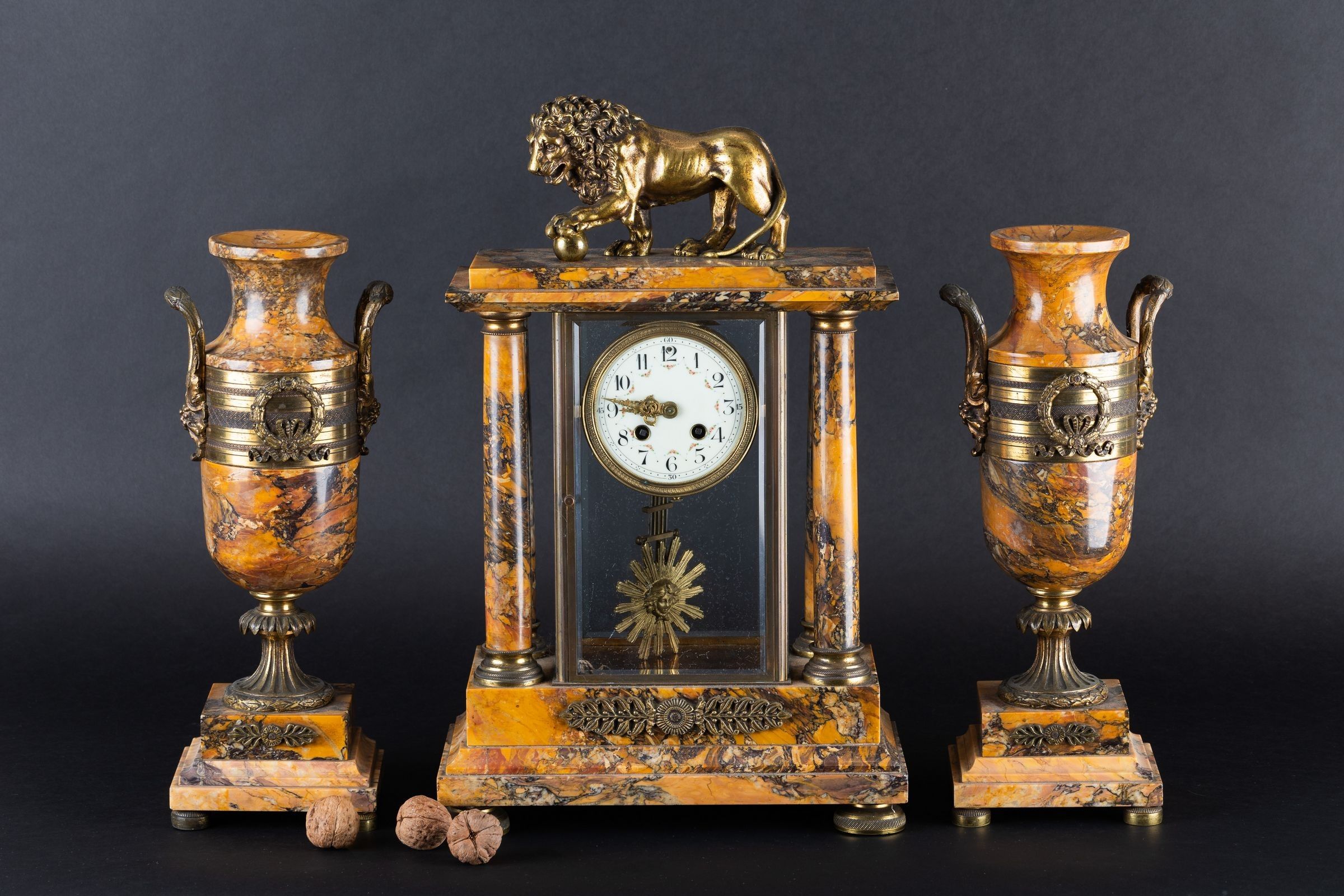 Garnished with yellow breccia marble, black veined pink marble and bronze. The clock with movement in a cage framed by four ringed columns surmounted by a lion. The pair of covered vases on pedestals with bronze ornamentation - Late 19th century