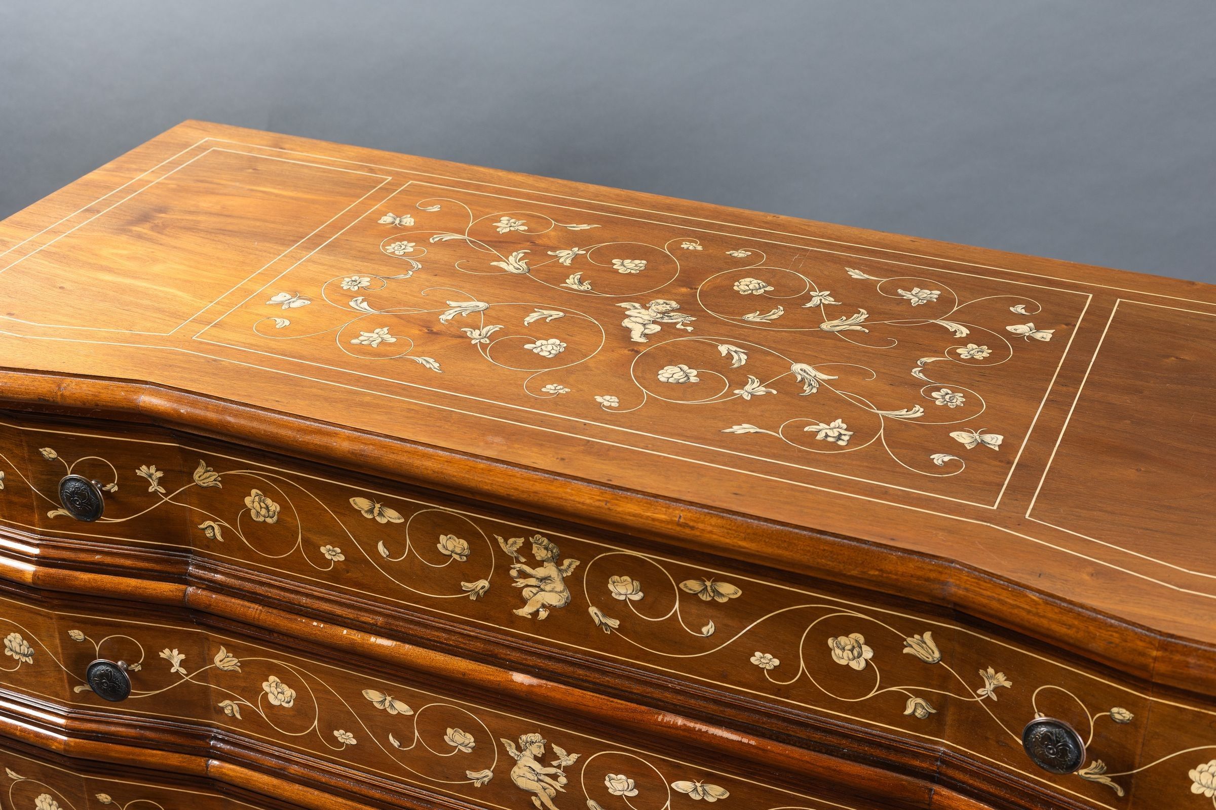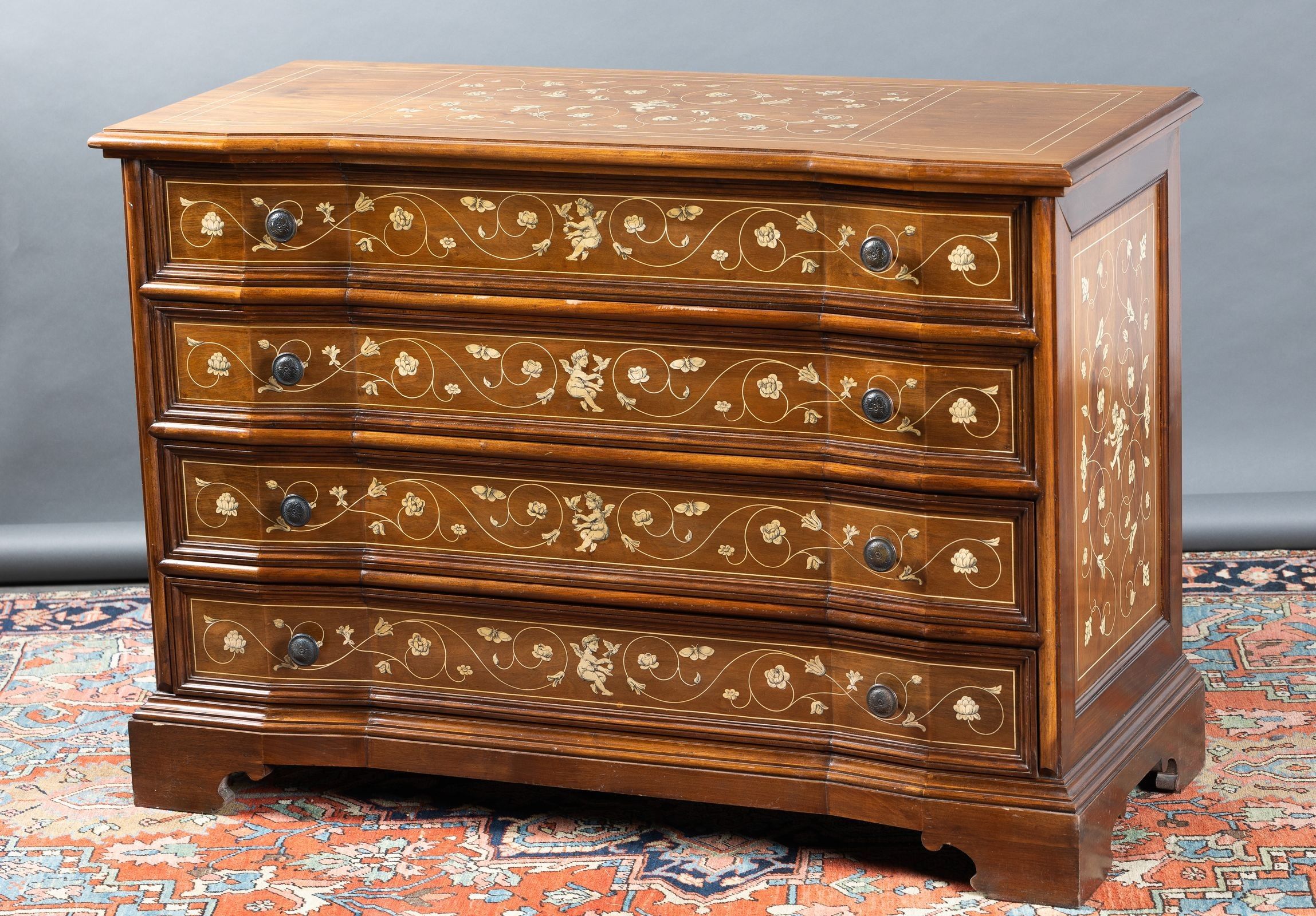 Walnut chest of drawers with bone inlays painted in the imitation of engraved floral scrolls, butterflies and cherubs. Opens into four drawers - Northern Italy, Emilia, 20th century