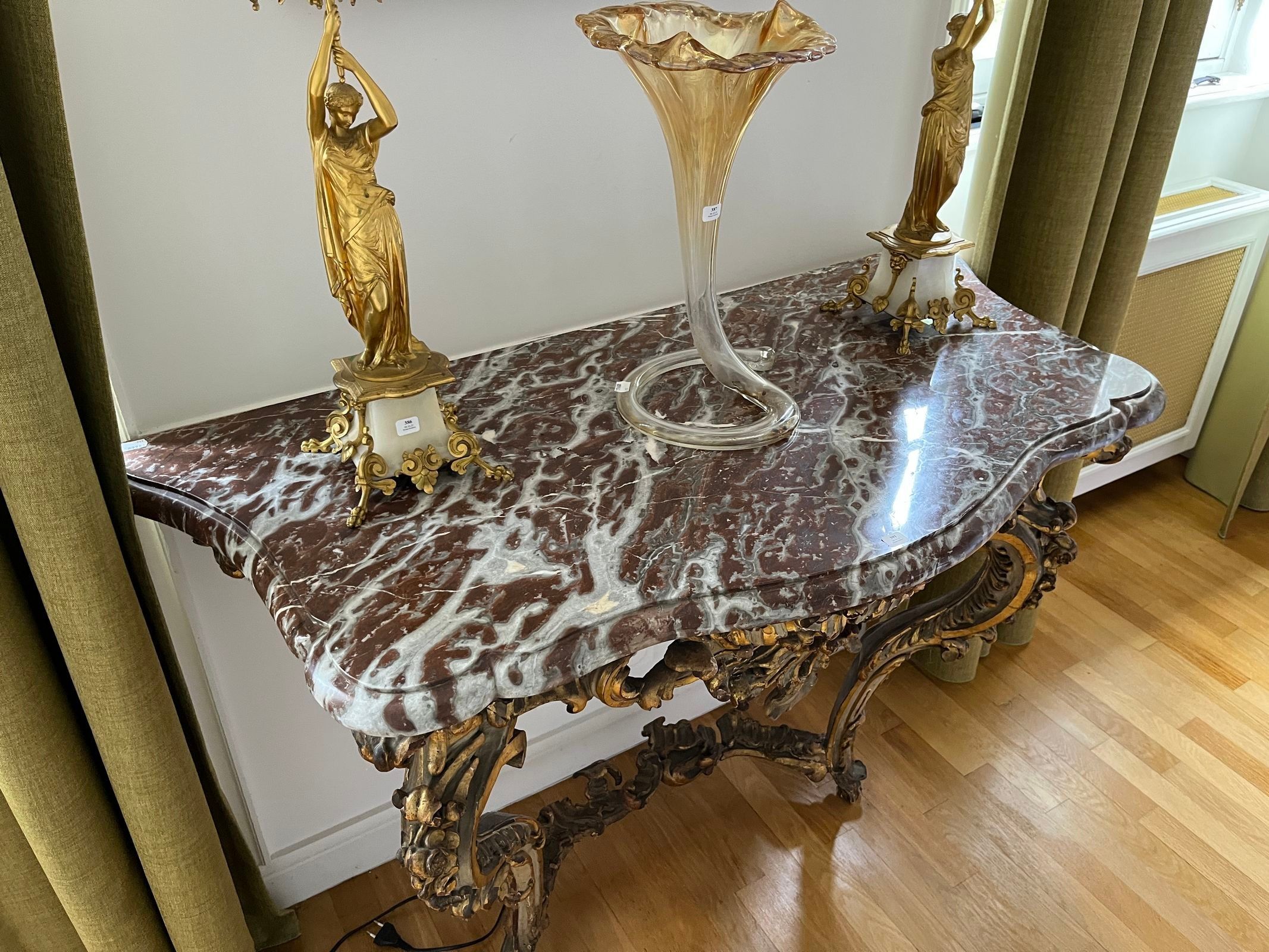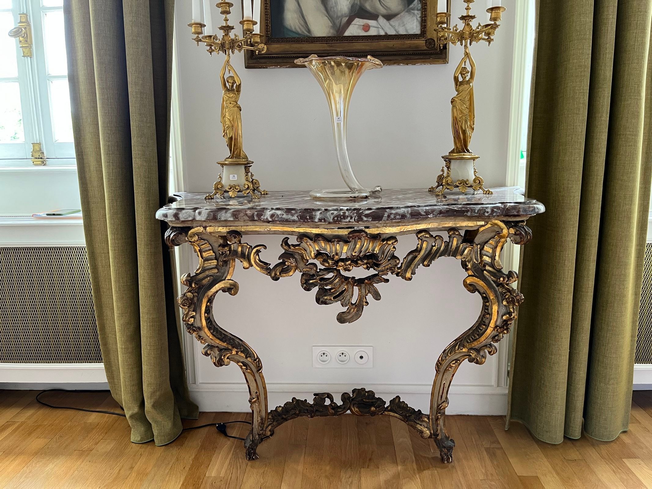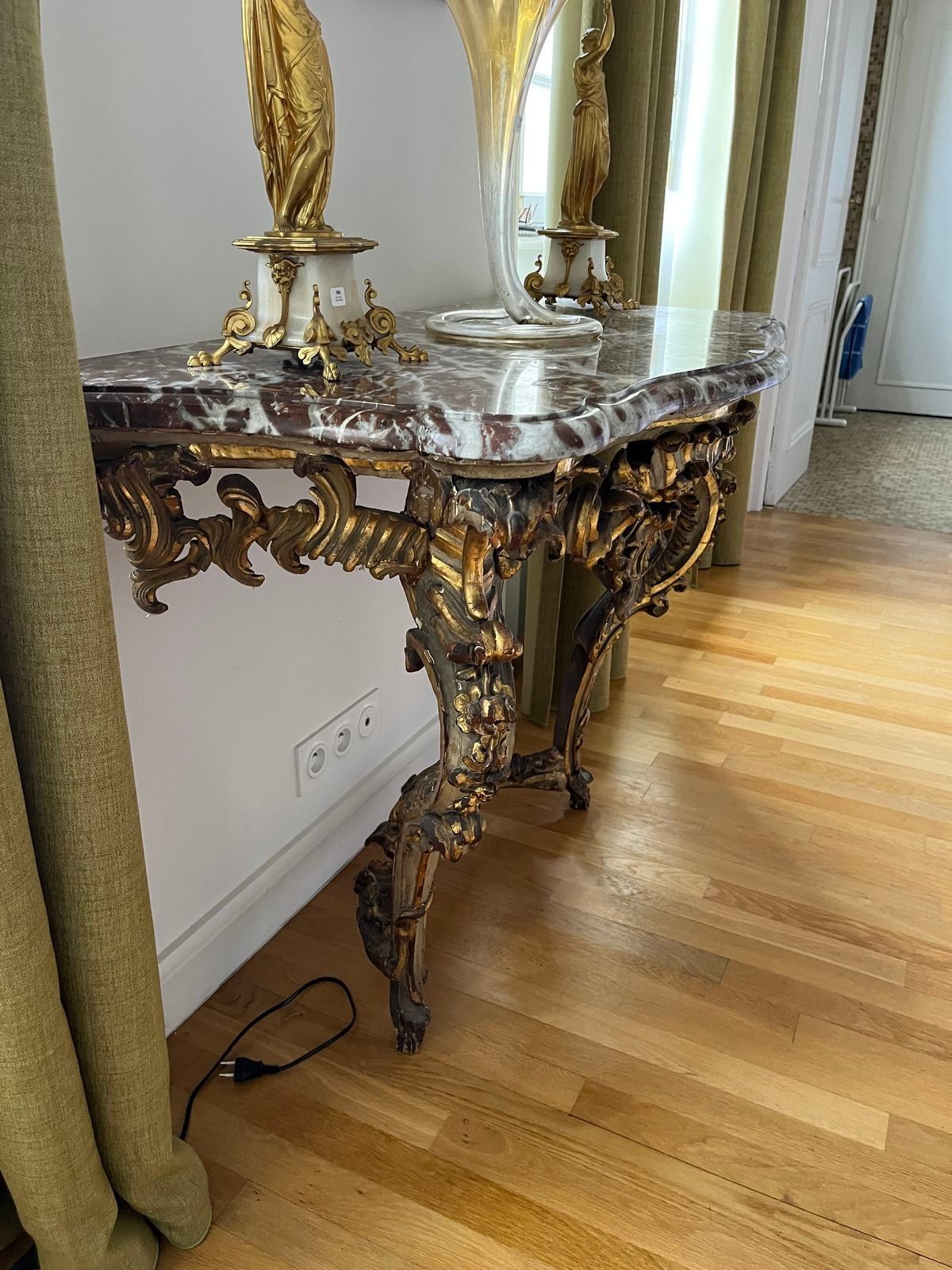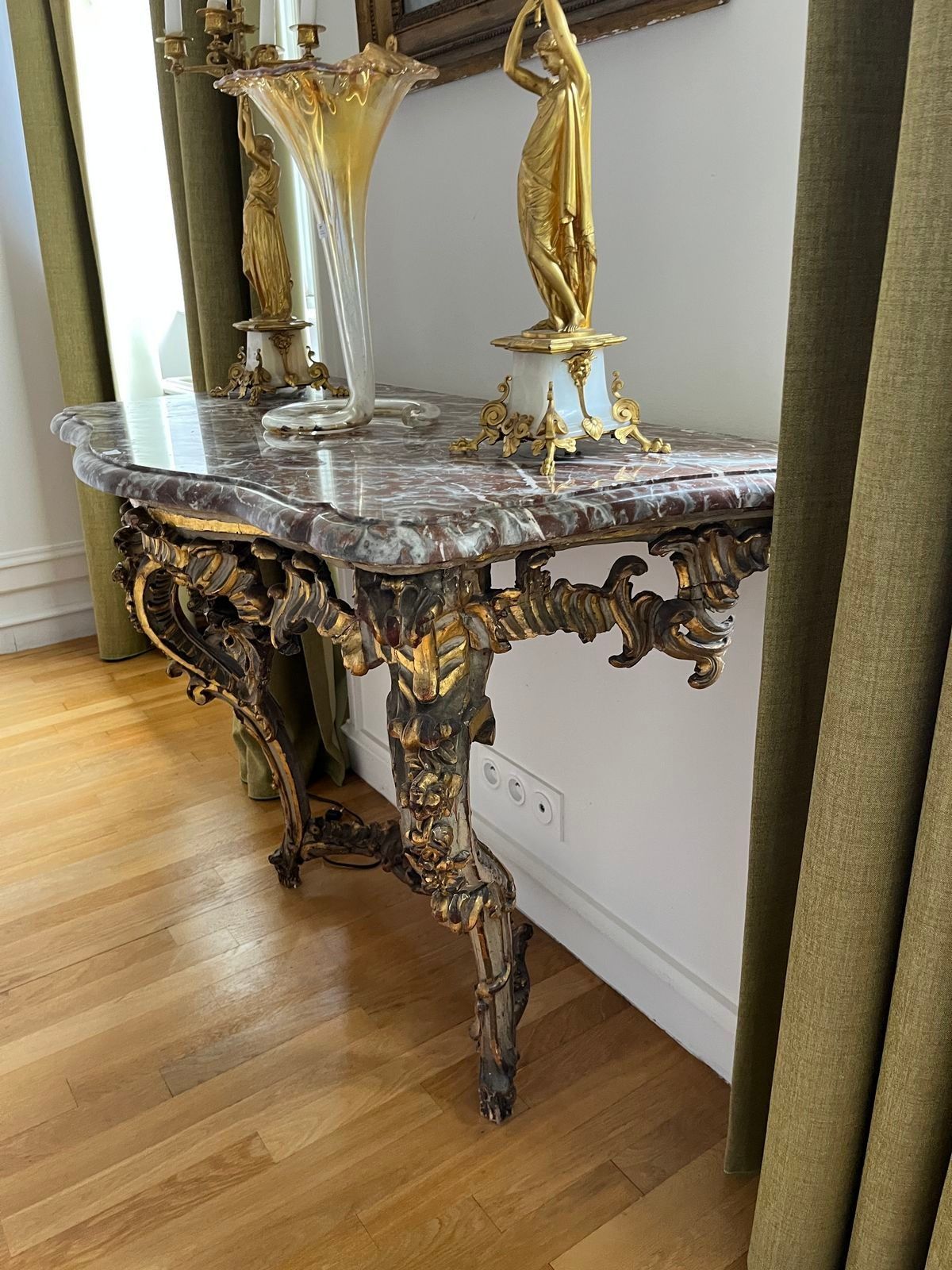 Console in grey lacquered wood with gold highlights, the curved openwork belt with foliage motifs. Cambered legs carved with flowers and joined by a brace. Rance des Flandres marble top. Louis XV style - 20th century