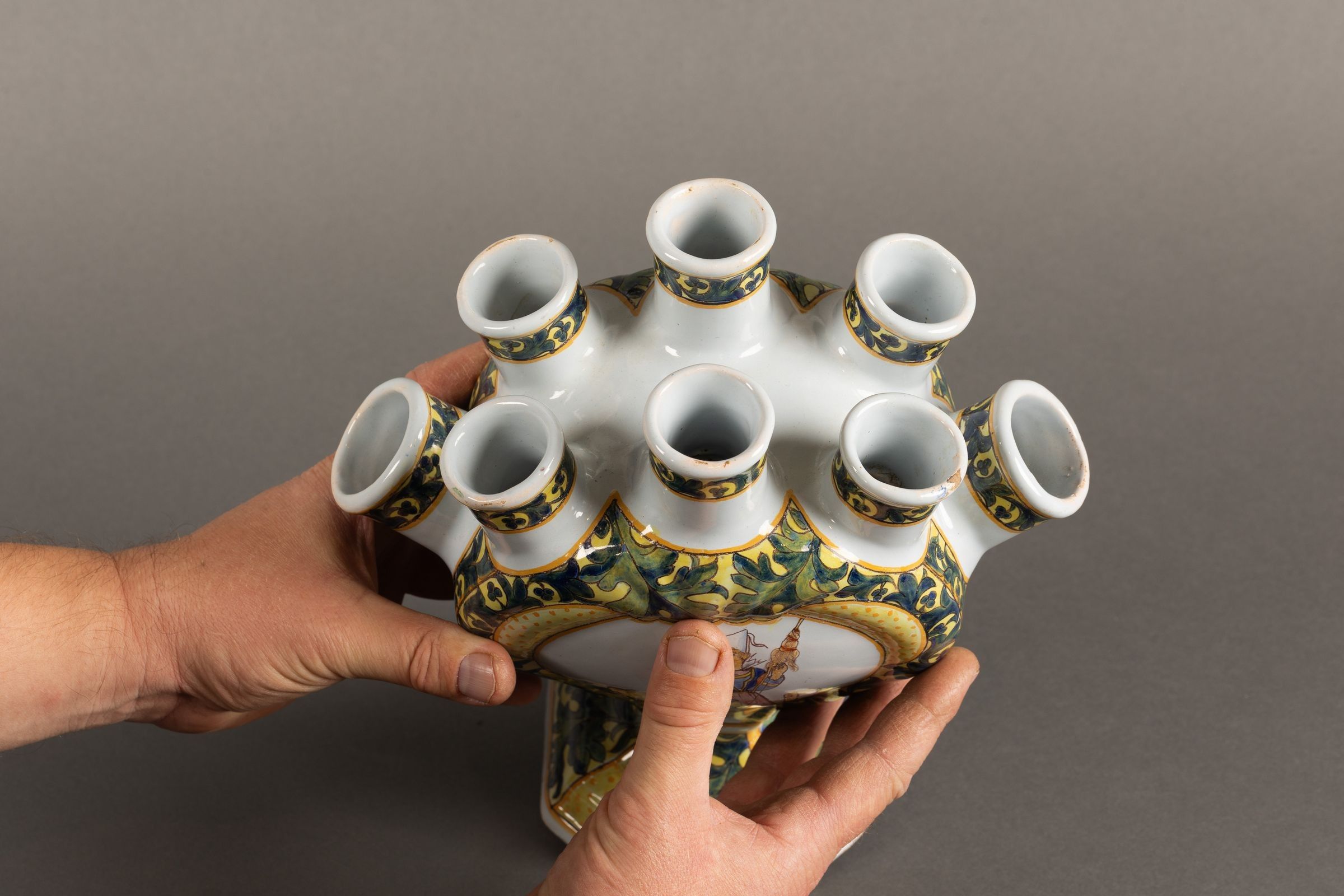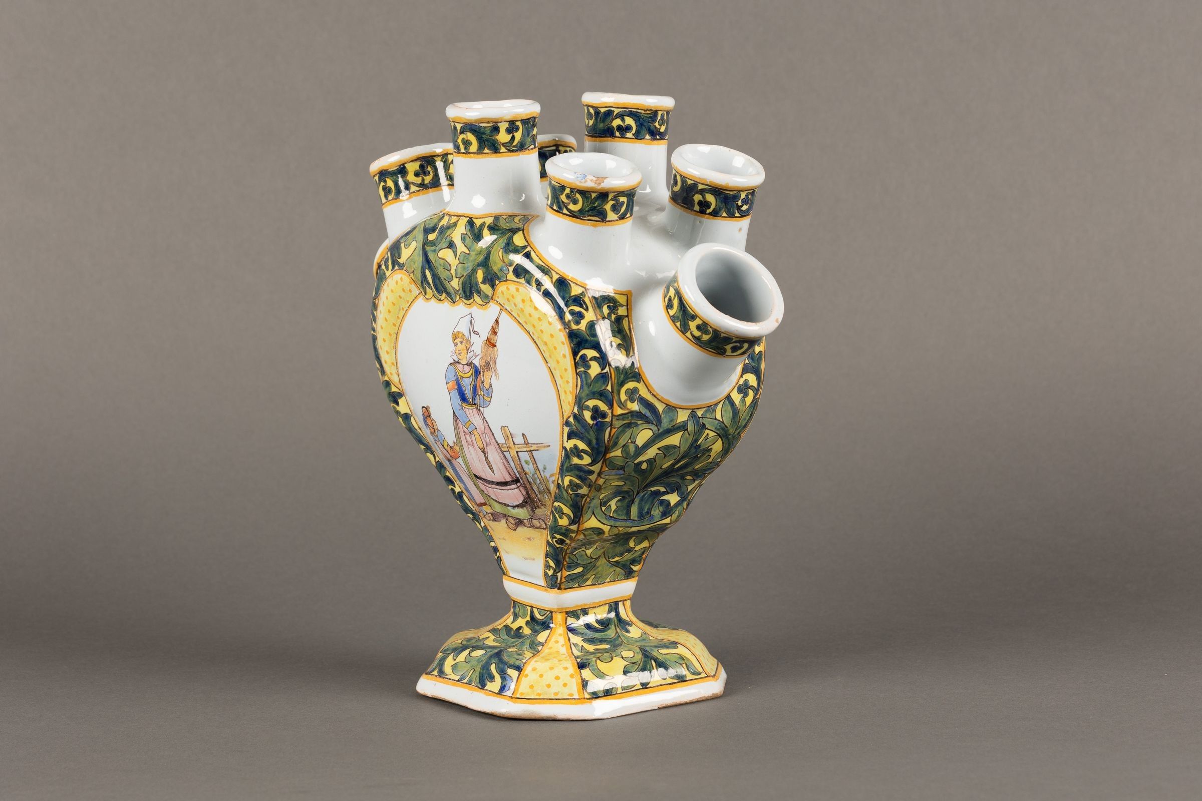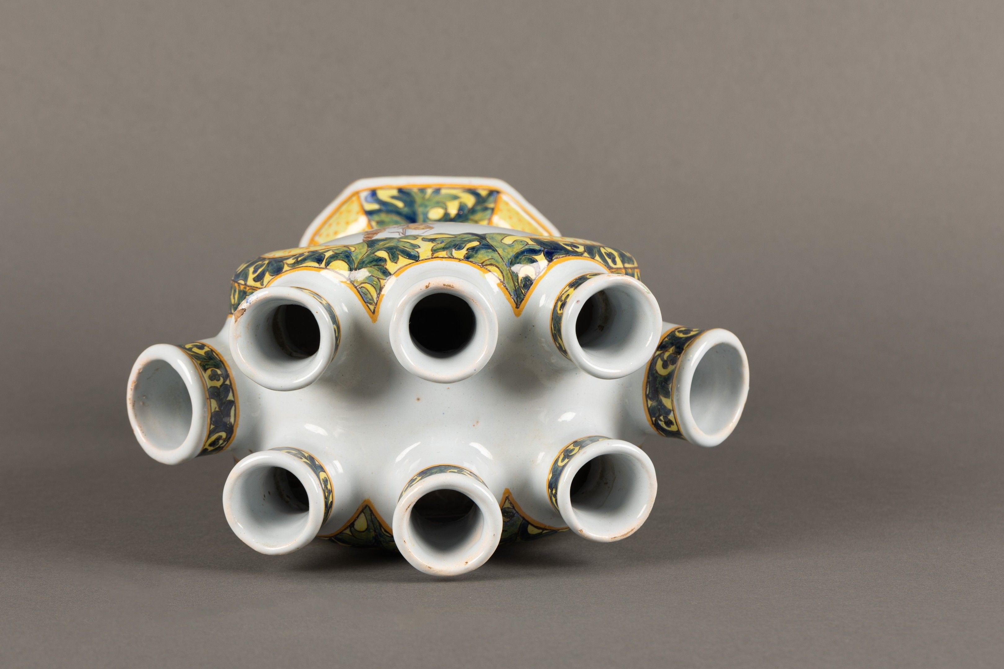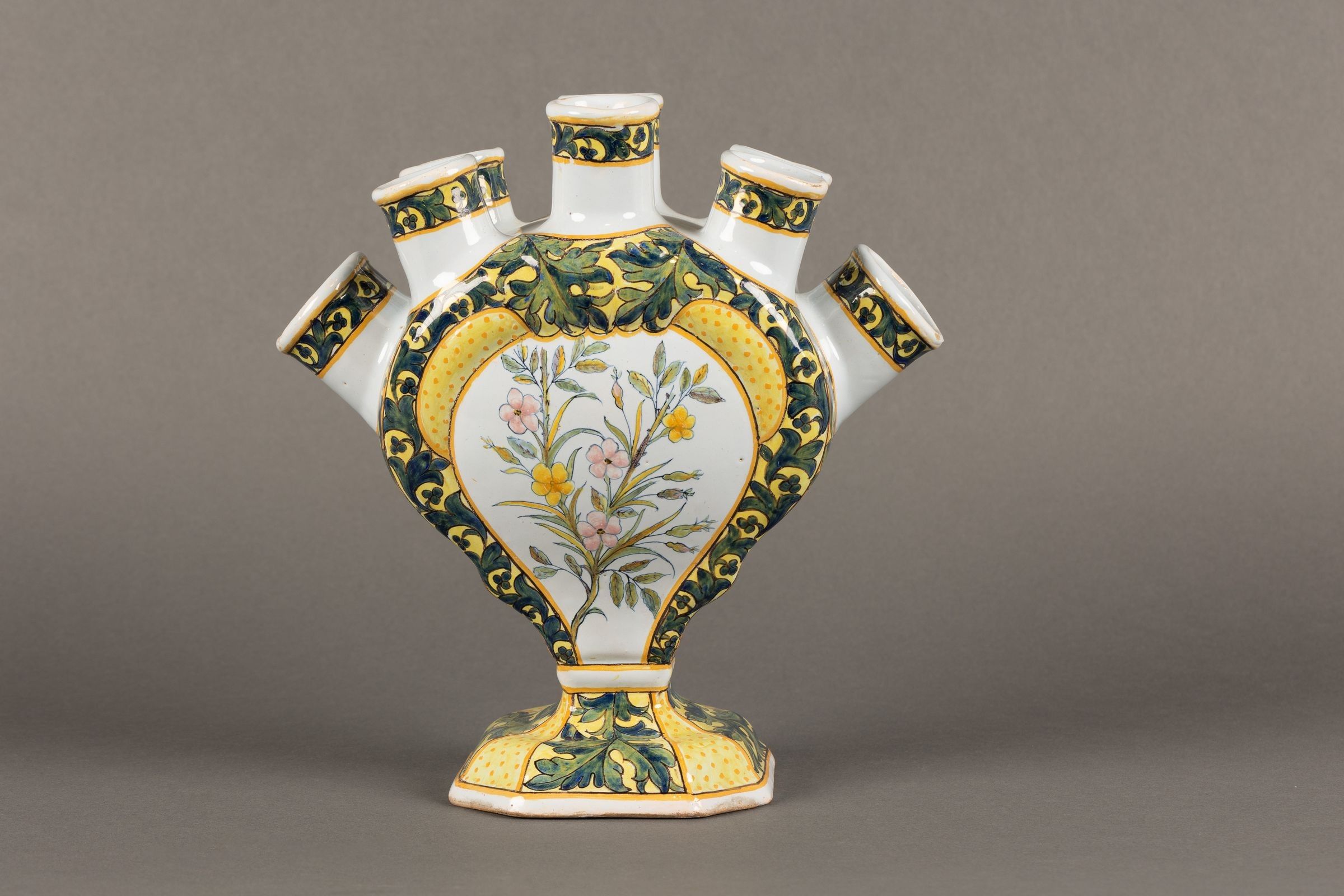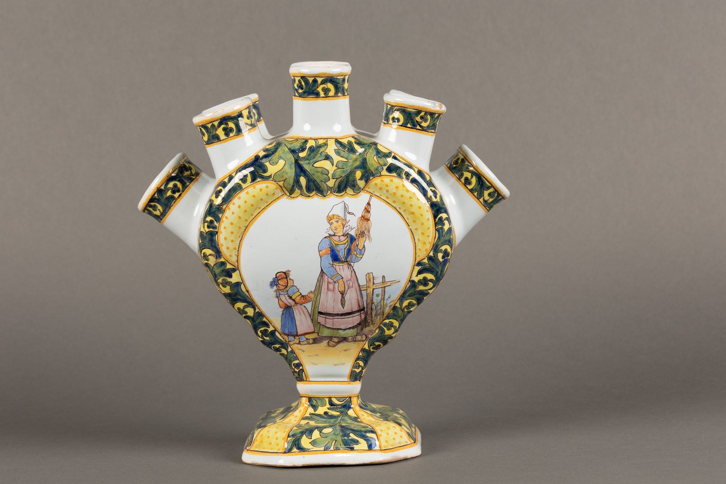 Bouquetière with eight necks decorated with the Penhars spinner on one side and botanical decoration on the other side.
