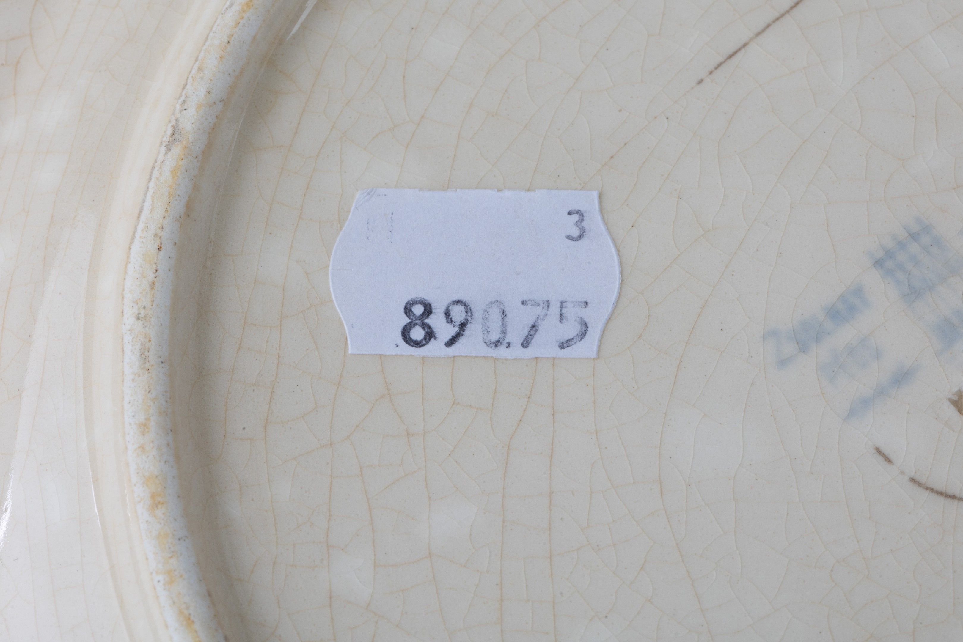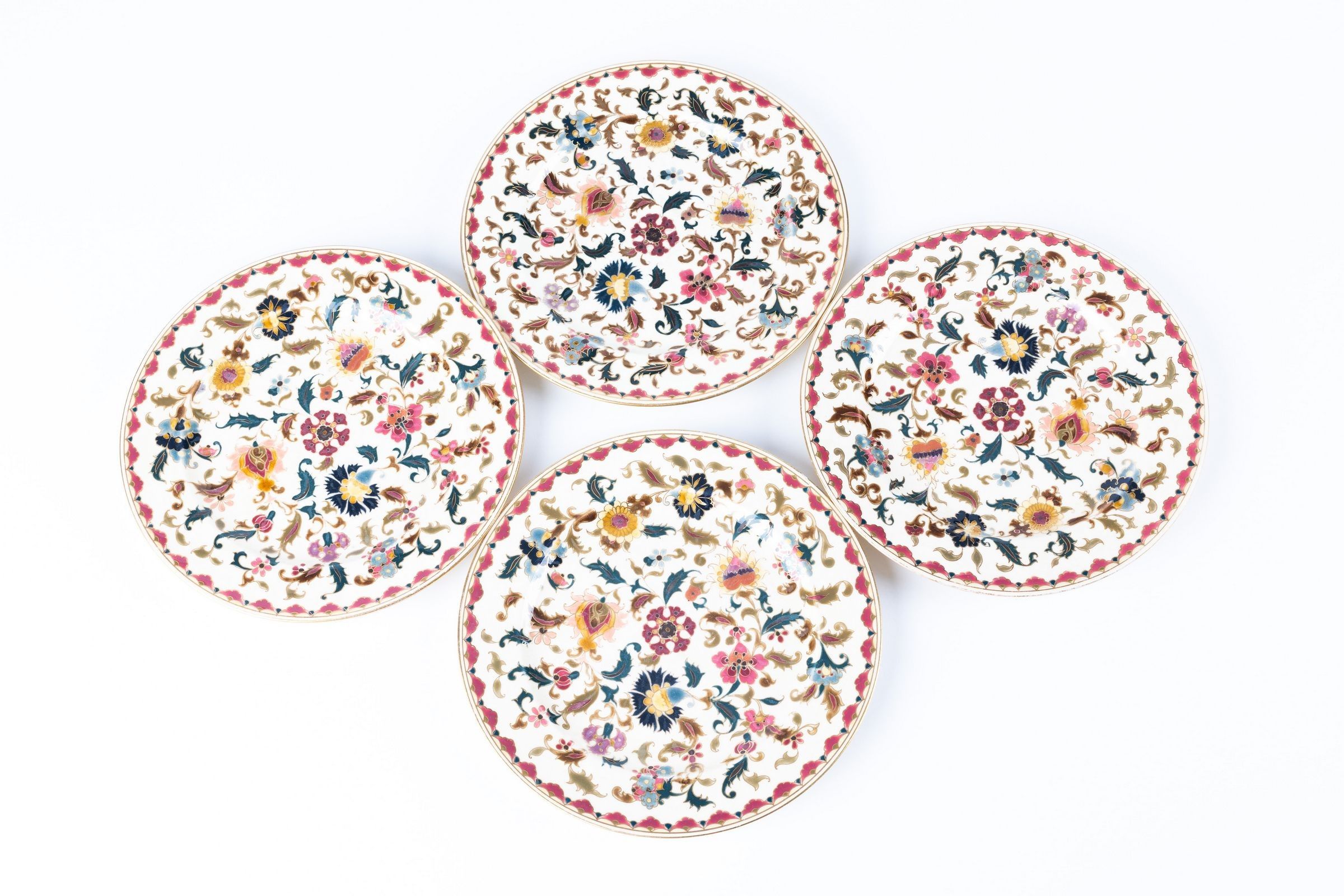 Set of four polychrome ceramic plates with gold highlights. Decorated with flowers and foliage on a cream background - Late 19th-early 20th century (one with a very slight accident, one with a crack, one with a starred background)