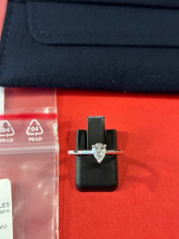 Ring in 18 carat white gold set with a pear-cut diamond (synthetic stone)