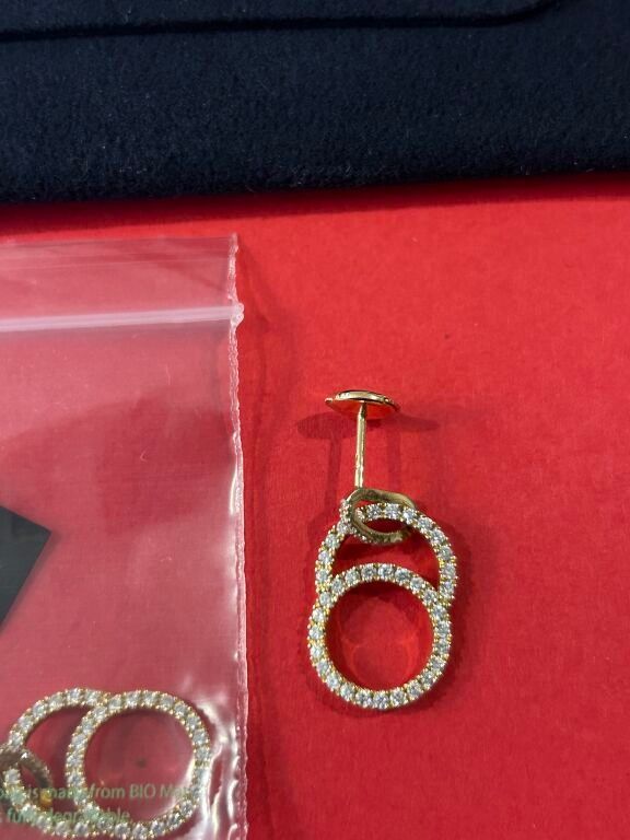 Pair of dangling earrings in 18 carat yellow gold paved with diamonds (synthetic stones) weighing 0.720 carat. Without clasp.