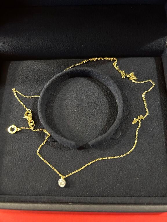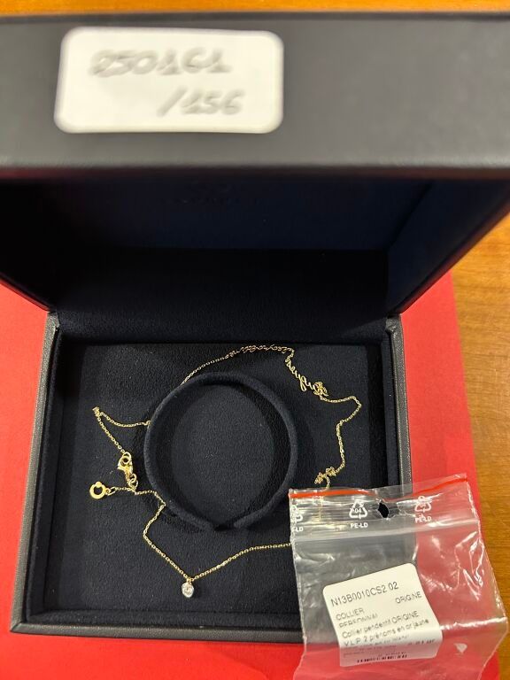 Pendant in 18 carat yellow gold holding a diamond (synthetic stone) and the names Hugues and Léopoldine weighing 0.221 carats in its case