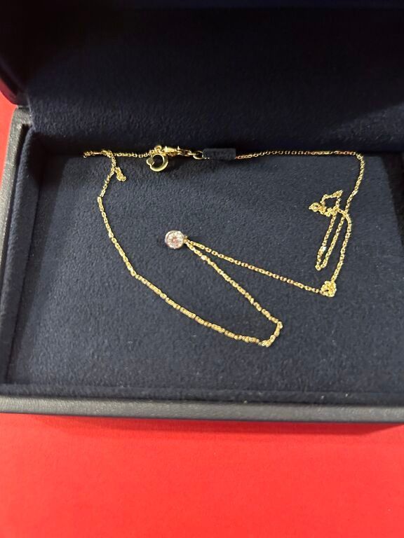 18 carat yellow gold chain holding a diamond (synthetic stone) weighing 0.200 carats in its case