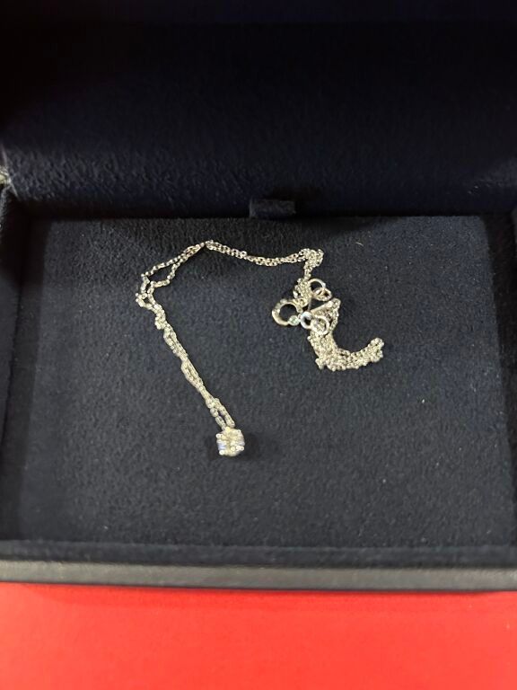 18 carat white gold chain holding a diamond (synthetic stone) weighing 0.300 carats in its box
