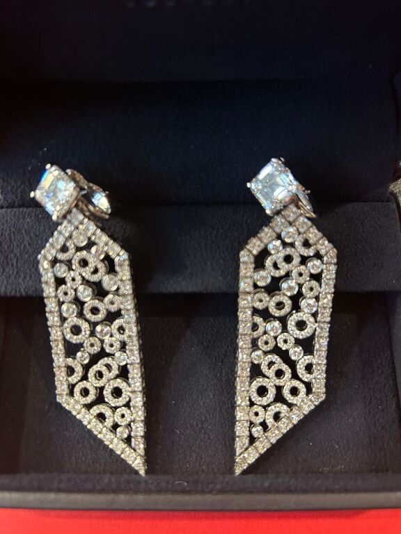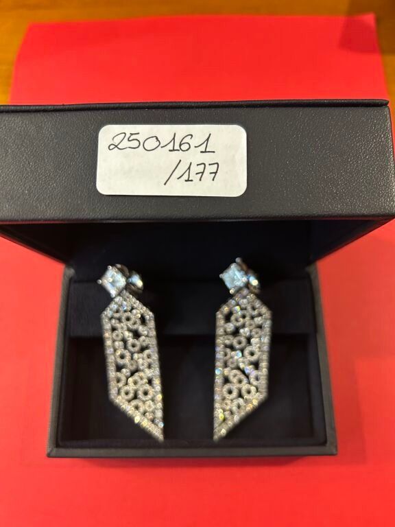 Pair of dangling earrings in 18-carat white gold, each presenting a diamond weighing approximately 4 carats and a geometrical design paved with diamonds weighing approximately 19 carats (synthetic stones), in a presentation case.