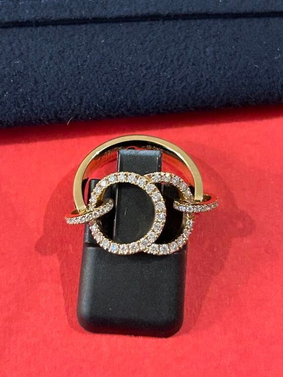 Ring in 18 carat pink gold with a pave pattern of diamonds (0.4 carats) (synthetic stones) attached by rings to a flat half-ring