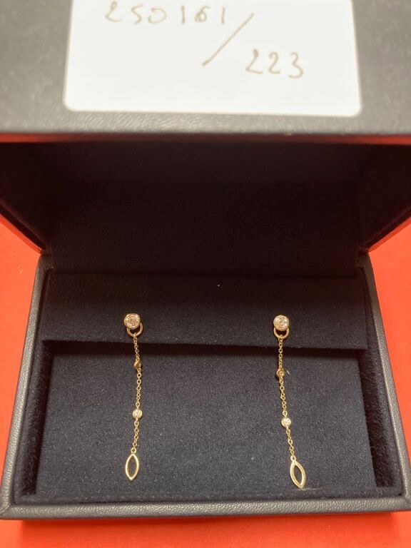 Pair of earrings in 18 carat yellow gold and 3 diamonds (0.56 carats) (synthetic stones) in a case
