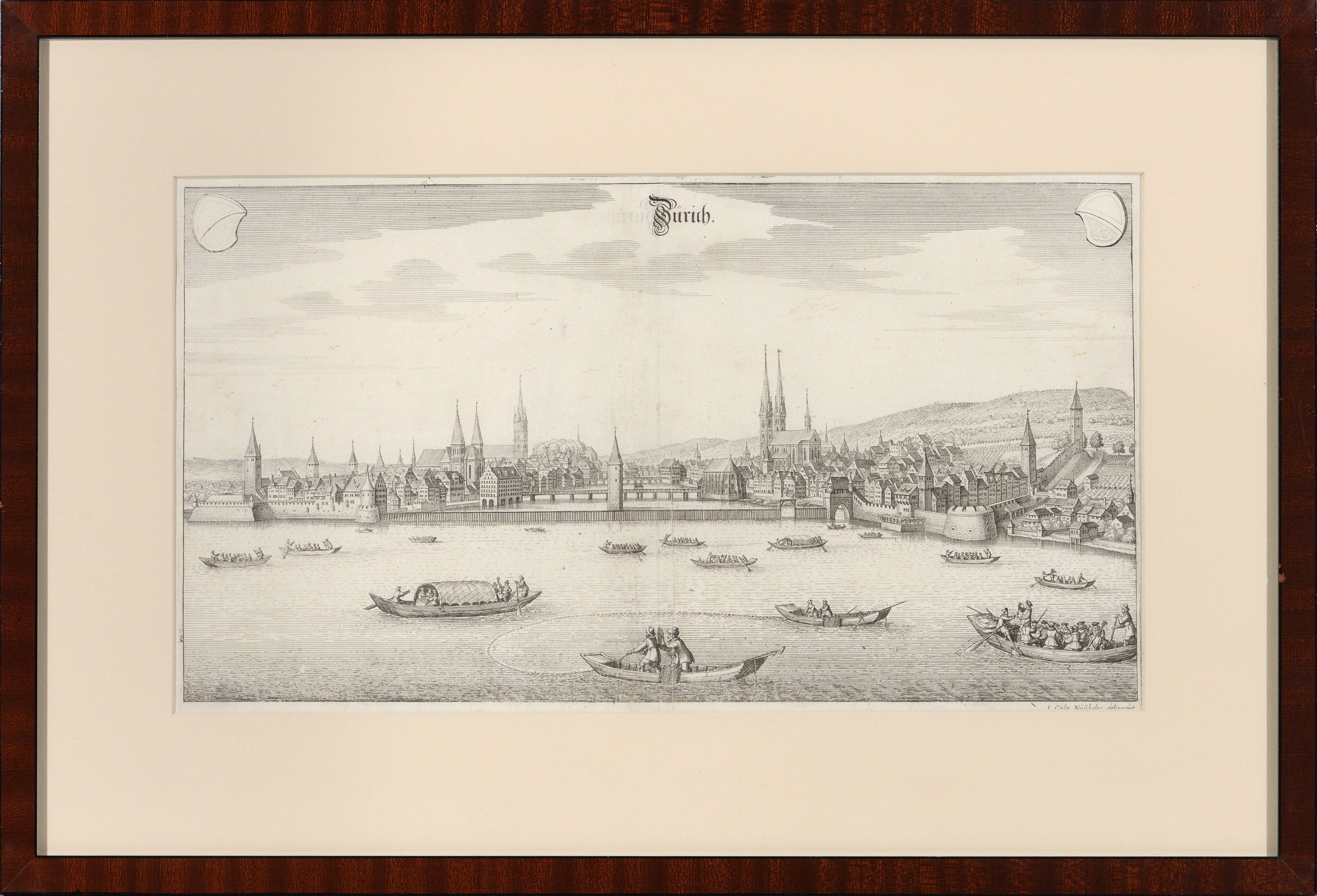 M. MERIAN, View of Zurich, etching, sheet 21 x 37.5 cm, fine proof, not examined outside the frame. Attached is a set of views of Hanover, Frankfurt, Amsterdam (2 p.), Tubigen, Constance, Stockholm, Cracow, Copenhagen, etc., framed proofs, not examined outside the frames.