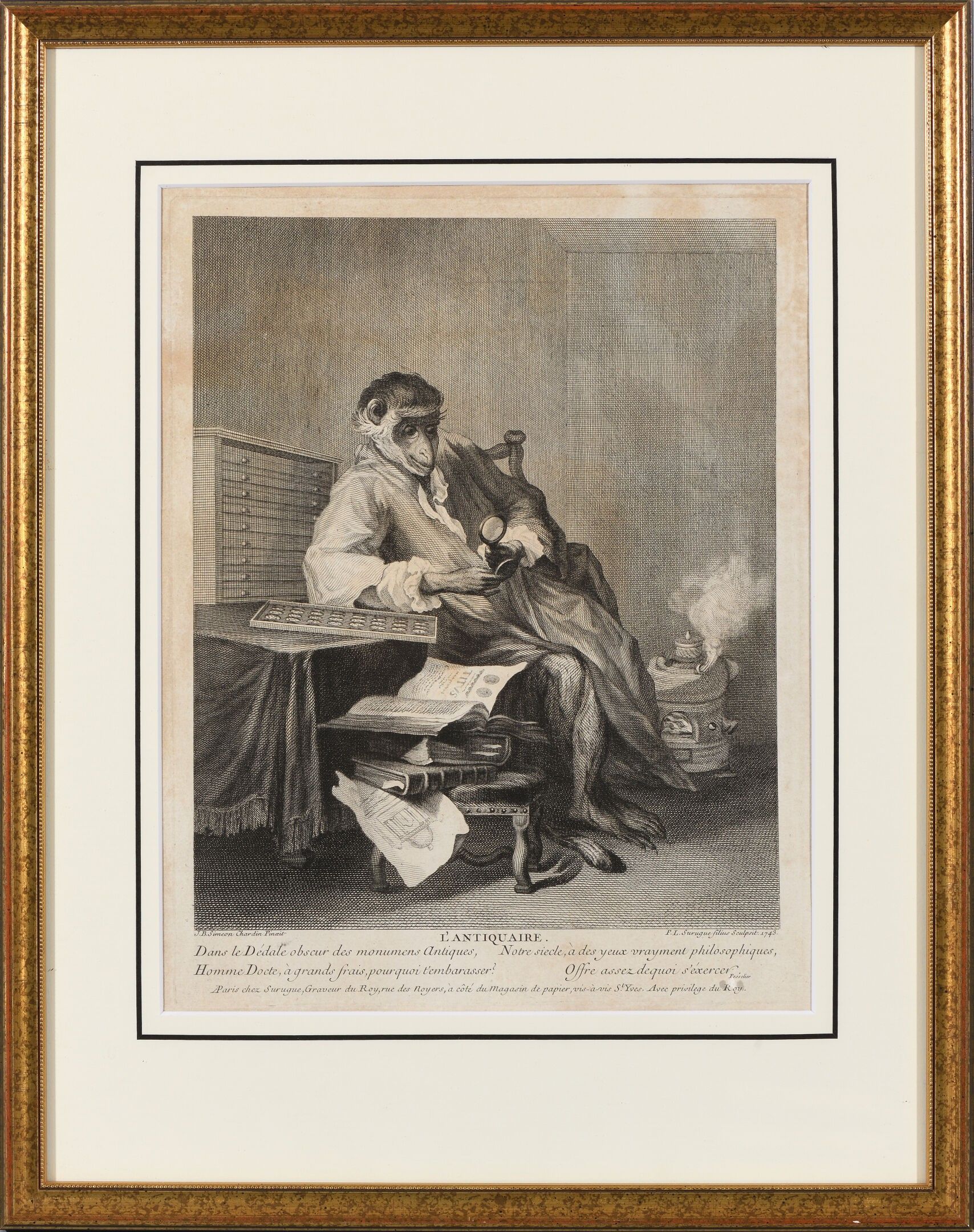 After Jean-Siméon CHARDIN, L'Antiquaire, 1743, etching and burin by P. L. Surugue, 31 x 24.5 cm, small margins (Bocher 2 ii/ii), a fine proof with the letter, not examined out of frame. Also by L.-L. Boilly, Les Antiquaires, lithograph, by C.-E. Travies, L'Antiquaire, lithograph, by G. Cruikshank, Game of Chess, coloured etching (sheet) and Marks ed, The Blessins of New Taxes, coloured etchings, framed proofs, not examined outside the frames.