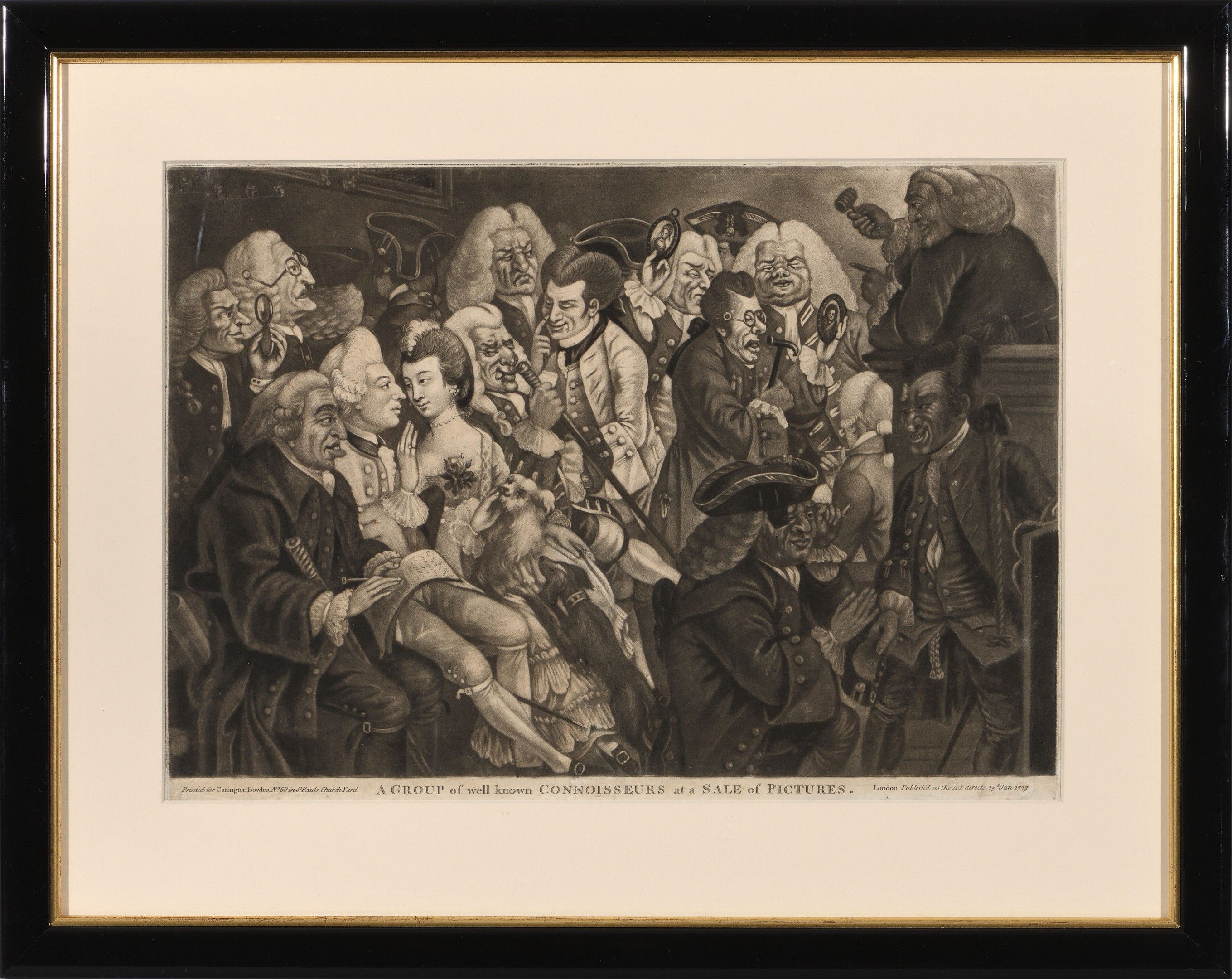 After Herbert PUGH, A Group of well known Connoisseurs at a Sale of Pictures, 1773, aquatint published by C. Bowles, 25 x 36 cm, small margins, fine proof, unexamined out of frame. Attached from I. Cruikshank, A Lilliputian Auction; A Going, a going... the last time, a going... Down!; The Relics of a Prophet or Huntingdon's sale and Sales by auctions! etchings, fine coloured proofs, not examined out of frame.