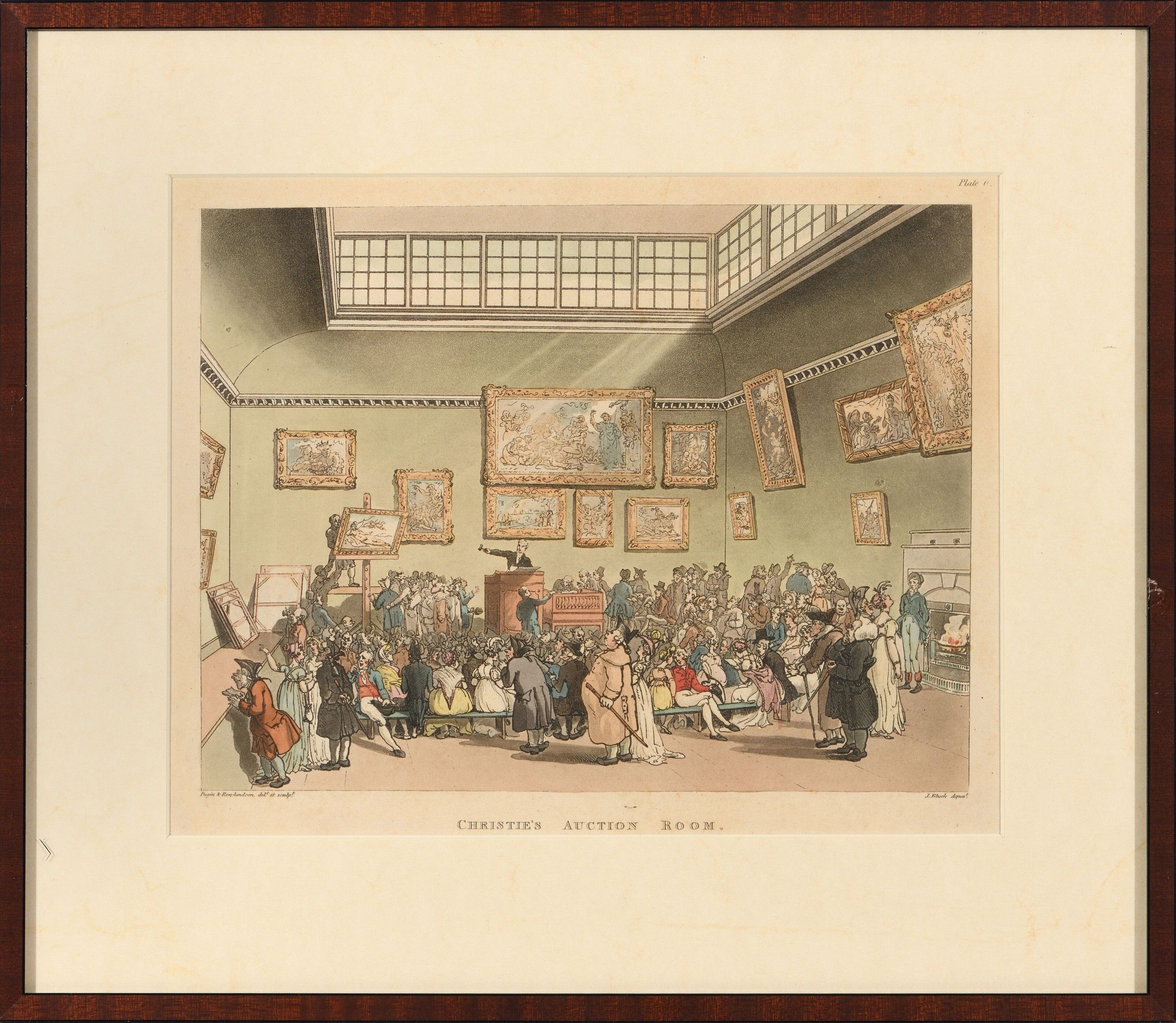 T. ROWLANDSON and A. C. PUGIN, Christie's Auction Room, etching, 22.5 x 28 cm, small margins, fine colour proof, unexamined out of frame. Also by R. Dighton, The Specious Orator (James Christie) and A View near Hyde Park Corner (Edmund Tattersall), etchings, fine coloured proofs, not examined out of frame and 2 anonymous plates.