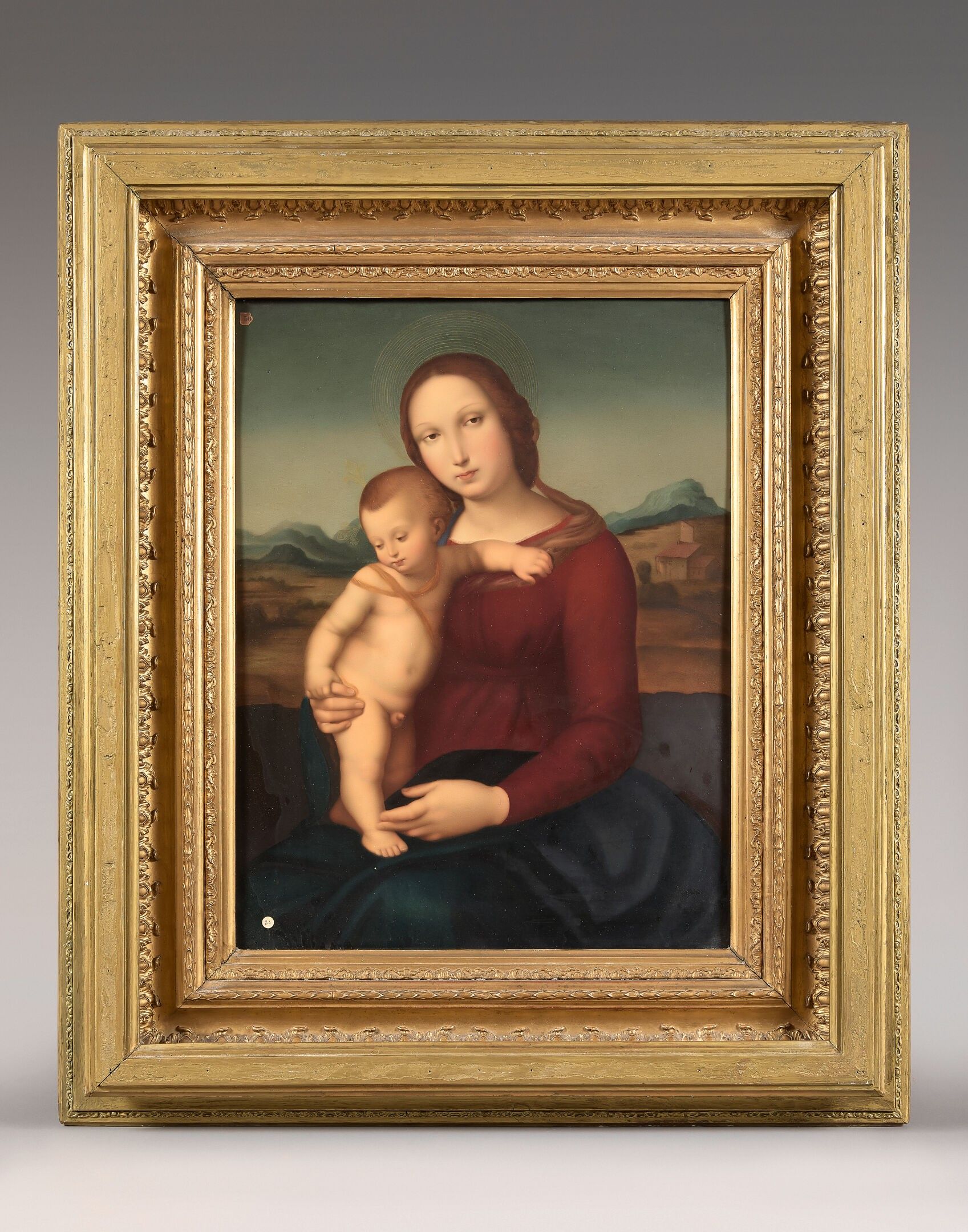 This porcelain plate is an identical reproduction of an undated painting attributed to a follower of Raphael and held in the Alte Pinakothek in Munich (inv. 506), from the collection of Elector Karl Theodore (1724-1799). It is of a high quality of execution and can be compared to those painted at the Manufacture de Sèvres between 1817 and 1848, but it does not bear their mark and the Manufacture's archives do not mention either the author, "M. Legrand", or the subject.