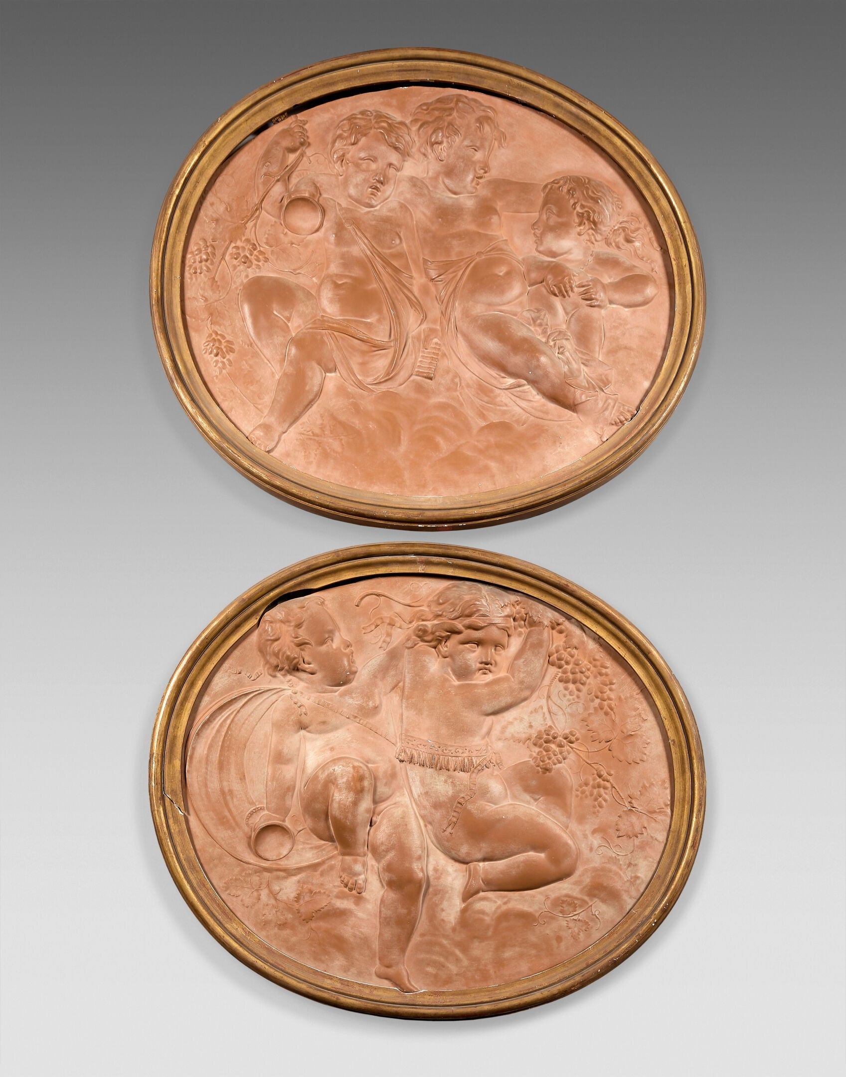 Pair of bas-reliefs in terracotta-tinted plaster depicting Bacchante children.