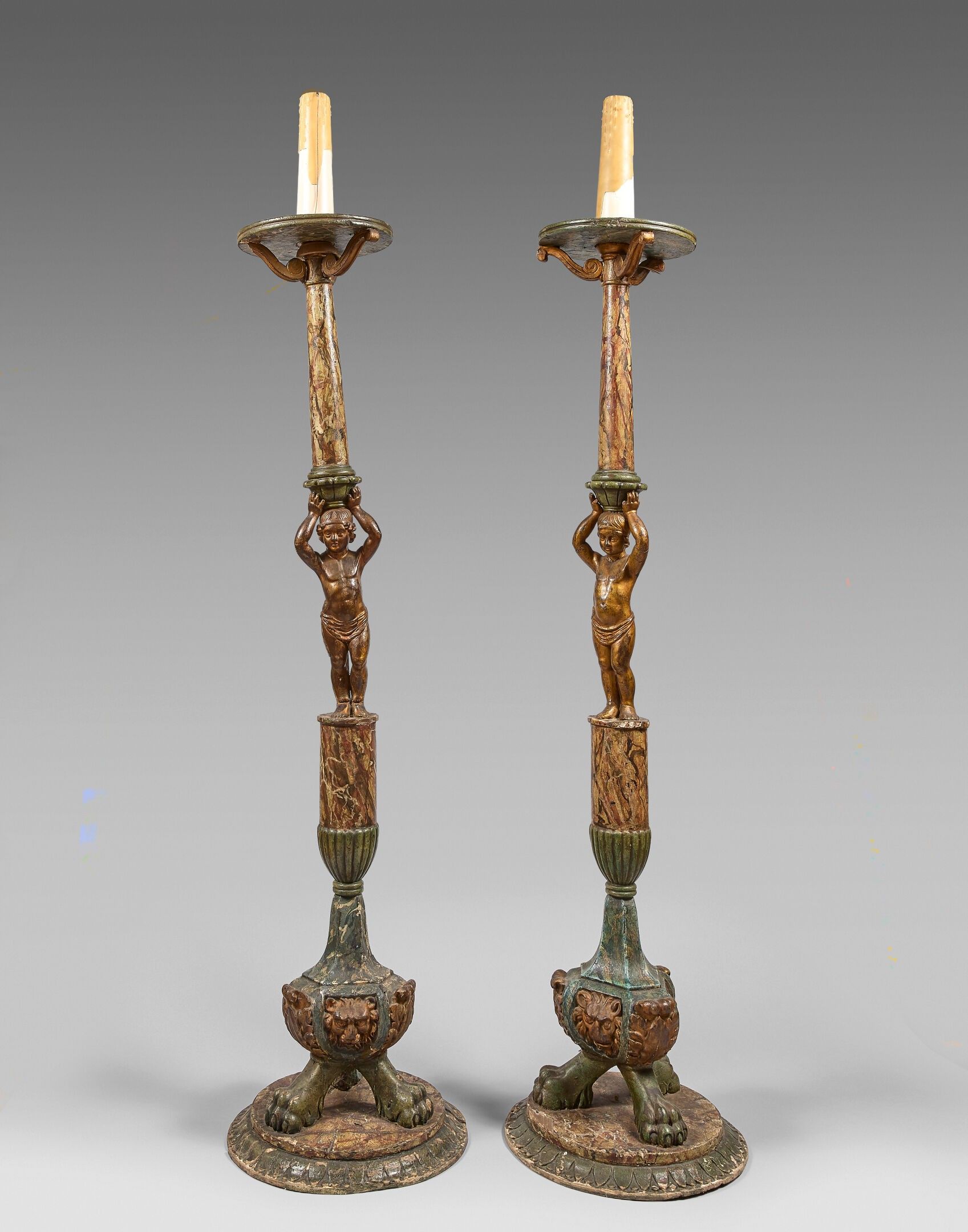 Pair of large wooden piccierges painted in imitation of marble, carved with gilded putti on a tripod base with claws. Round base with palmettes.