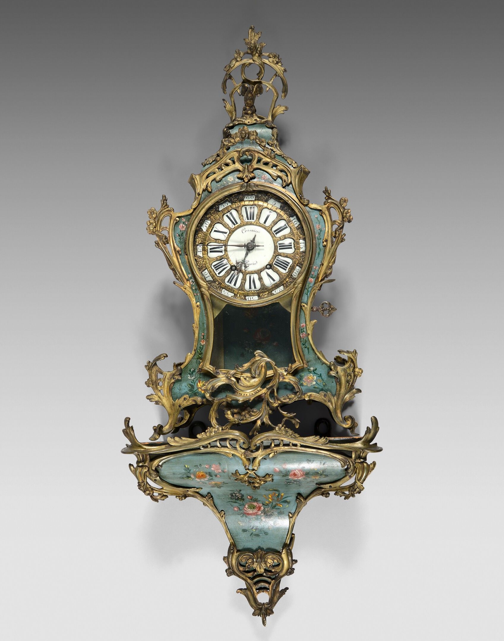 Cartel and console table with polychrome decoration of flowers on a green background. Richly decorated with foliate bronzes, the base decorated with a bird. Bronze dial with twenty-four enamel plaques signed Crosnier in Paris.