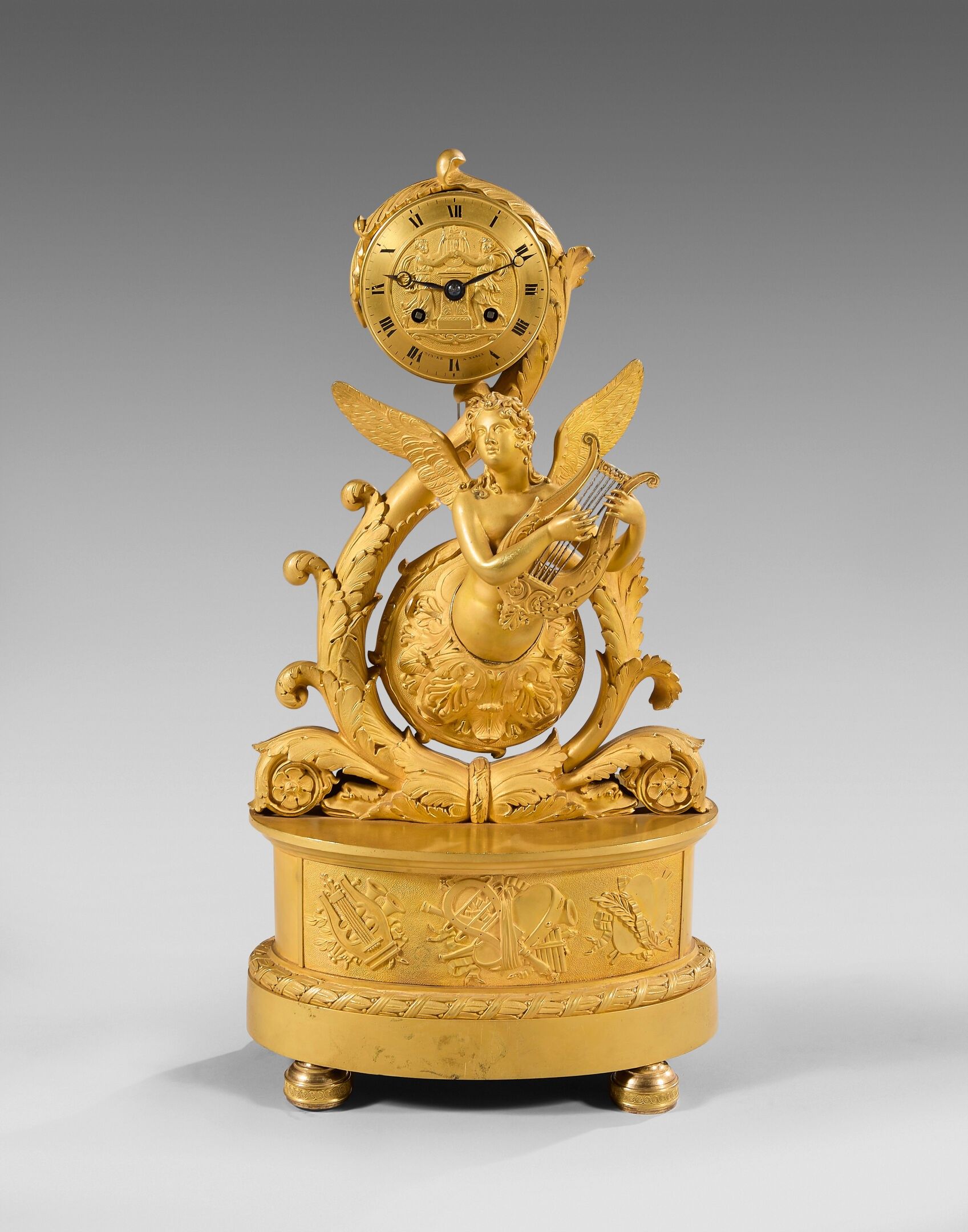 A gilt bronze clock with a bust of Sapho emerging from foliage. Oval base decorated with music trophies. Dial signed "Didier a Nancy". Wire suspension. Mahogany base with light wood fillets.