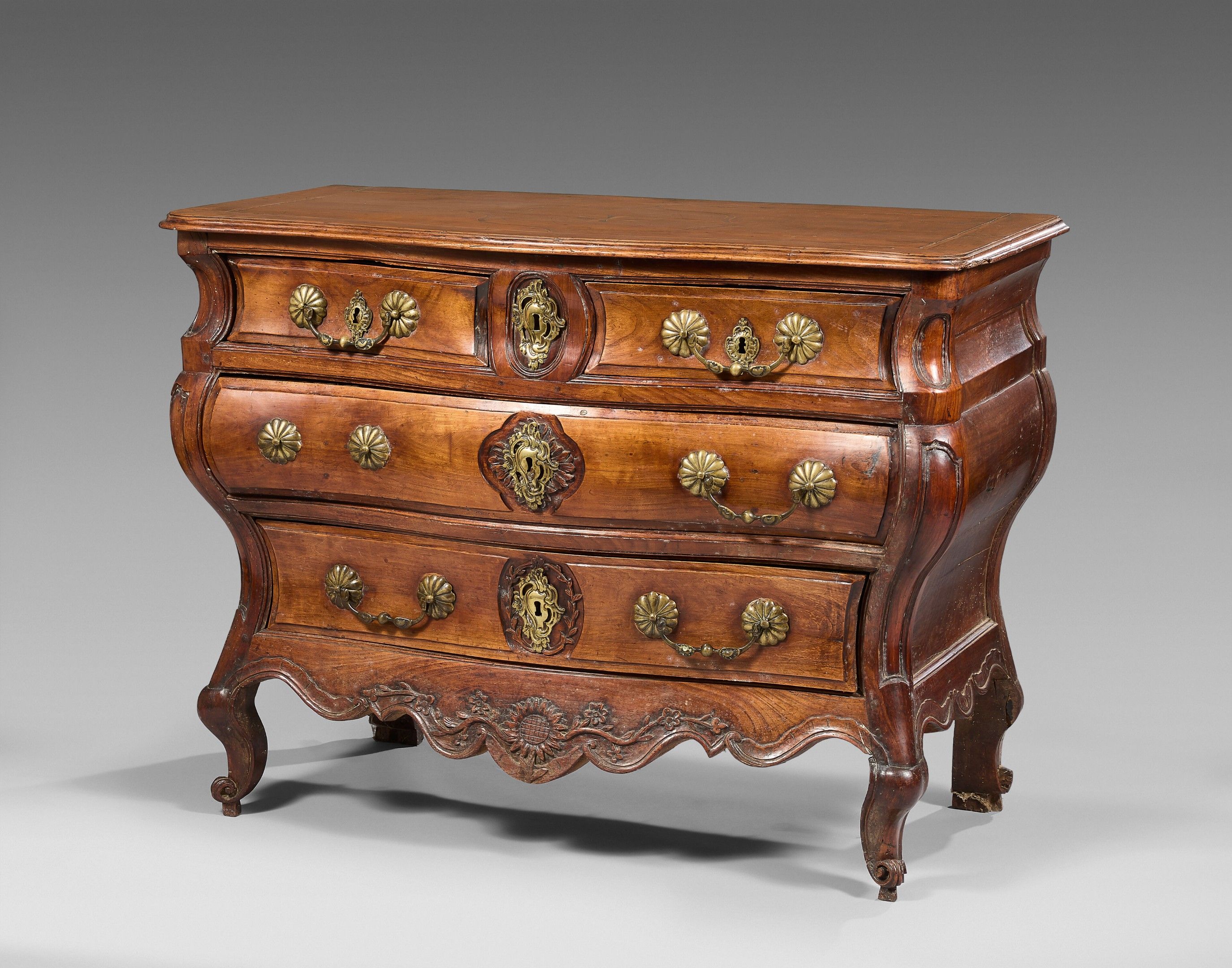 A walnut chest of drawers with four drawers in three rows, the top inlaid with a Maltese cross. The top is inlaid with a Maltese cross. The jambs protrude and the waist is carved with flowers and foliage.