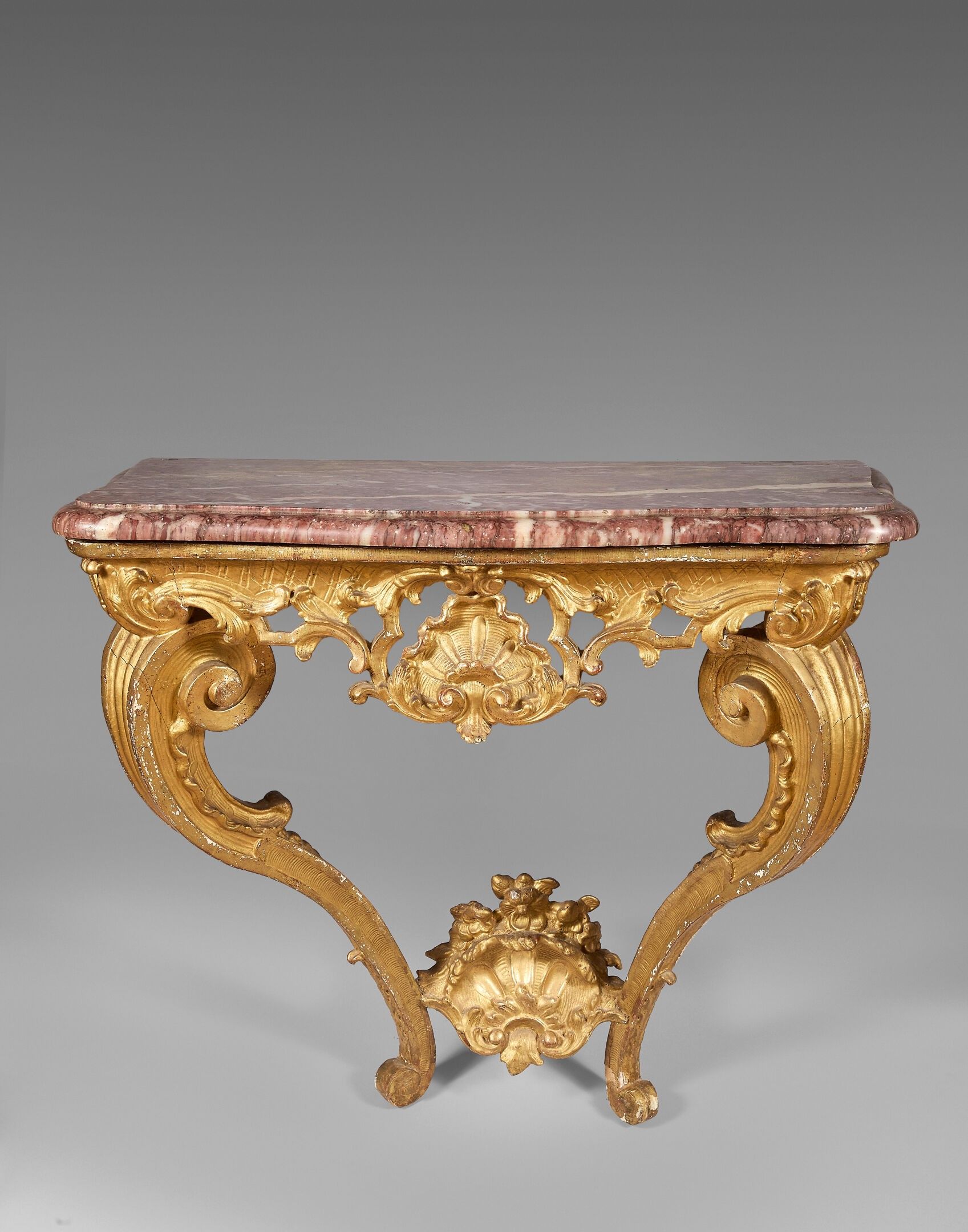 A gilded wood sconce console with an openwork scroll belt. Double crook legs. Belt and nuts carved with a stylised pomegranate. Pink veined marble top.