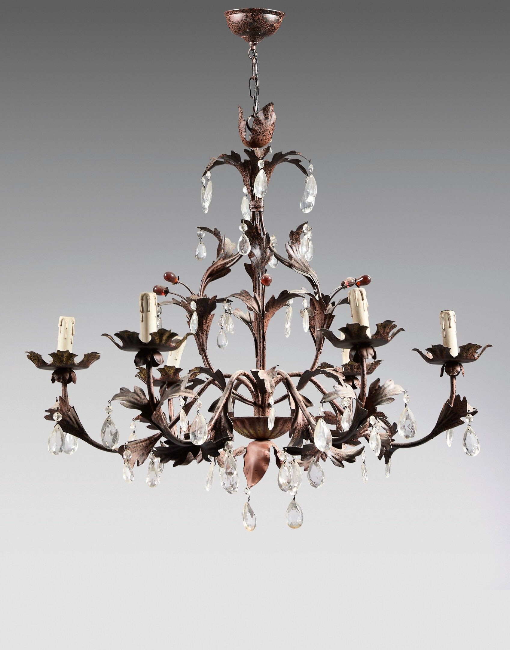 Sheet metal chandelier with six foliate lights adorned with pendants.