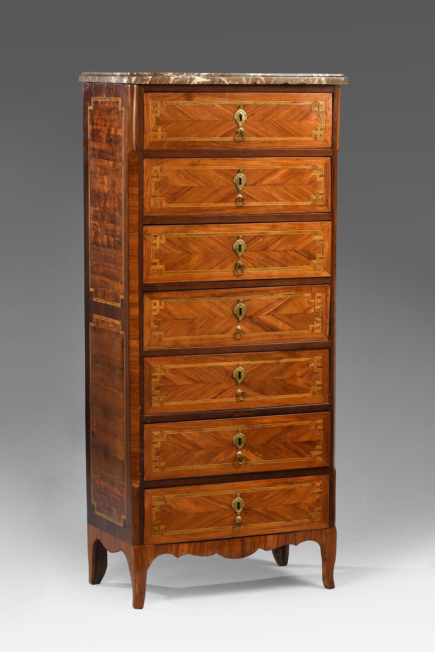 Fruitwood and amaranth veneered weekly cabinet opening to seven drawers decorated with Greek fillets.