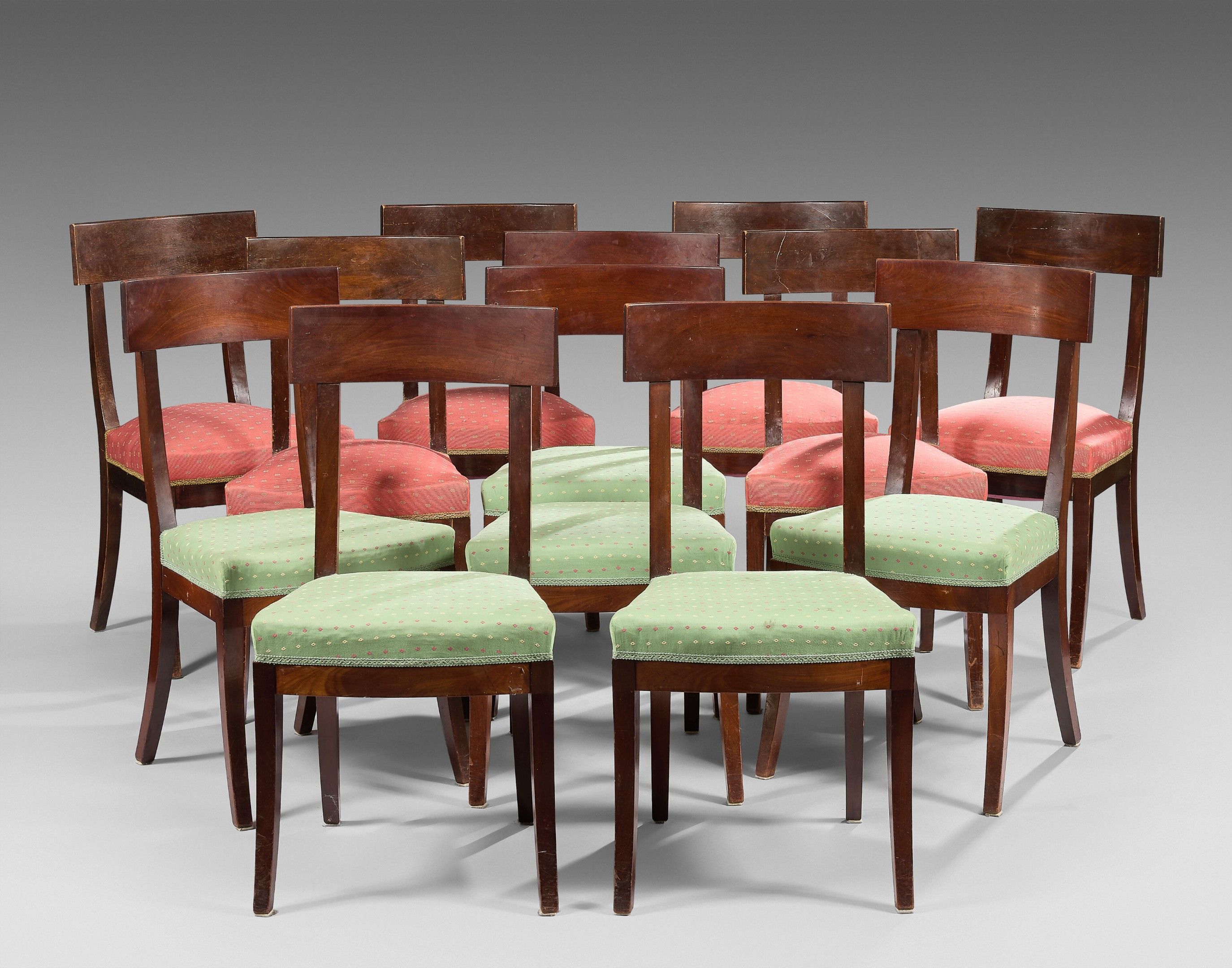 Premium Twelve stained walnut dining chairs with banded backs. Sabre…