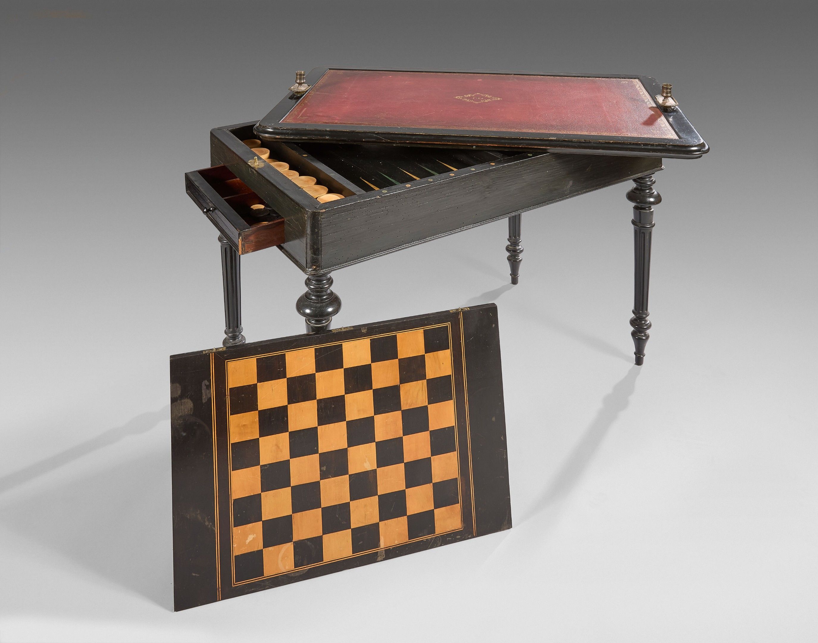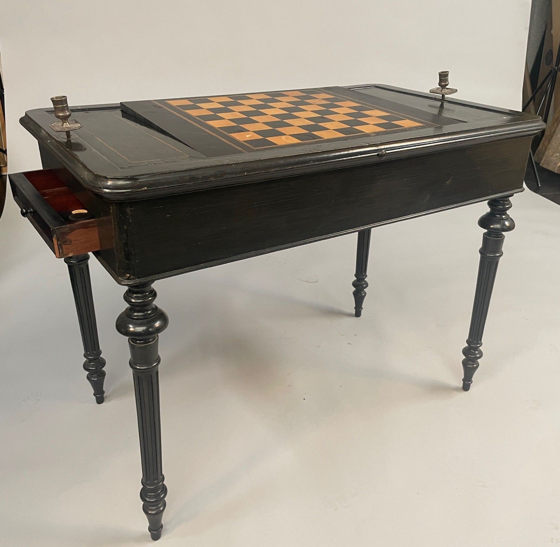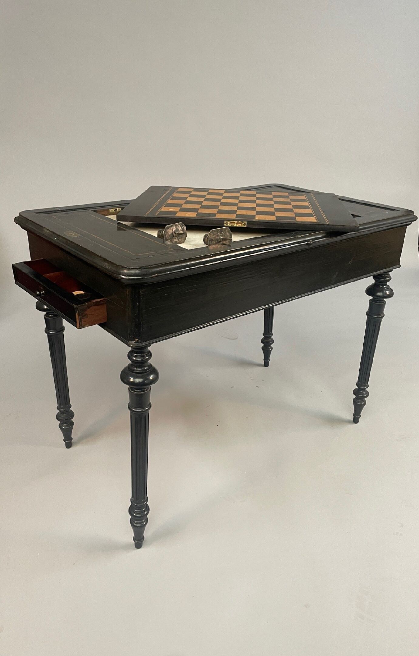 Blackened wood games table - complication desk opening with two side drawers. Removable and reversible top with checkerboard, chessboard, tric-trac, top in morocco and marble. Fluted legs.