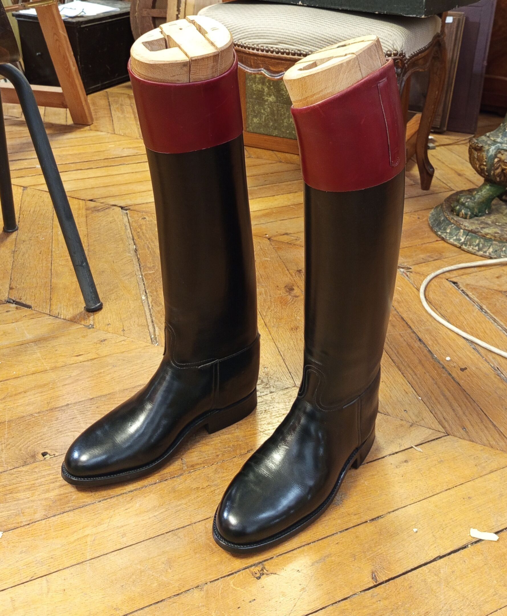 Pair of two-tone leather riding boots Size 38/39 unbranded With lasts and canvas bag. Height: 51 cm; Sole: 27.5 cm.