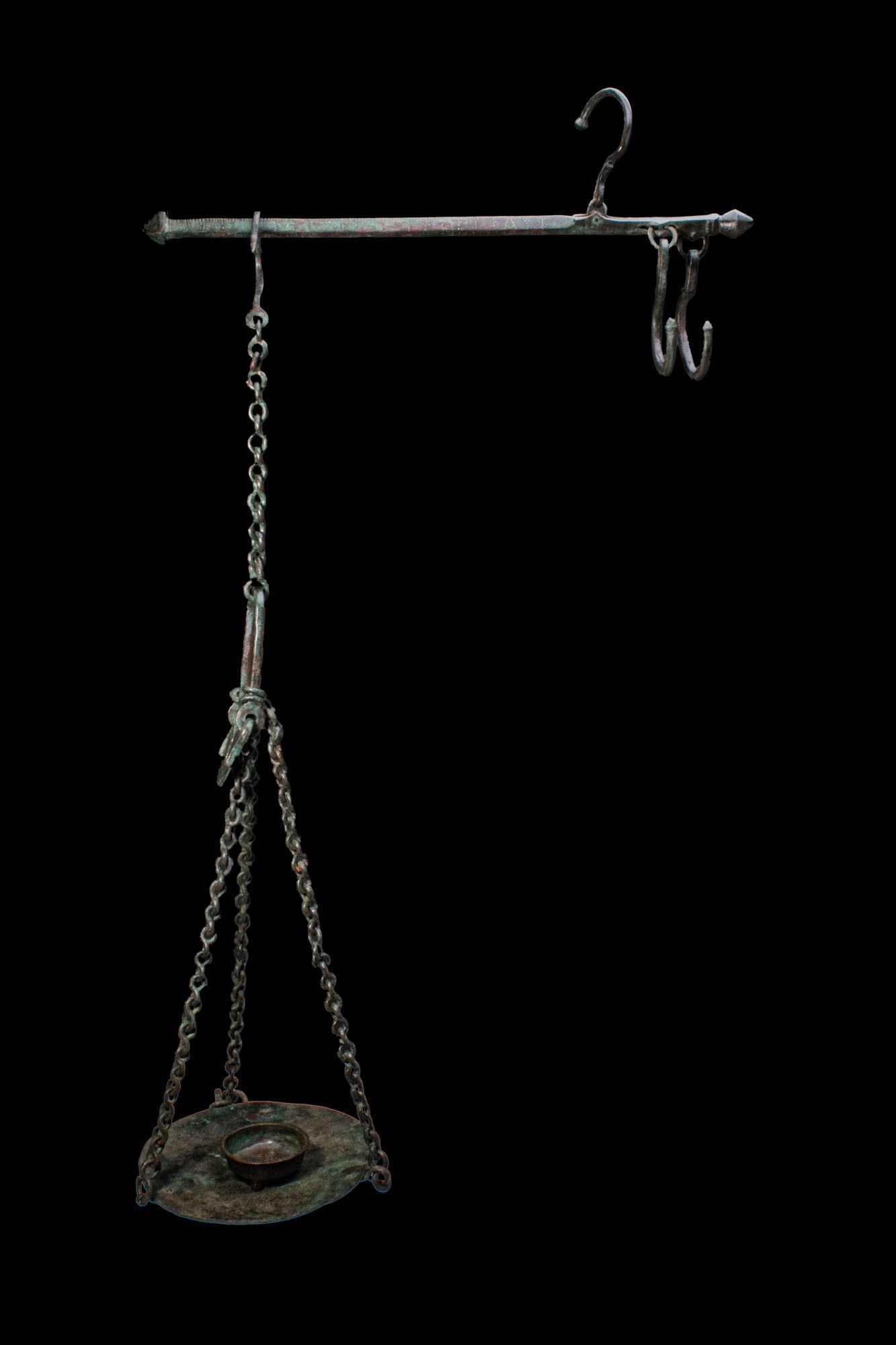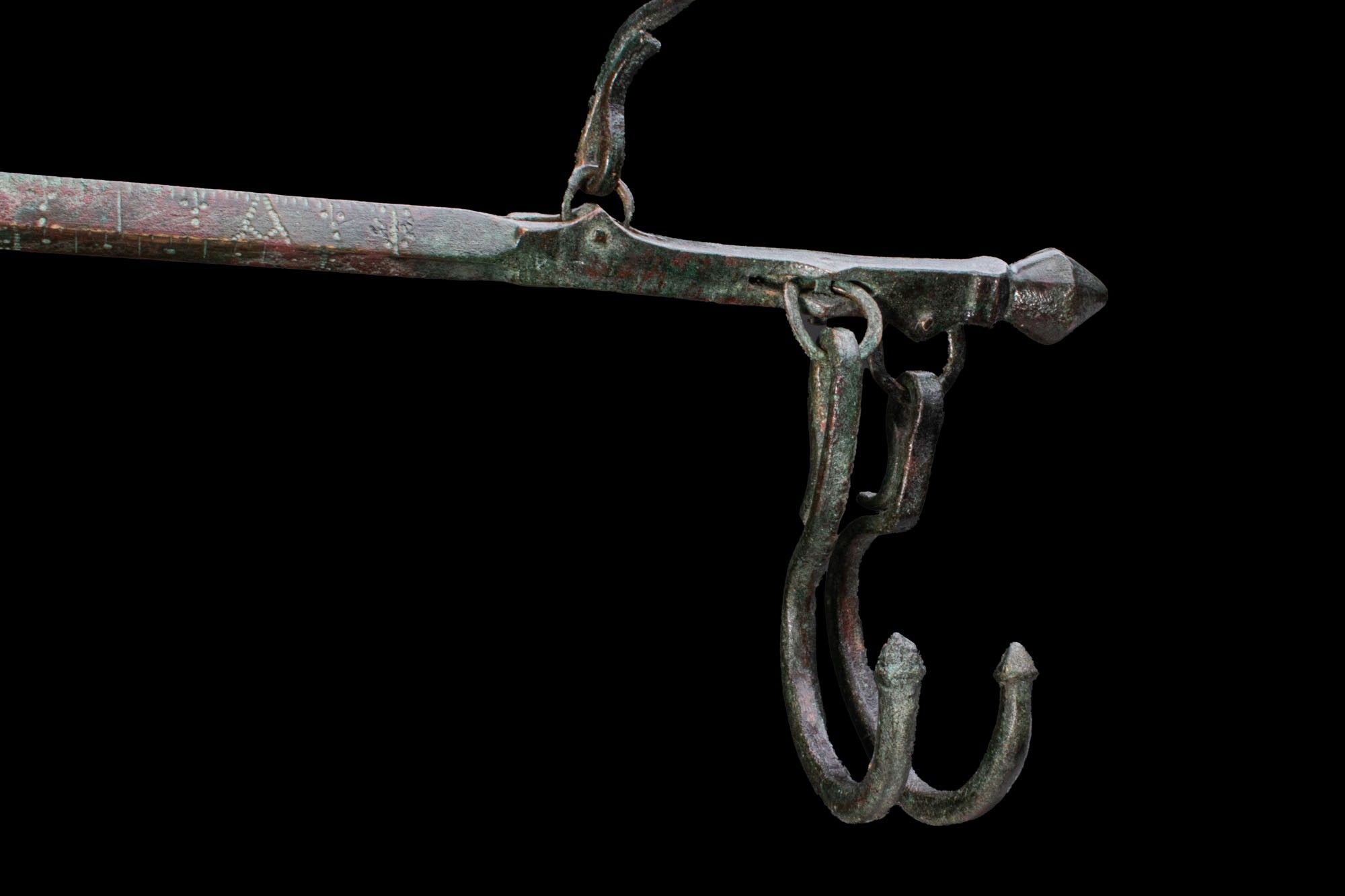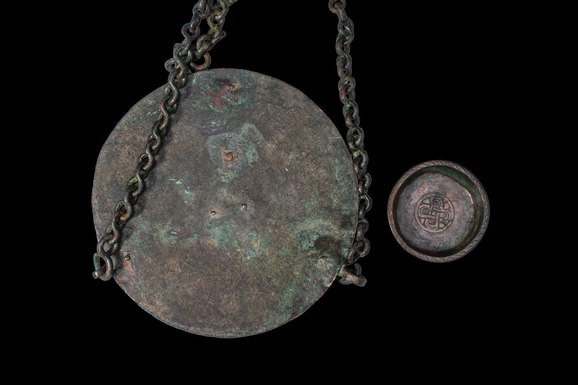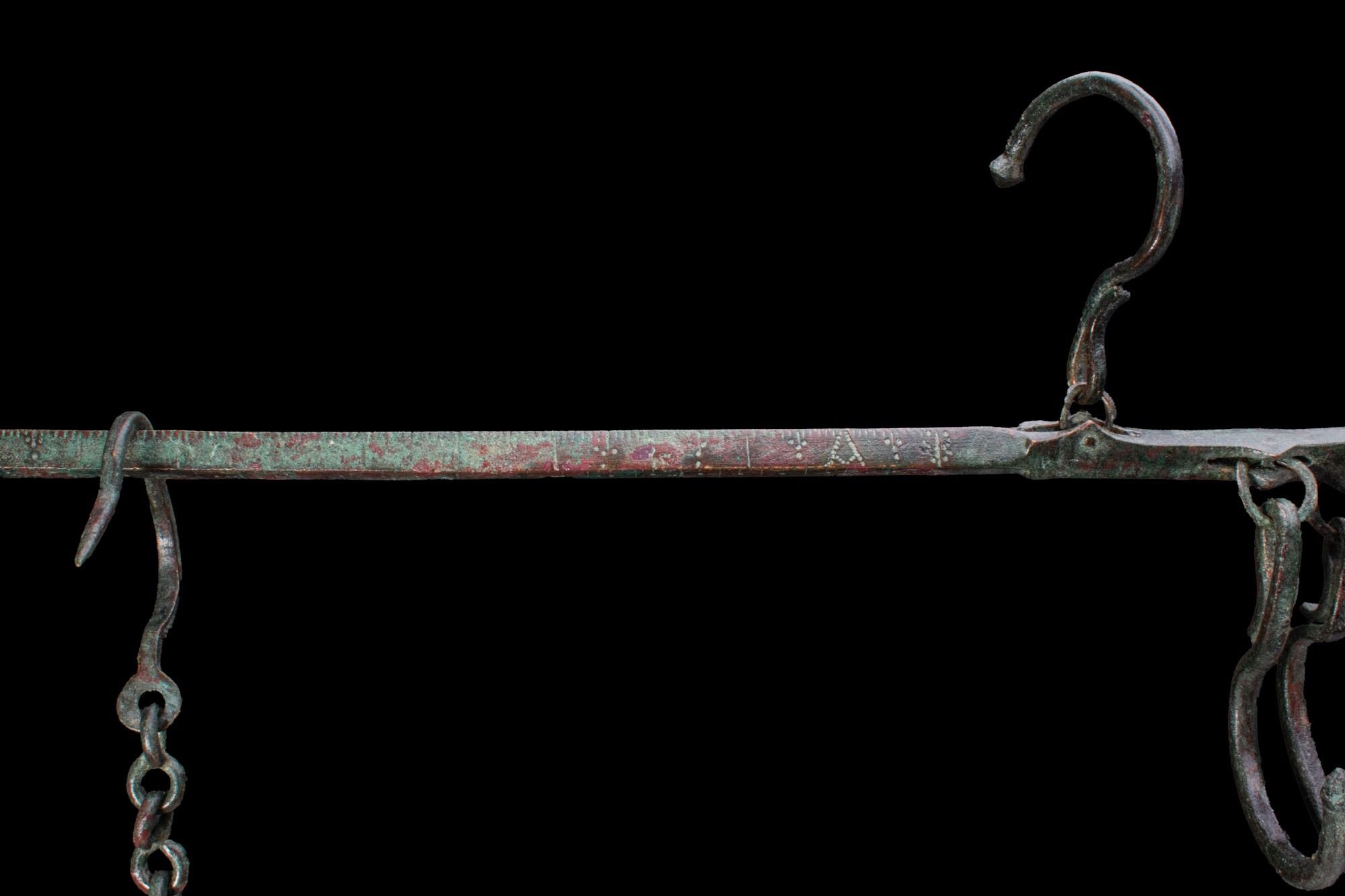 A bronze steelyard scale with a long faceted beam engraved with graduations and an inscription, the ends finished with pointed finials. Above the beam sits a pivoting suspension hook, with two sliding S-hooks for counterweights to the right. From a fixed hook hangs a triple chain supporting a circular plate. It is accompanied by a small bronze dish with an interlaced cross within a circular medallion.