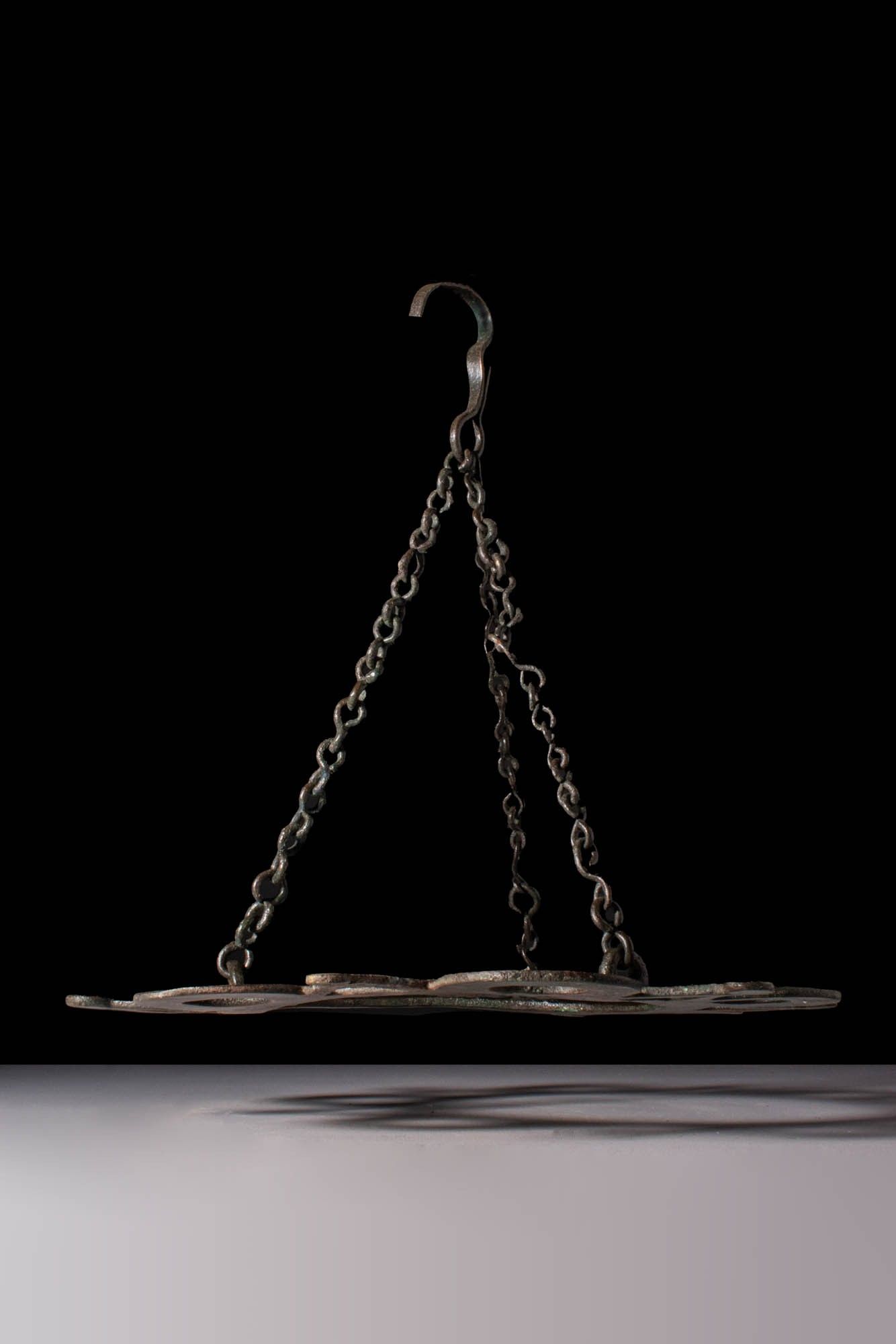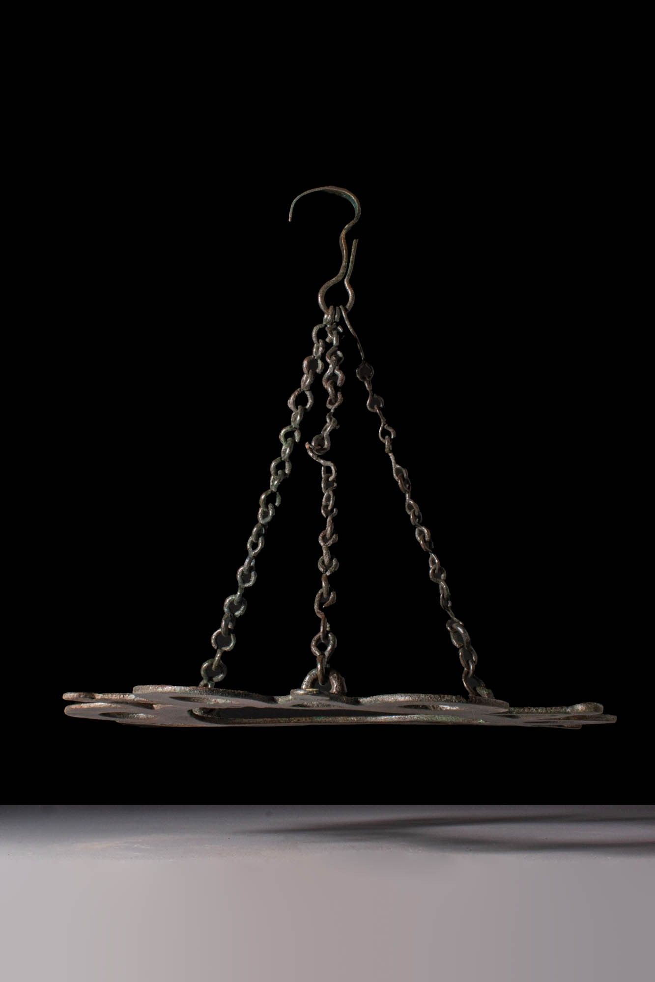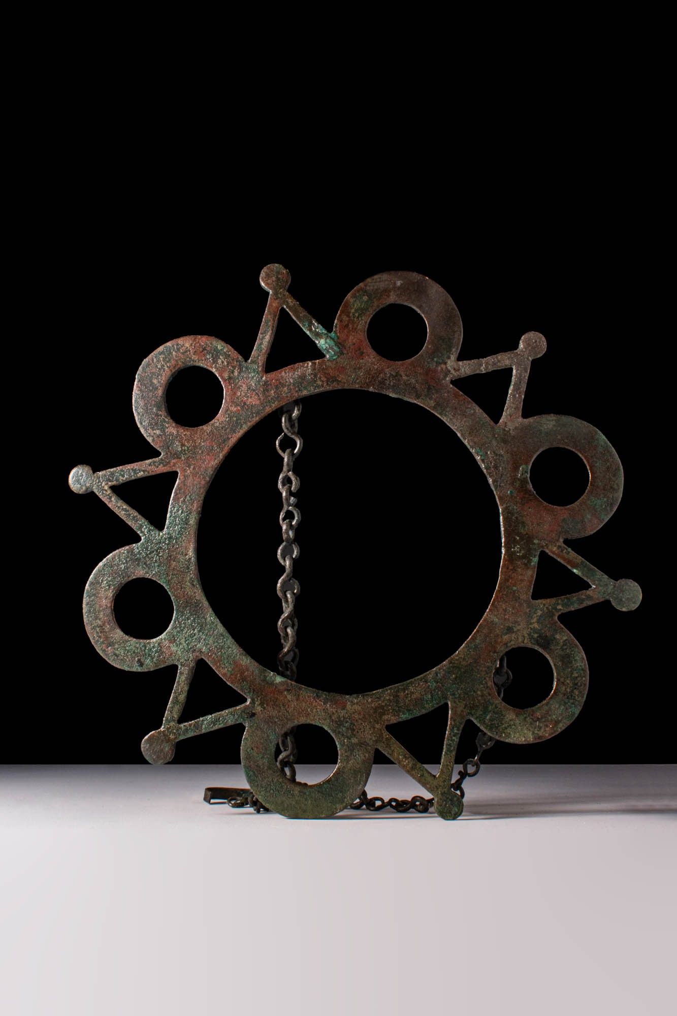Ca. AD 600. A bronze polycandelon formed of a flat, openwork disc with six evenly spaced large round apertures, interspersed with triangular projections with circular terminals. Suspension chains are attached at three points around the inner ring, converging in a central hook for hanging. Size: 275mm x 265mm; Weight: 755g Provenance: Private UK collection, acquired on the Dutch art market, pre 2000. This piece is accompanied by a historical report from Alessandro Neri, an international Cultural Heritage expert based in Florence, Italy. This item has been cleared against the Art Loss Register database and comes with a confirmation letter.