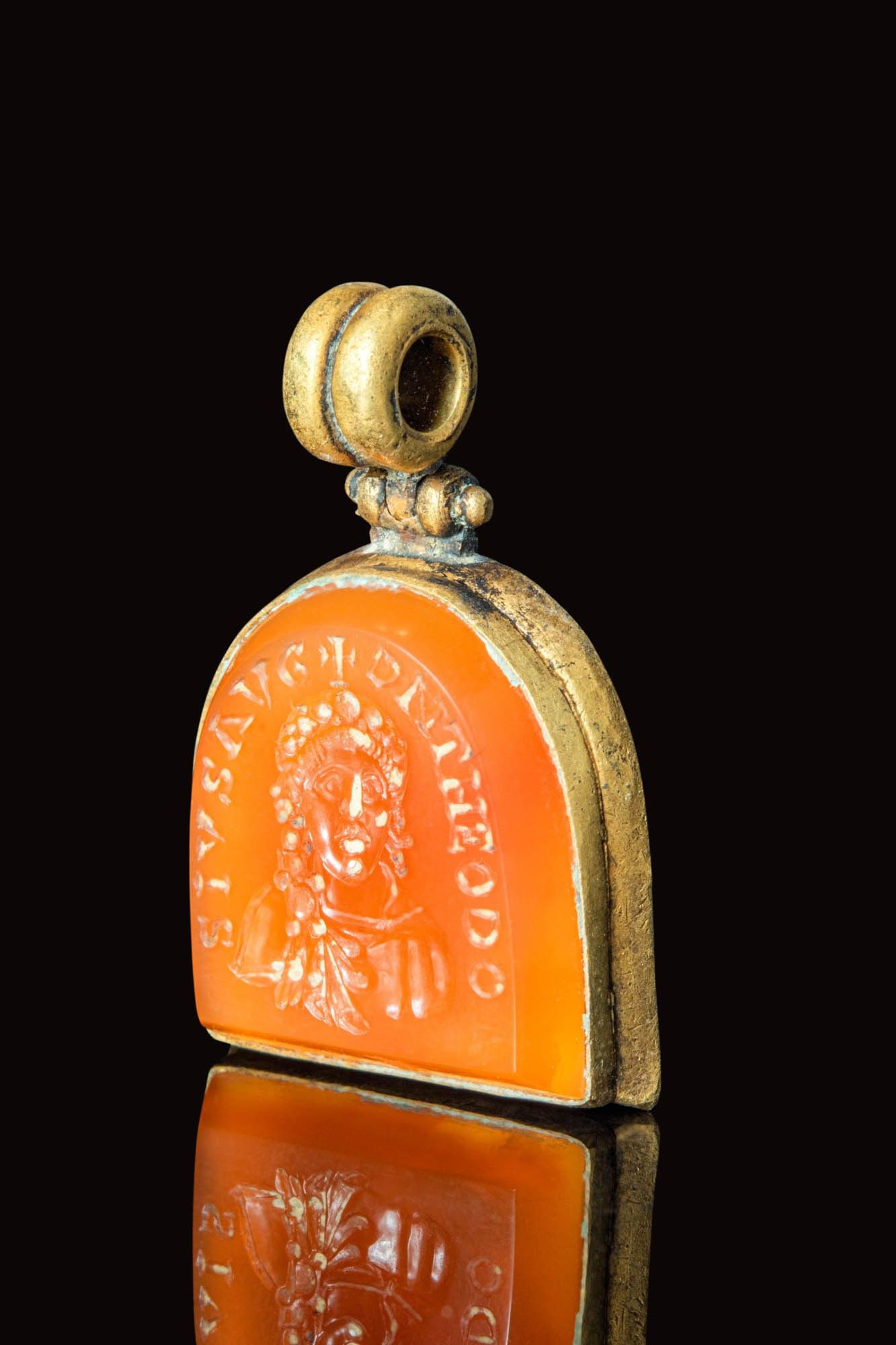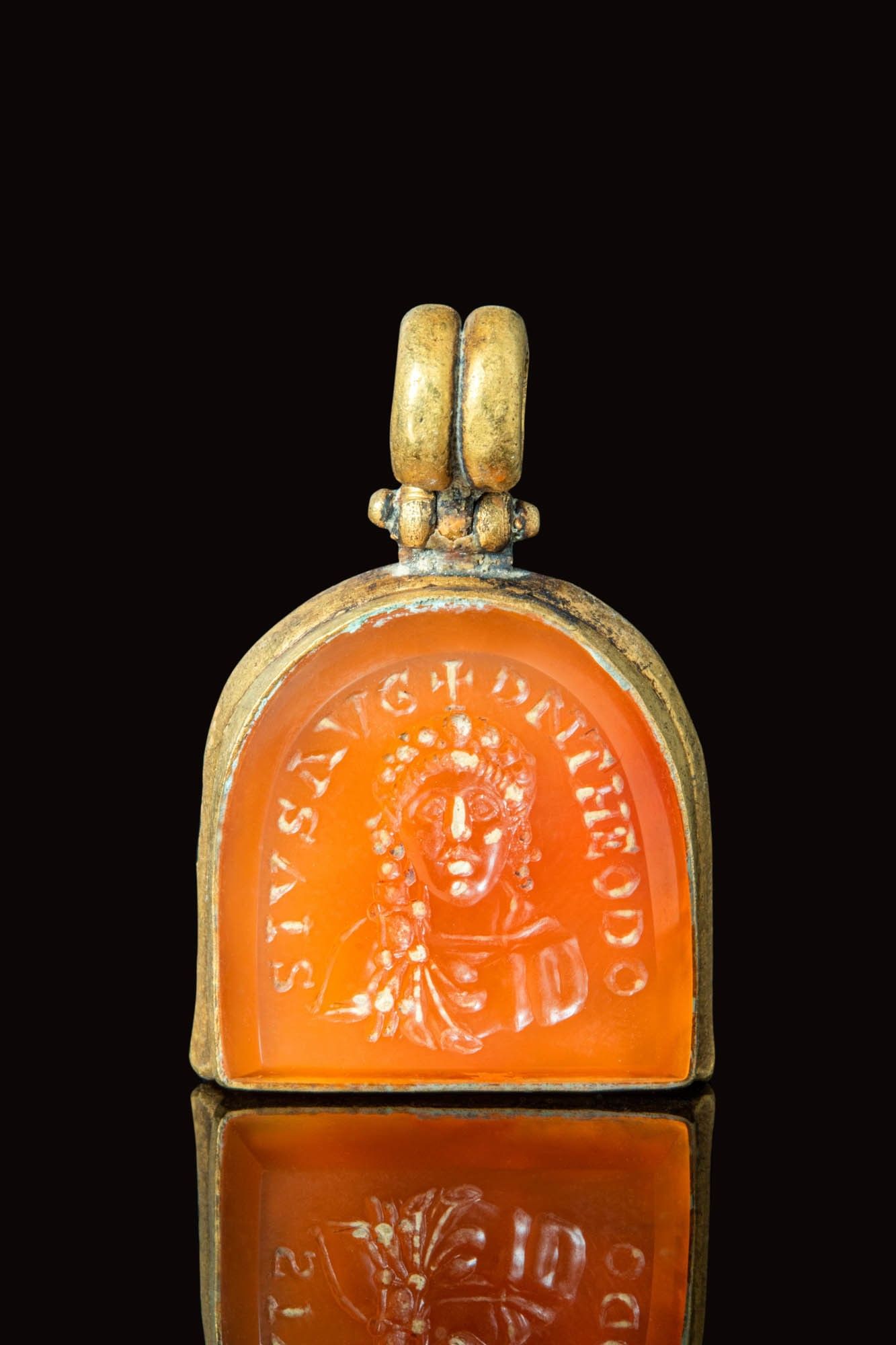 RARE BYZANTINE GOLD PENDANT WITH CARNELIAN INTAGLIO DEPICTING THEODOSIUS.