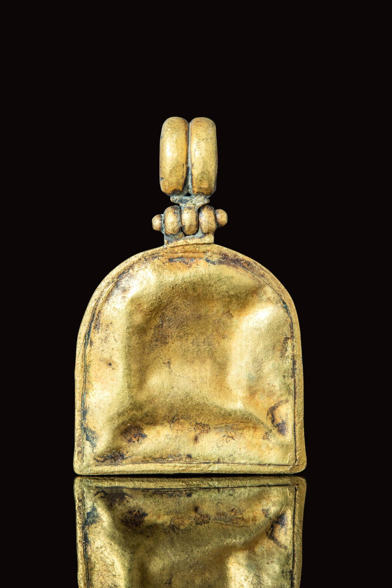 Ca. AD 370 - 450. A Byzantine gold pendant in the shape of a bell, that secures a large carnelian intaglio. The intaglio depicts the Byzantine emperor, Theodosius. The figure is shown in profile, dressed in a long tunic wearing a crown; the facial features are typical of the early Byzantine period. The bust is surrounded by an inscription with a cross at the centre. On the top of the pendant is a double hoop. For similar see: MET Museum Accession Number: 04.35.18. Size: 30mm x 20mm; Weight: 10g Provenance: Property of a North London gentleman; previously acquired on the UK/European art market in the 1980s. This item has been cleared against the Art Loss Register database and comes with a confirmation letter.