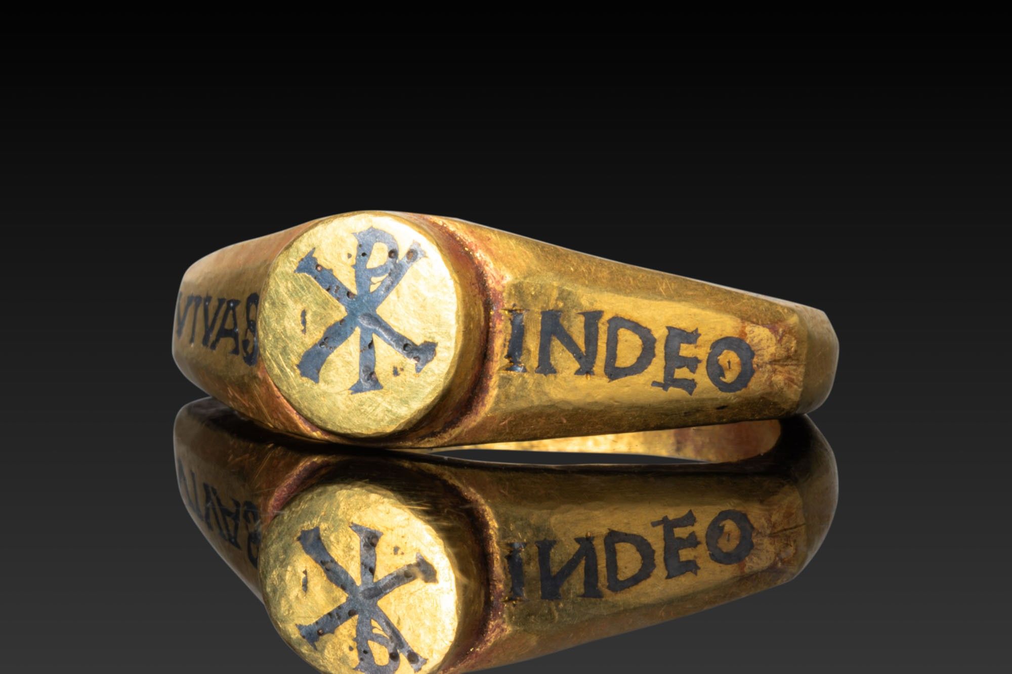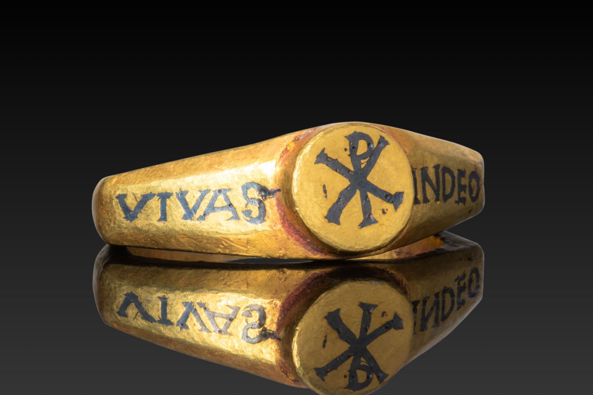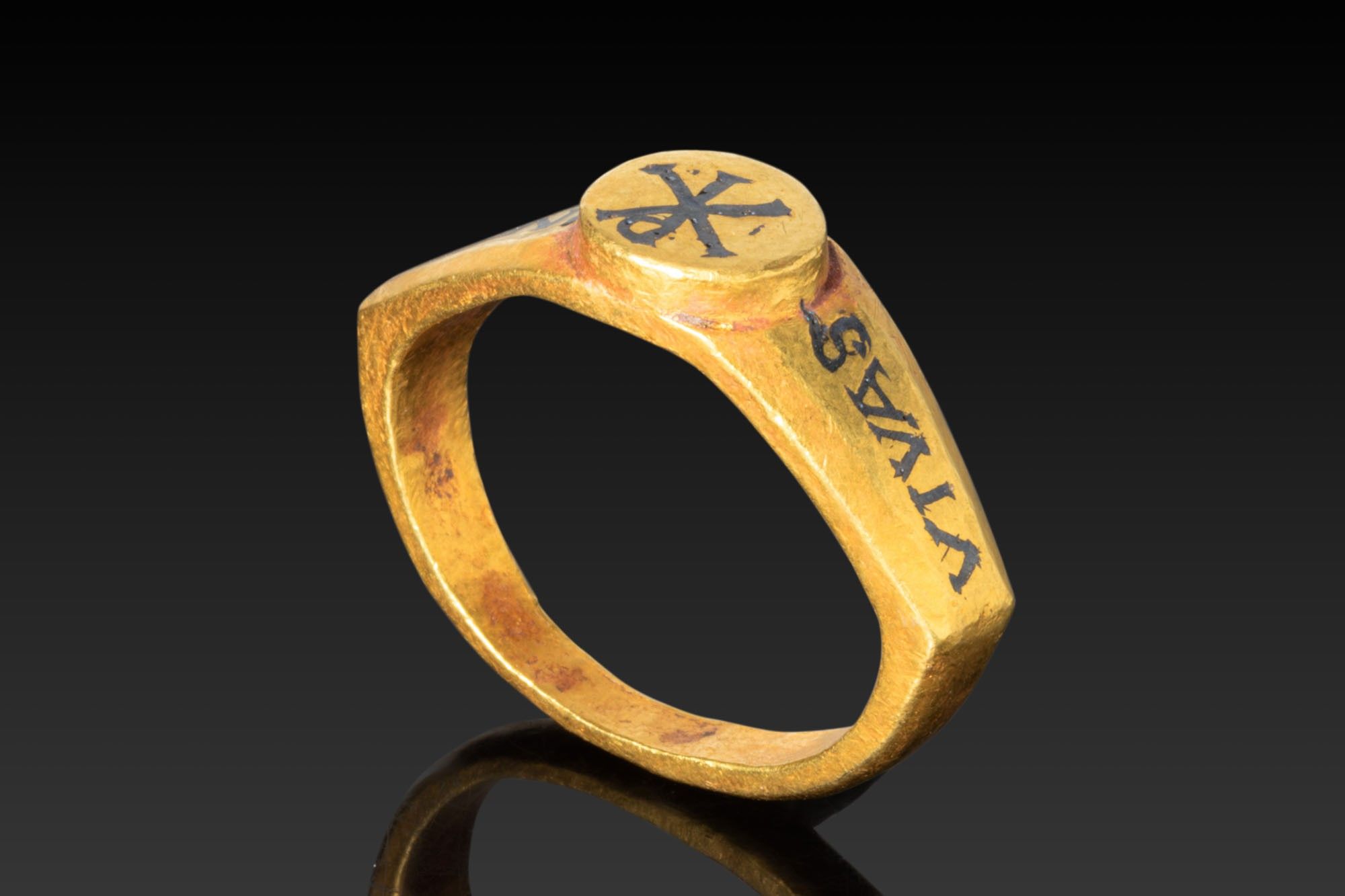 BYZANTINE GOLD AND NIELLO RING WITH INSCRIPTION 'VIVAS IN DEO' AND CHI-RHO.
