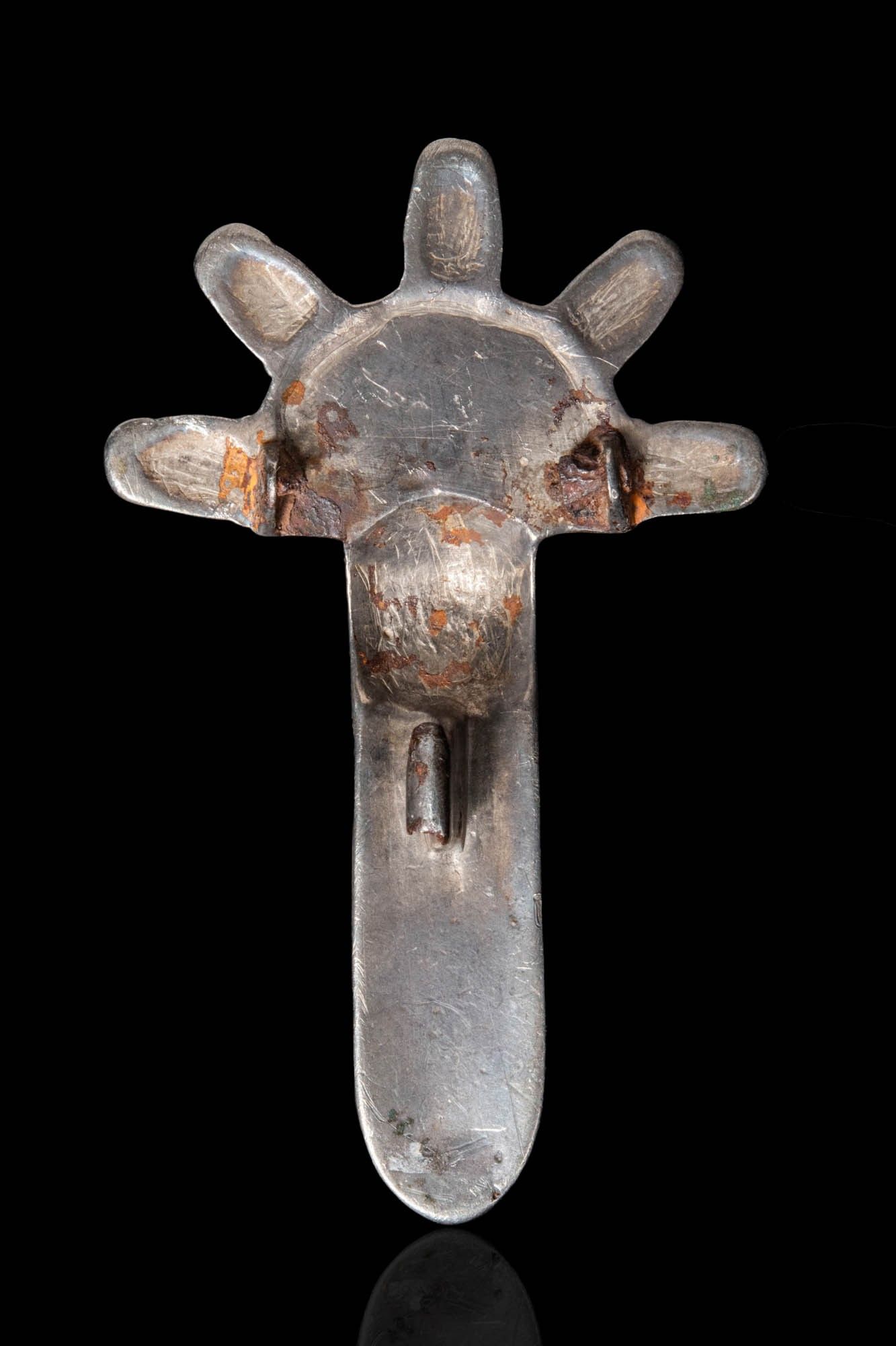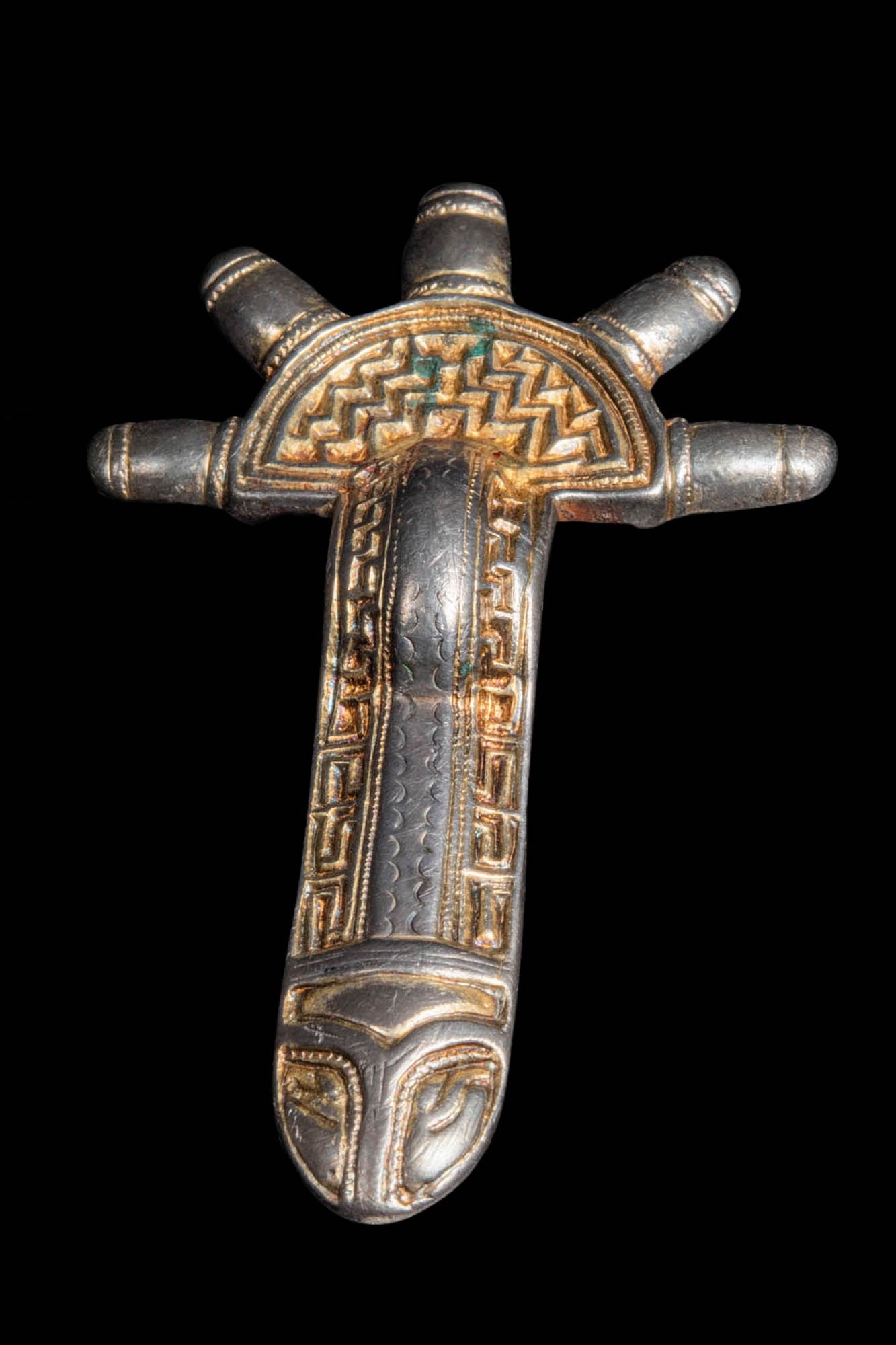 Ca. AD 480 - 530. A silver-gilt brooch with engraved motifs on its main section. The brooch has a rectangular central part with a prominent ridge and meander patterns. The bottom of the design is shaped like a stylised animal muzzle, while the top is hemispherical and adorned with a geometric line pattern. The brooch is topped with five protruding knots. For similar see: Early Merovingian Women’s Brooches, Max Martin, n. 20.7 , p. 229. Provenance: London collection; Ex. Mayfair collection, acquired from an Ancient Art gallery; formerly acquired on the London art market pre-2000. This item has been cleared against the Art Loss Register database and comes with a confirmation letter.