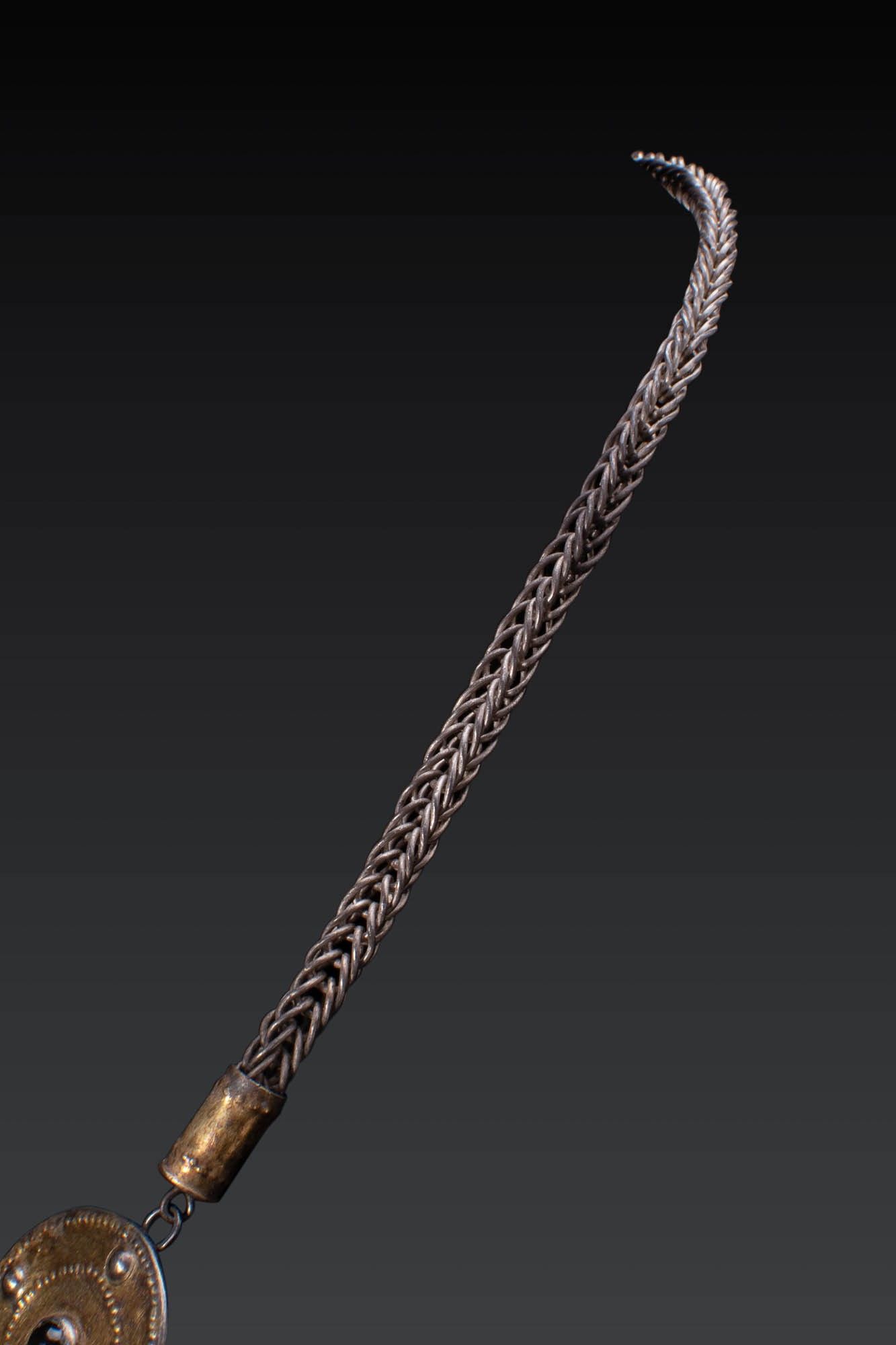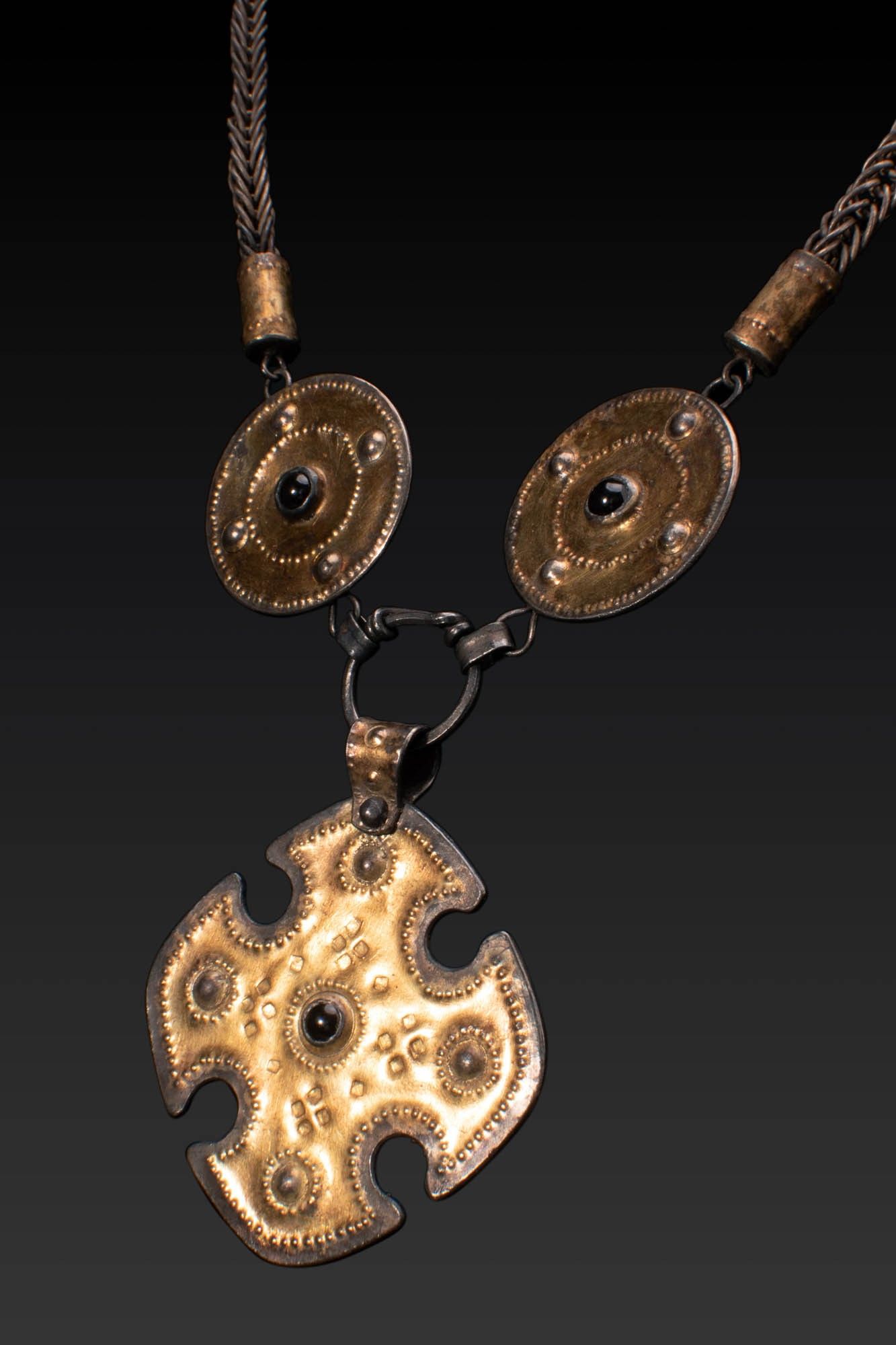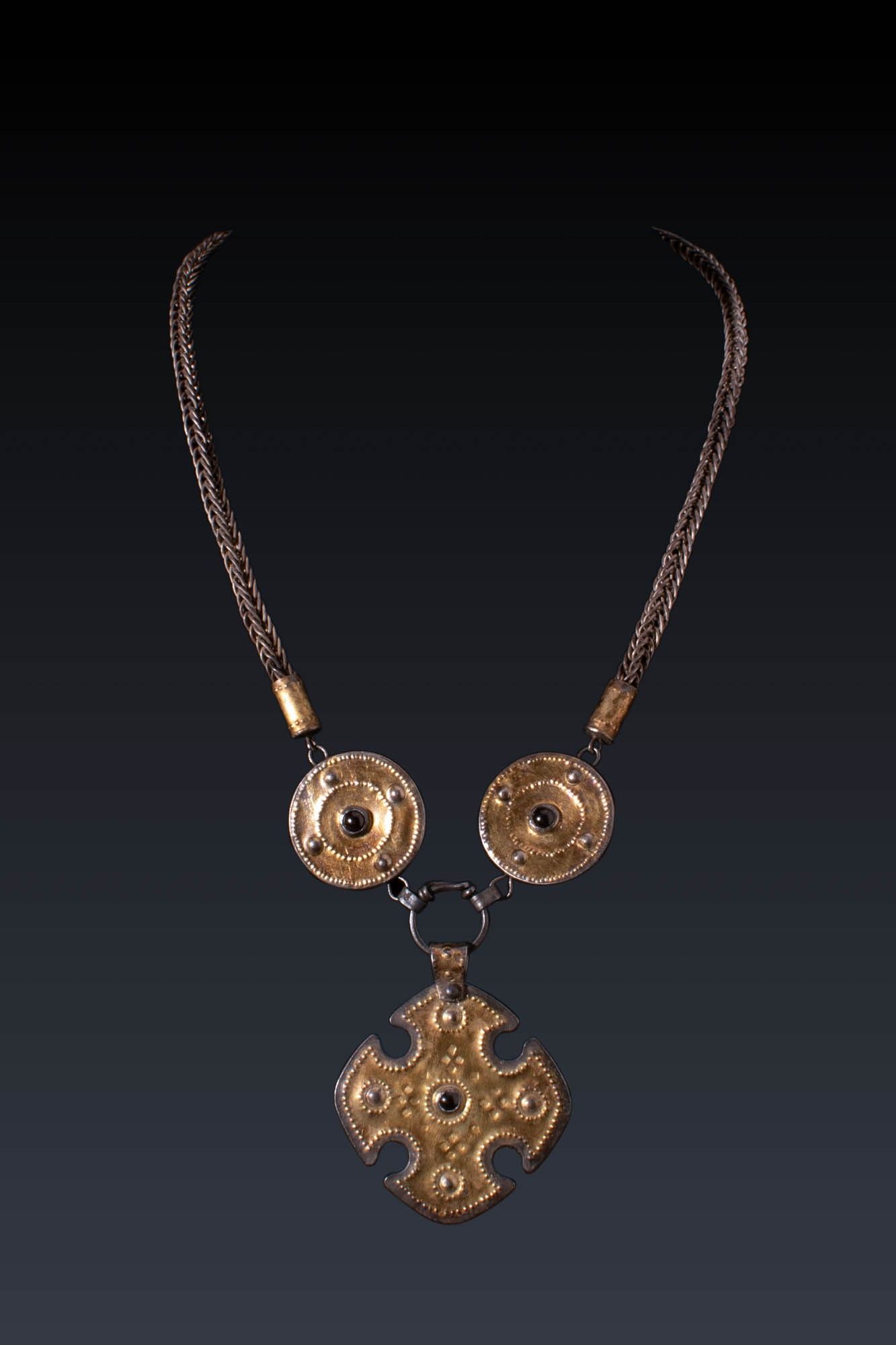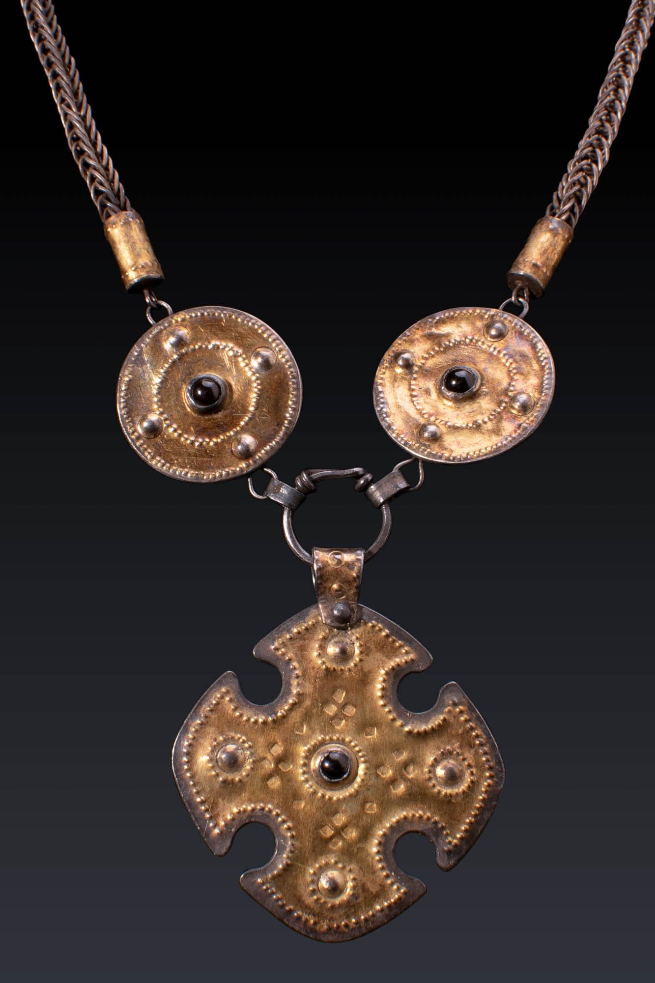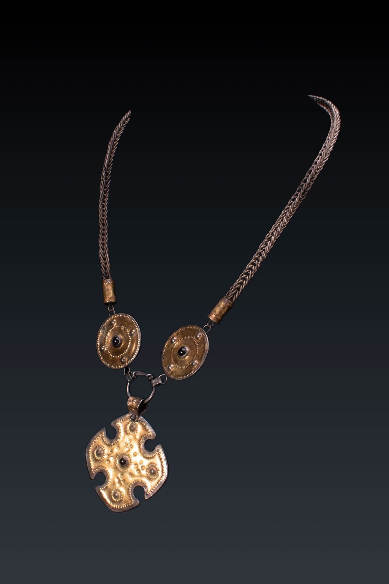 Ca. AD 400 - 600. A silver-gilt necklace comprising a woven chain terminating in cylindrical collars and joined to two large discoid elements, each with a central garnet cabochon and punched decorative border. Suspended below is a cross-shaped pendant with concave sides and broad, rounded terminals, similarly decorated with a central garnet and raised circular motifs surrounded by punched ornamentation. For similar see: The British Museum, Museum number 2007,8001.1 (cross shape). Size: 400/800mm x 50mm; Weight: 85g Provenance: Private London collection, acquired on the German art market, 1990s. This piece is accompanied by a historical report from Alessandro Neri, an international Cultural Heritage expert based in Florence, Italy. This item has been cleared against the Art Loss Register database and comes with a confirmation letter.