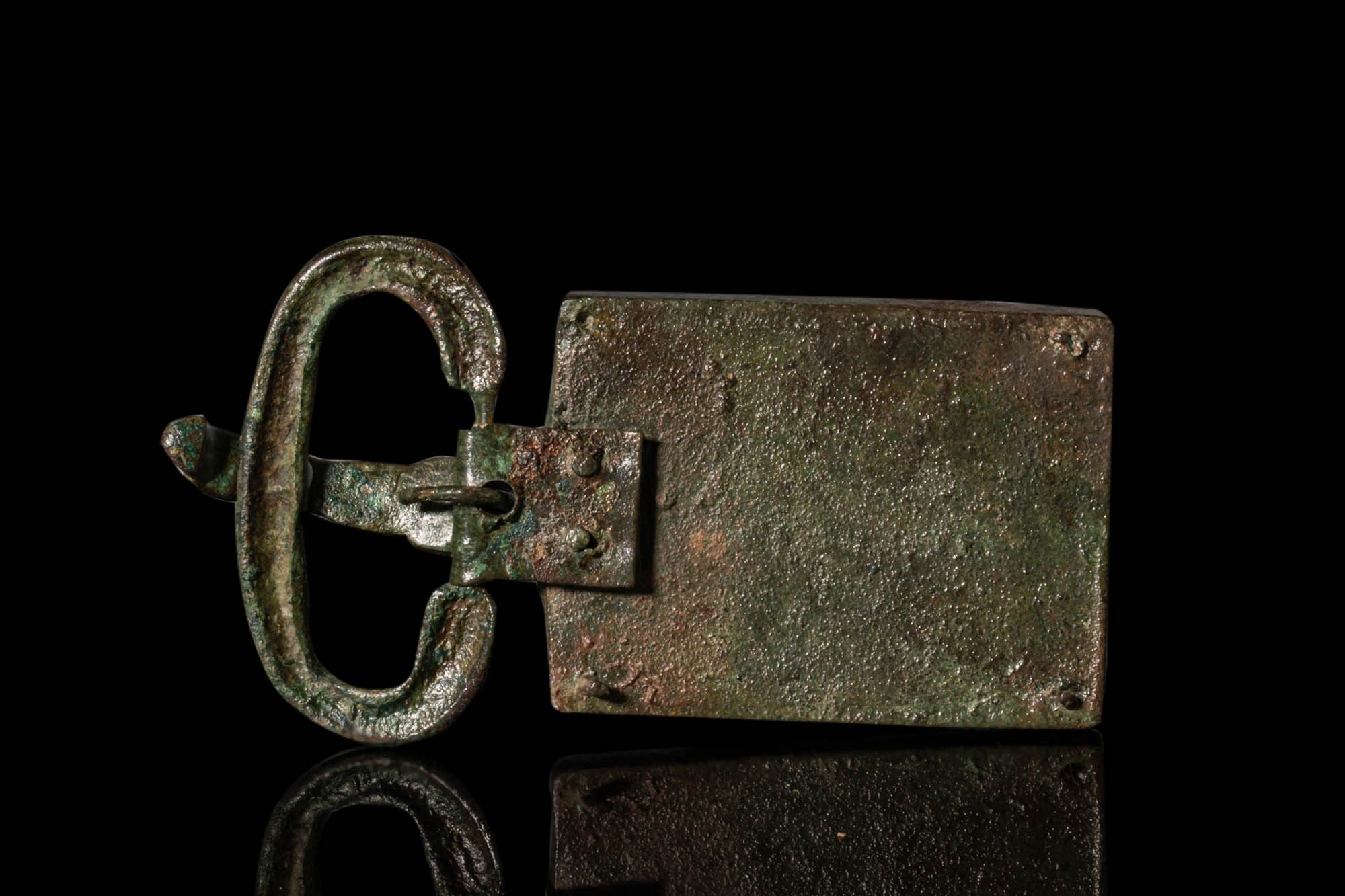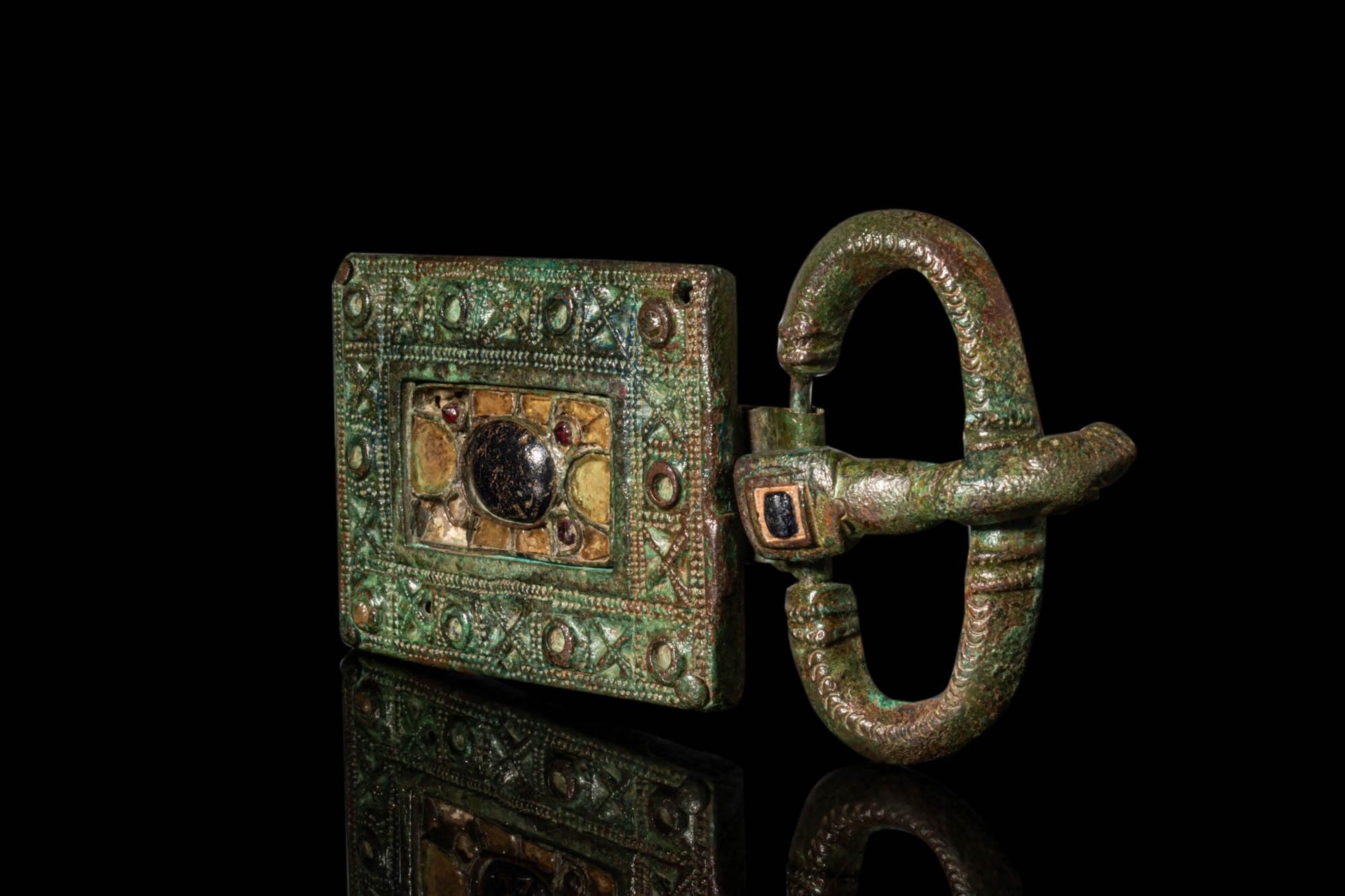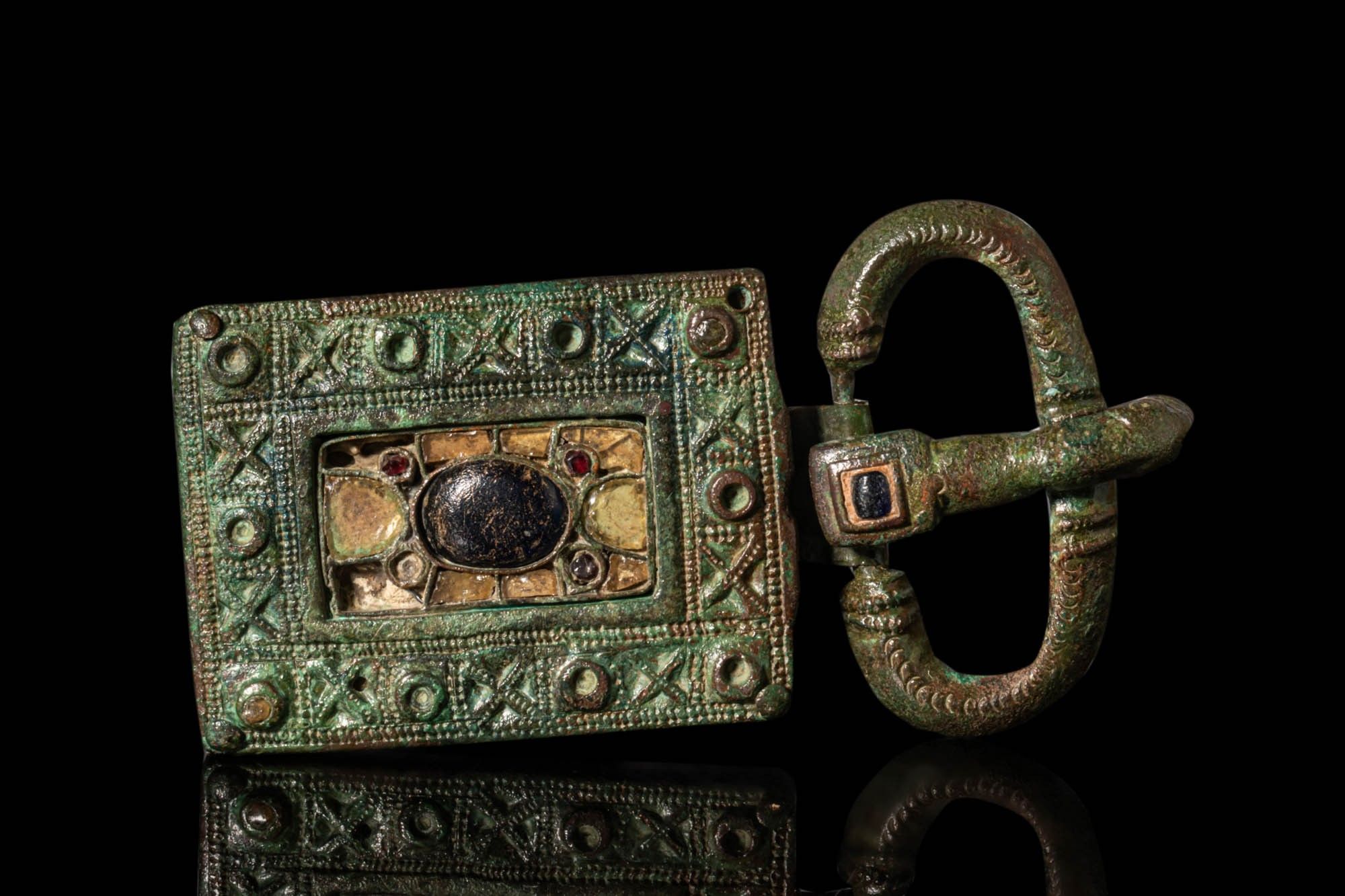 LARGE MEROVINGIAN INLAID BRONZE BELT BUCKLE WITH CENTRAL CAB…
