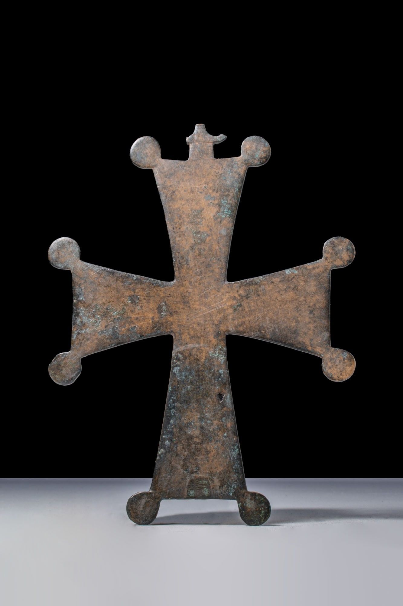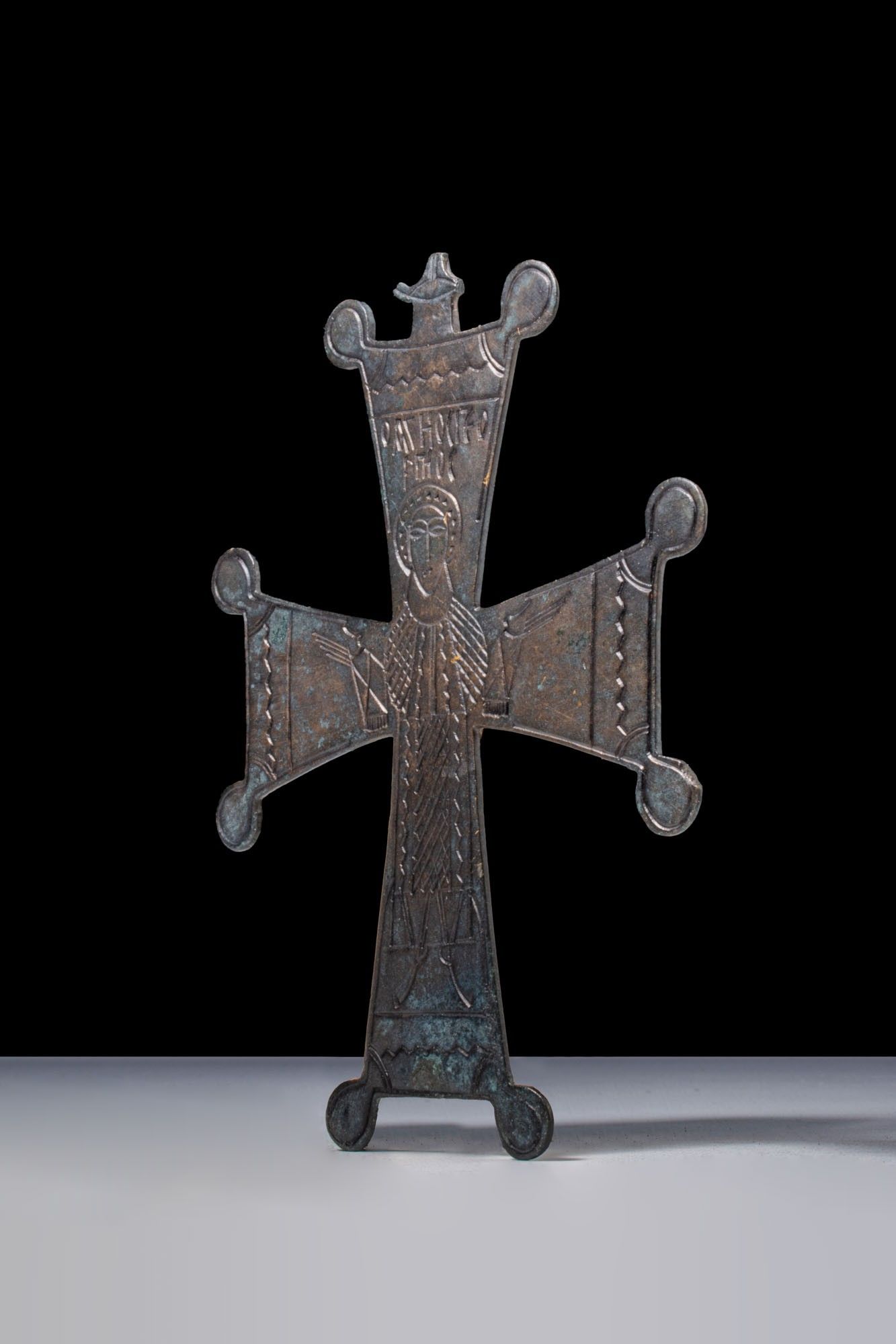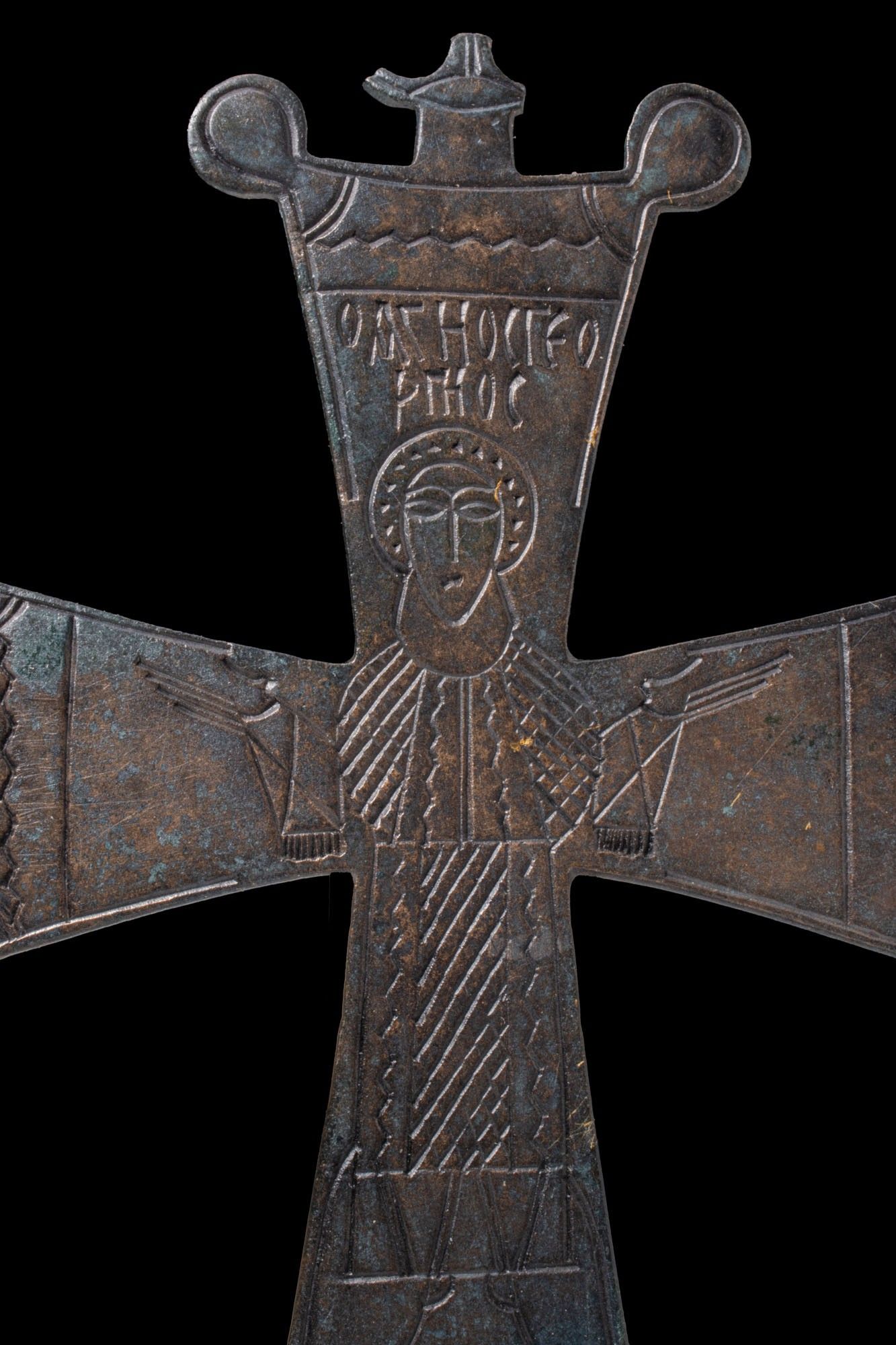 BYZANTINE BRONZE PROCESSIONAL CROSS DEPICTING HALOED SAINT W…