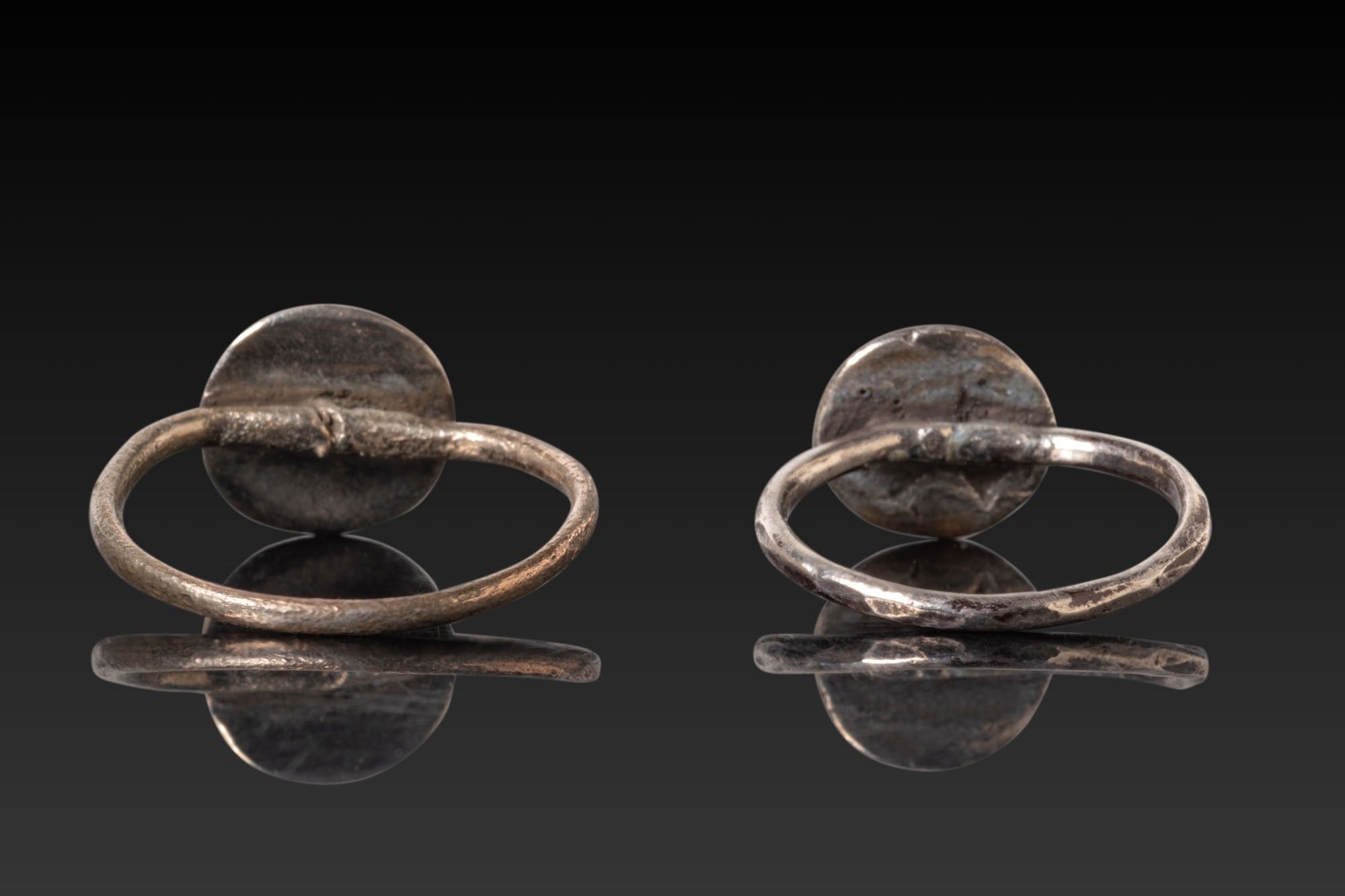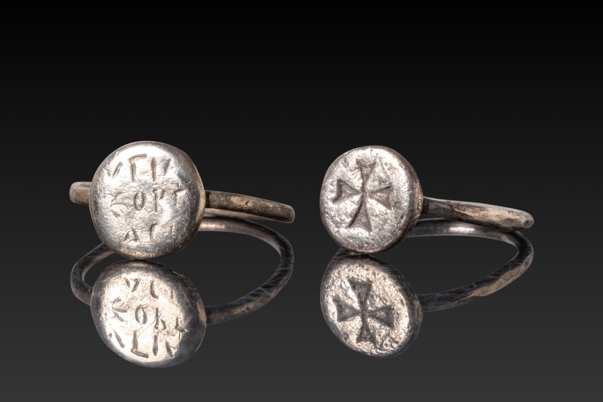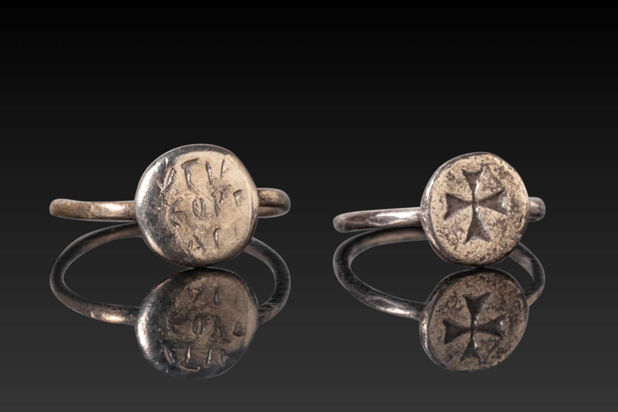 PAIR OF SILVER BYZANTINE RINGS WITH INSCRIPTION AND CROSS. C…
