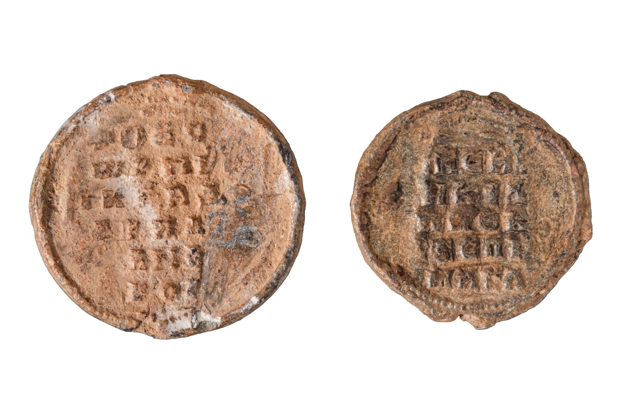 A pair of lead bullae, each struck with the facing bust of a haloed saint within a raised border. The reverses with multi-line Greek inscriptions.