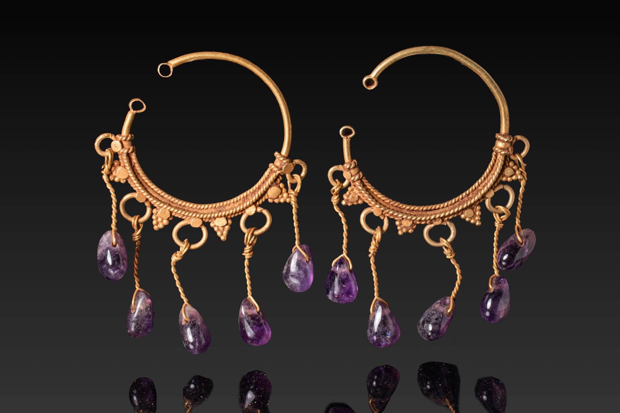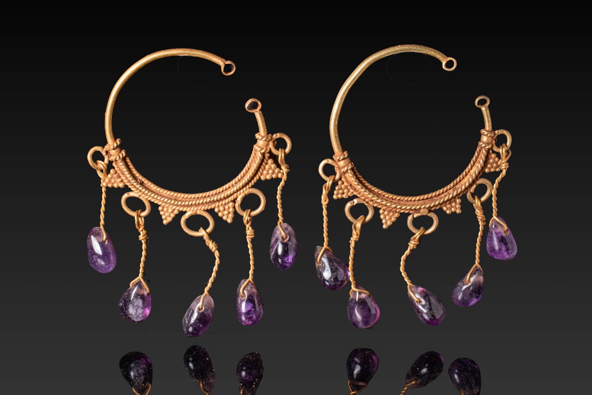 A matched pair of gold earrings composed of circular hoops supporting crescent-shaped panels adorned with granulated and twisted wire decoration. Each is fitted with five teardrop-shaped amethyst beads, individually mounted on fine gold wires and suspended from looped elements along the lower edge of the crescent.