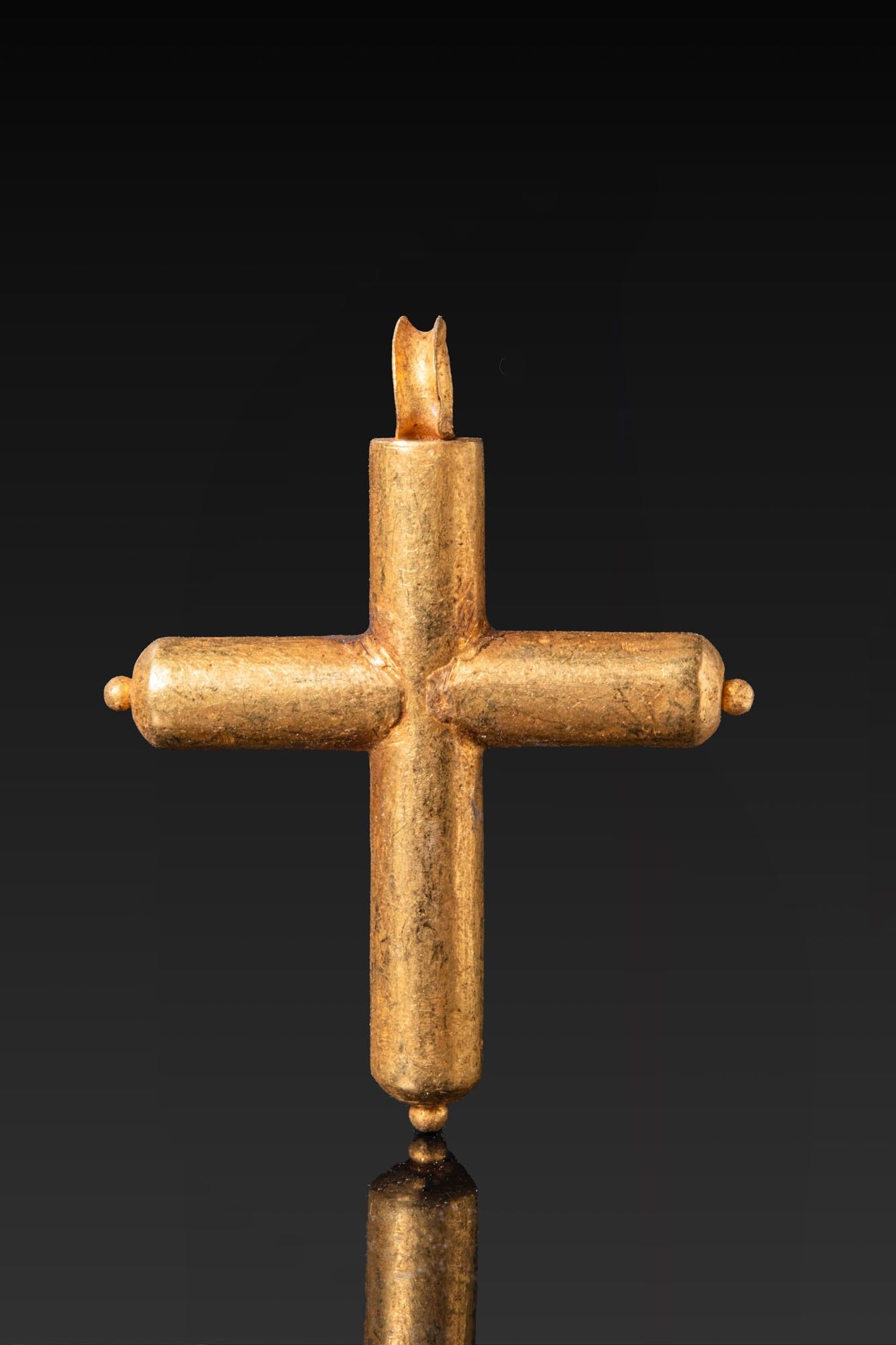Premium EARLY BYZANTINE GOLD CROSS PENDANT WITH RED GARNET CABOCHON.…