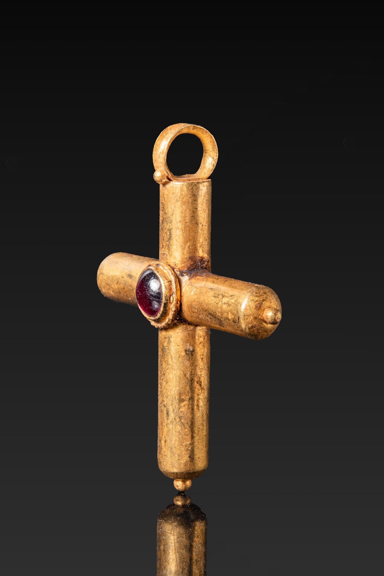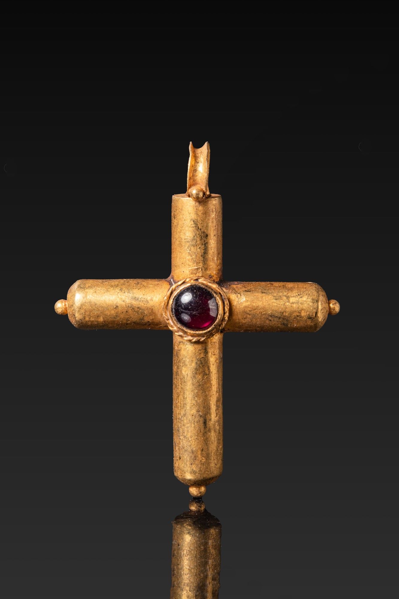 EARLY BYZANTINE GOLD CROSS PENDANT WITH RED GARNET CABOCHON.…