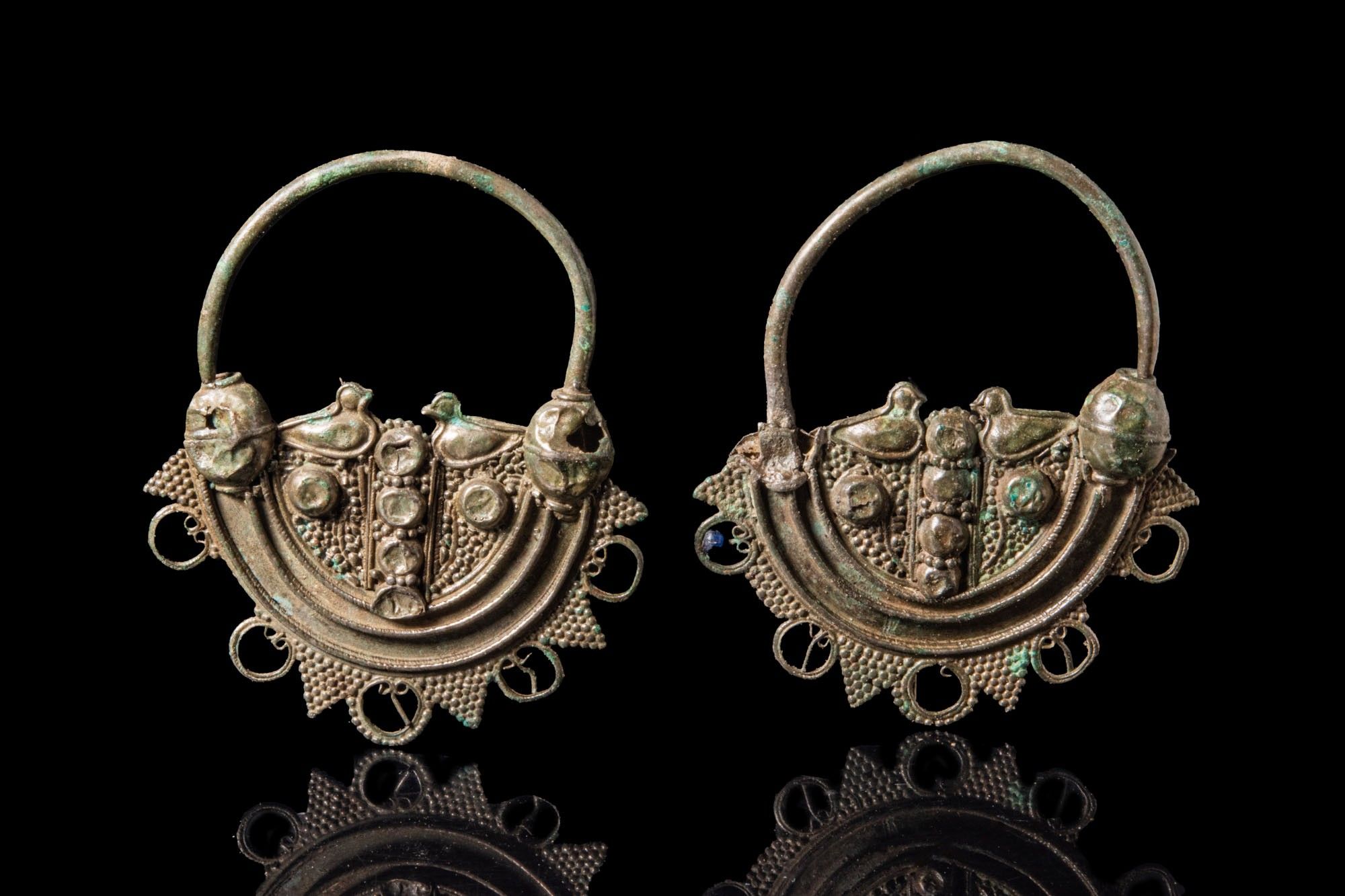 MATCHED PAIR OF BYZANTINE BRONZE OPENWORK EARRINGS WITH HOLY DOVES.