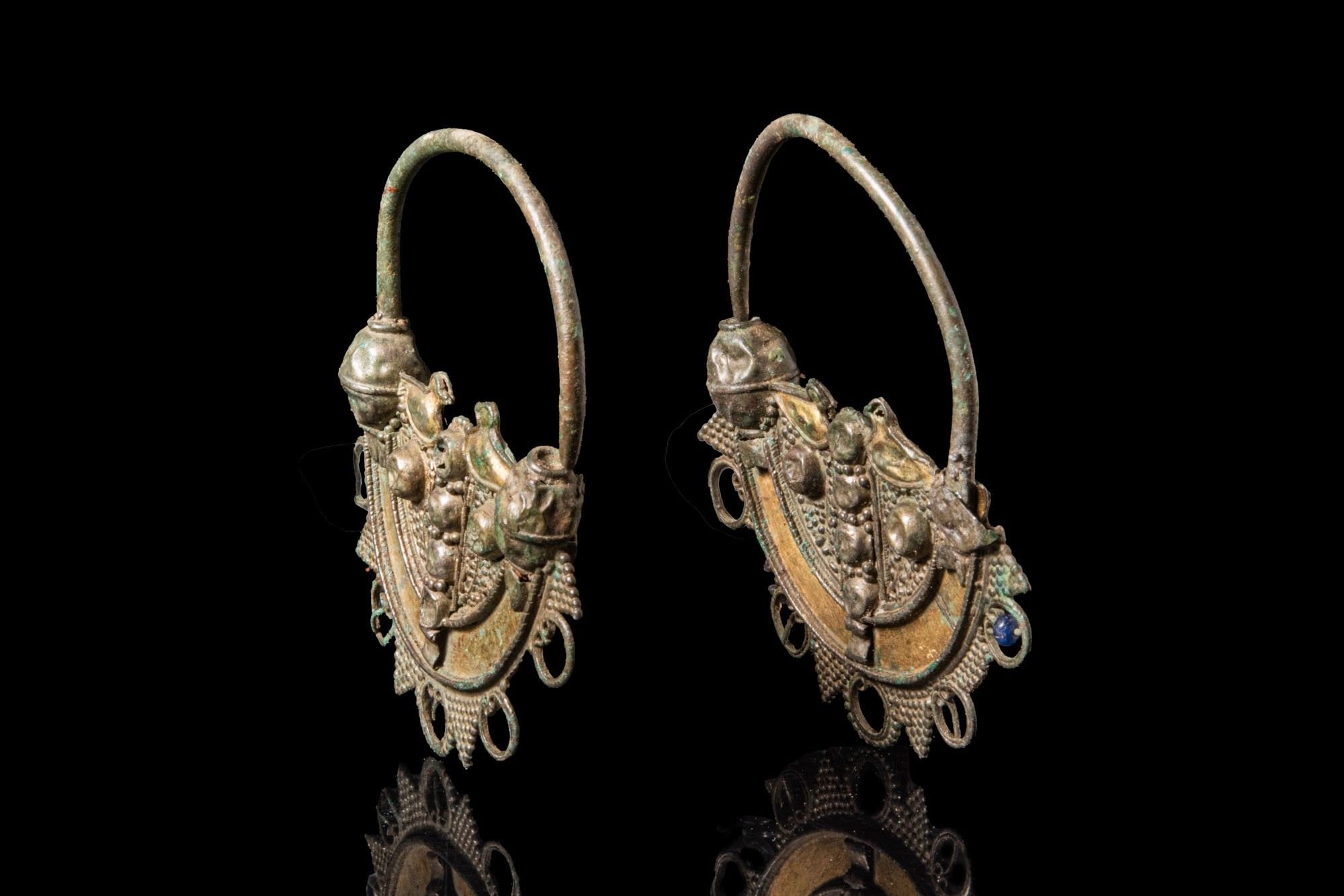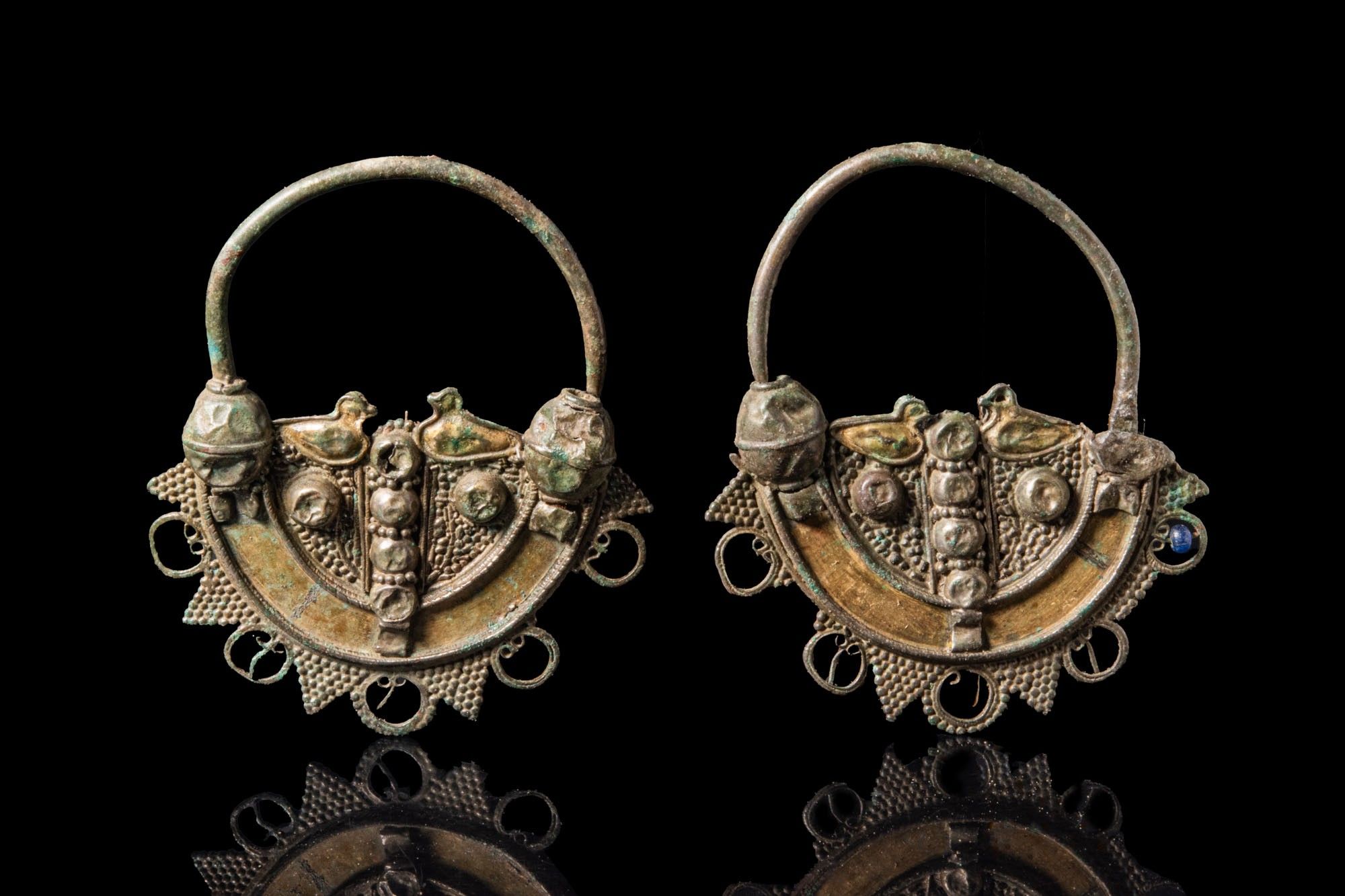 MATCHED PAIR OF BYZANTINE BRONZE OPENWORK EARRINGS WITH HOLY…
