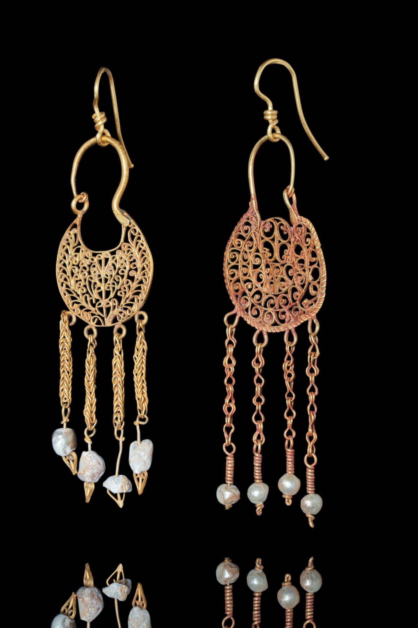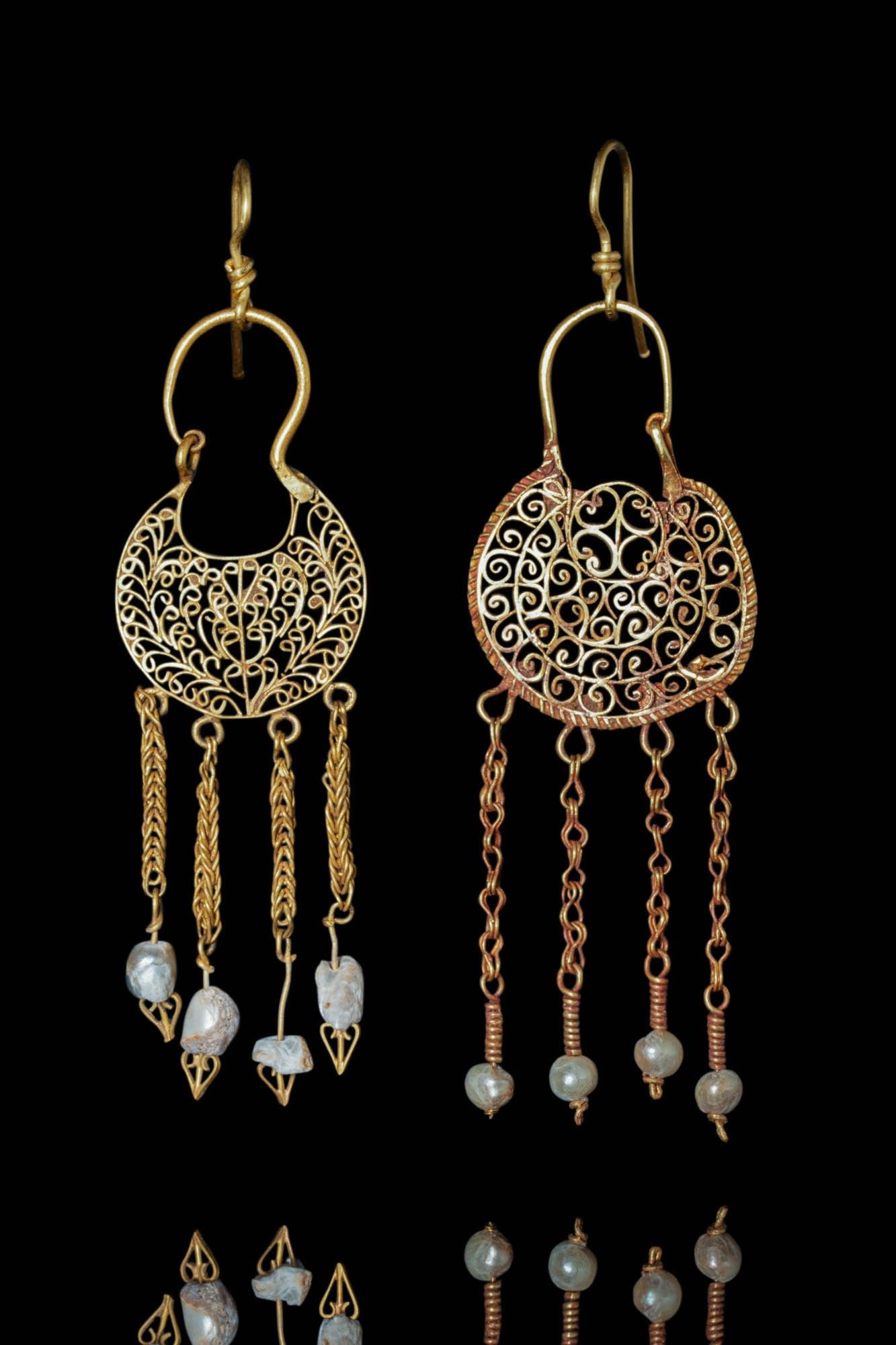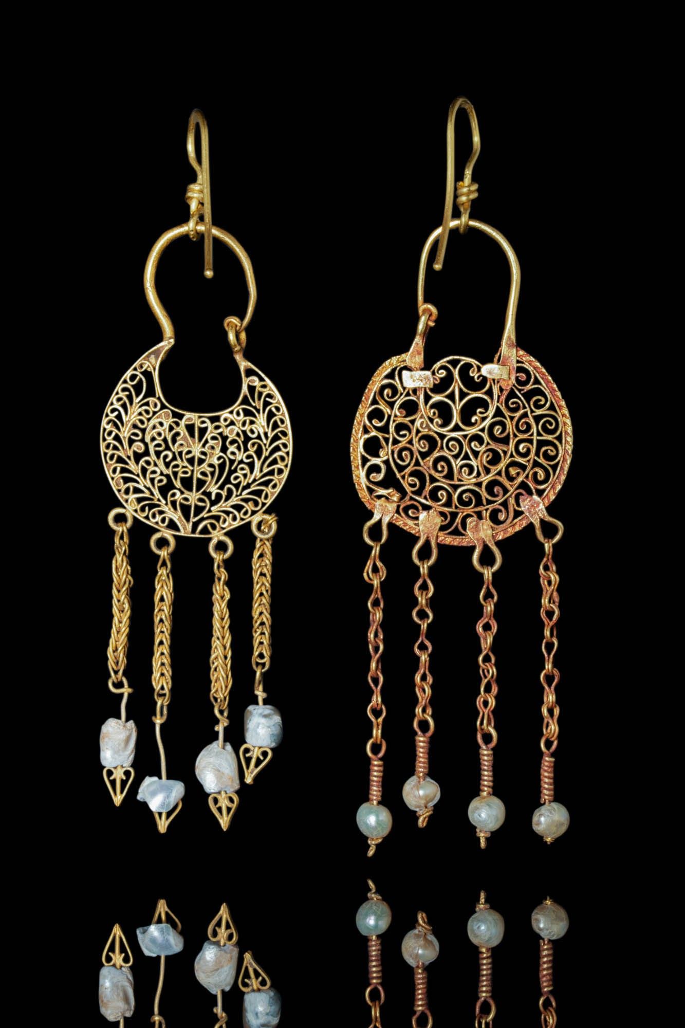 Ca. AD 500 - 600. A stunning set of gold Byzantine earrings. Each earring consists of a crescentic section featuring an openwork design and floral motif, framed with a gold wire. The earrings are further adorned with four chain pendants, each with pearls at the finials. The hook is joined to the concave edge, arching above and designed to hook into a loop at the other end. For similar see: Byzantium and the West: Jewelry in the First Millennium, no. 14. Size: 65-75mm x 20-25mm; Weight: 10g Provenance: Property of a London art gallery, acquired on the US art market; Ex. Private Collection, Connecticut, 1980s. This item has been cleared against the Art Loss Register database and comes with a confirmation letter.