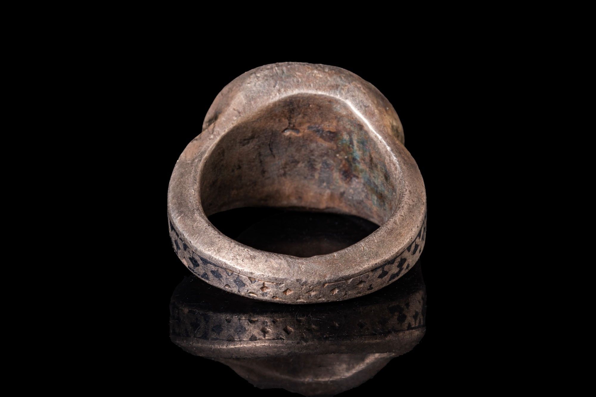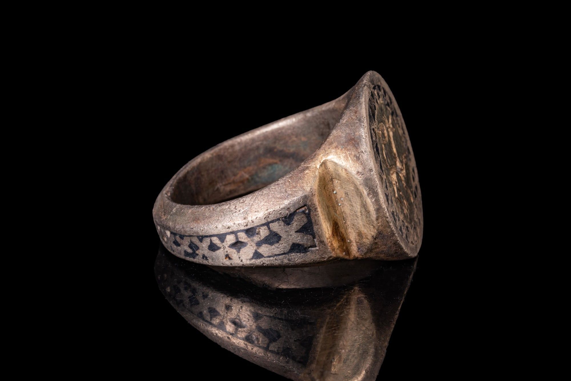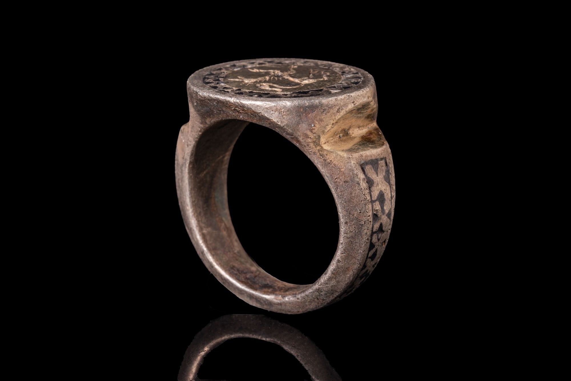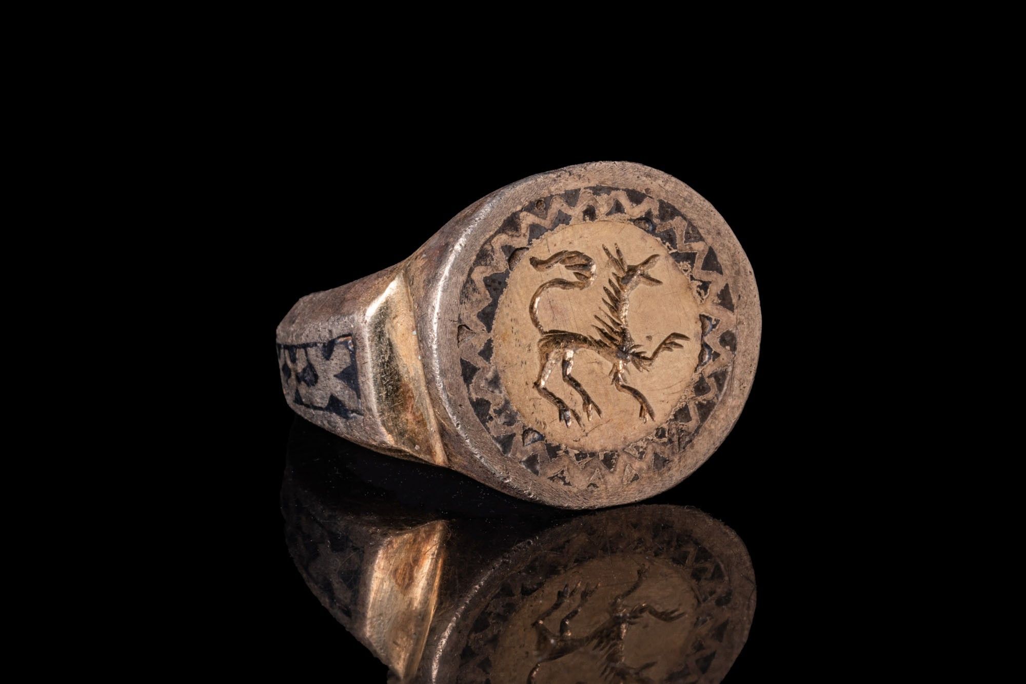 MEDIEVAL GOLD AND NIELLO RING WITH GRIFFIN. Ca. AD 1200 - 14…